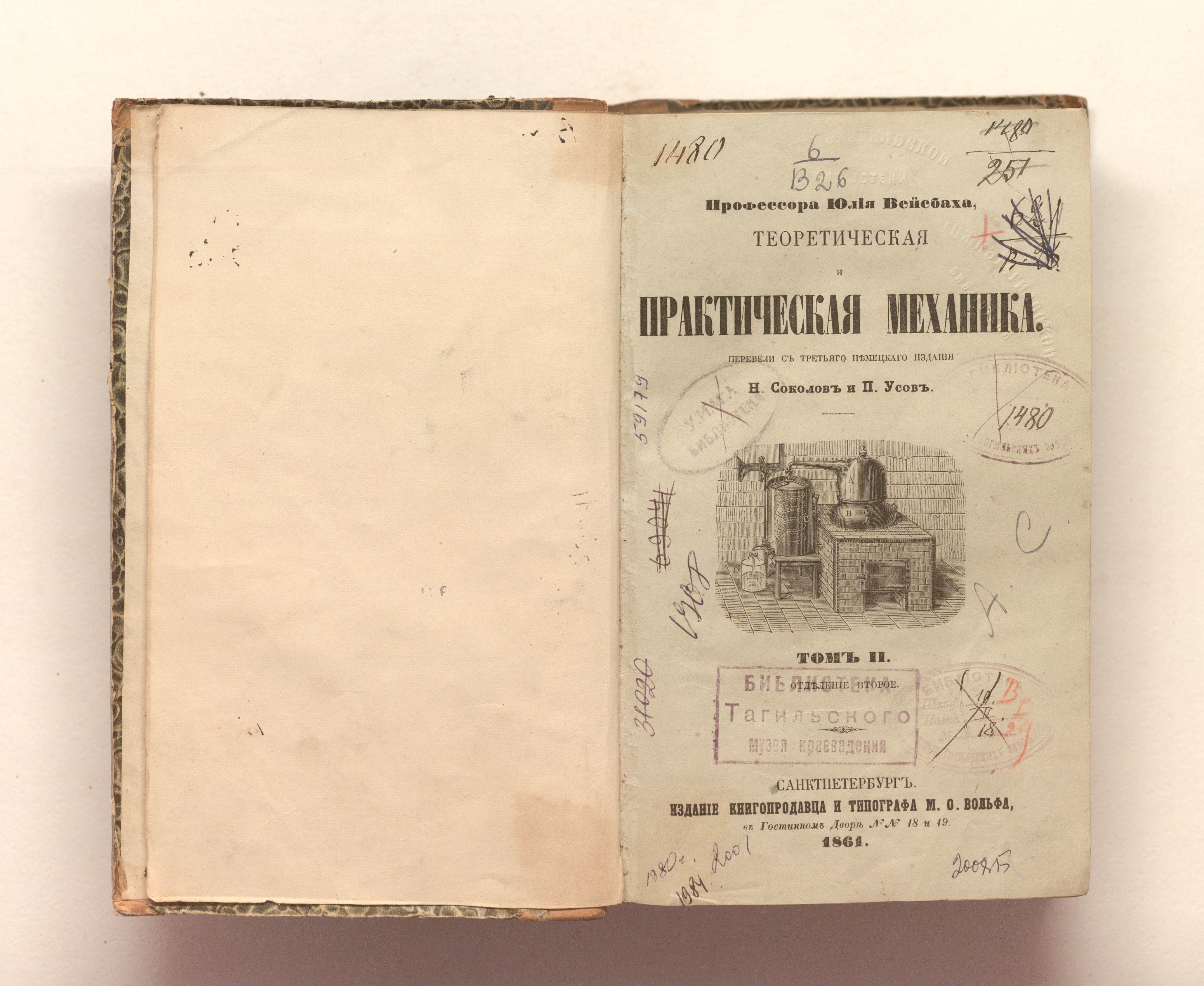 Теоретическая и практическая механика. Т. 2, Отд. 2. Приложение механики к приемникам / соч. профессора Юлия Вейсбаха. — Санкт-Петербург : издание М. О. Вольфа, 1861. — 769-1528, IX с. : ил. ; 22х14 см.