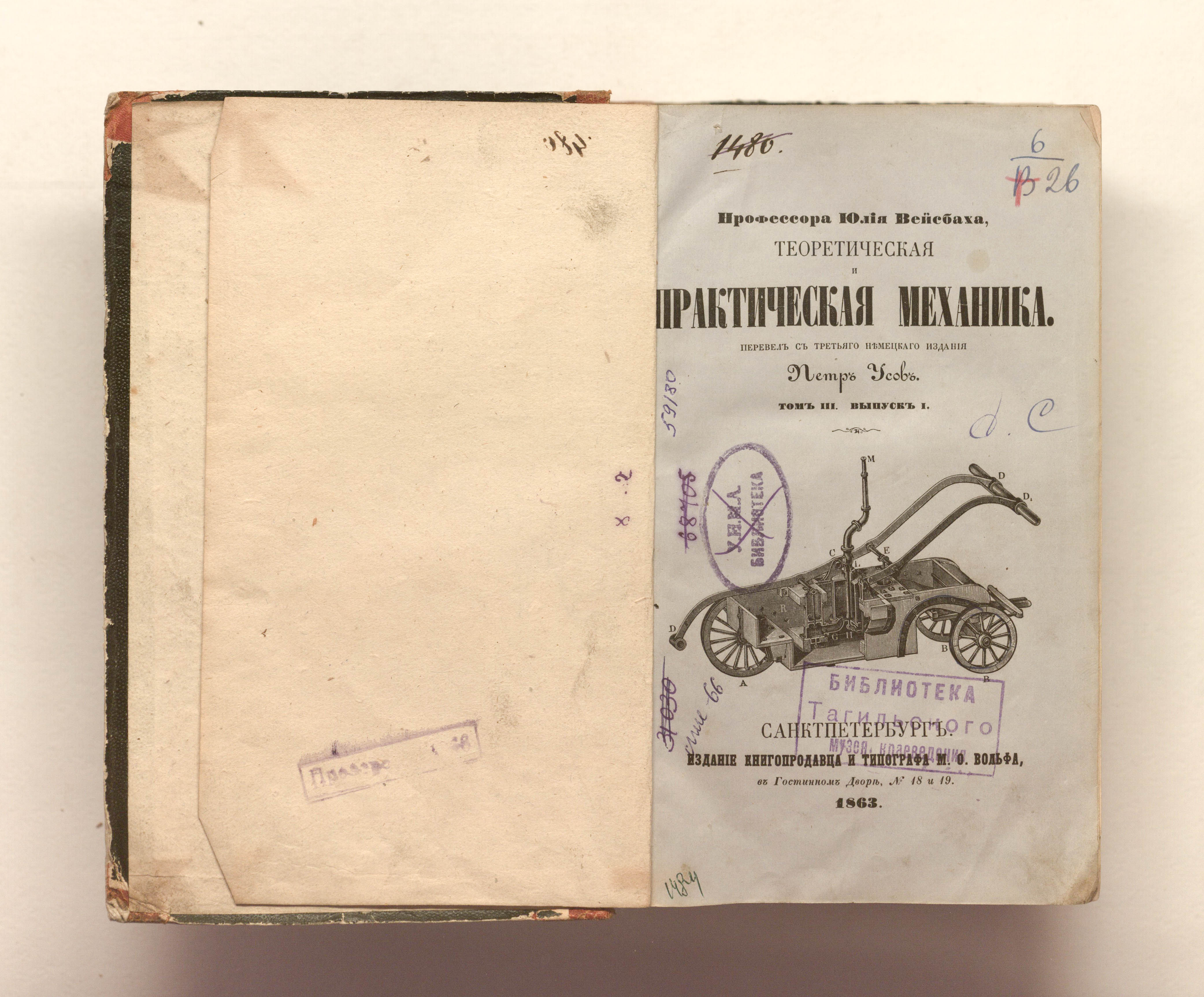 Теоретическая и практическая механика. Т. 3, Отд. 1. Механика приводов и рабочих механизмов / Ю. Вейсбах ; пер. с 3-го нем. изд. П. Усов. — Санкт-Петербург : издание М. О. Вольфа, 1863. — [6], 1-1114 с. : ил. ; 22х14 см.