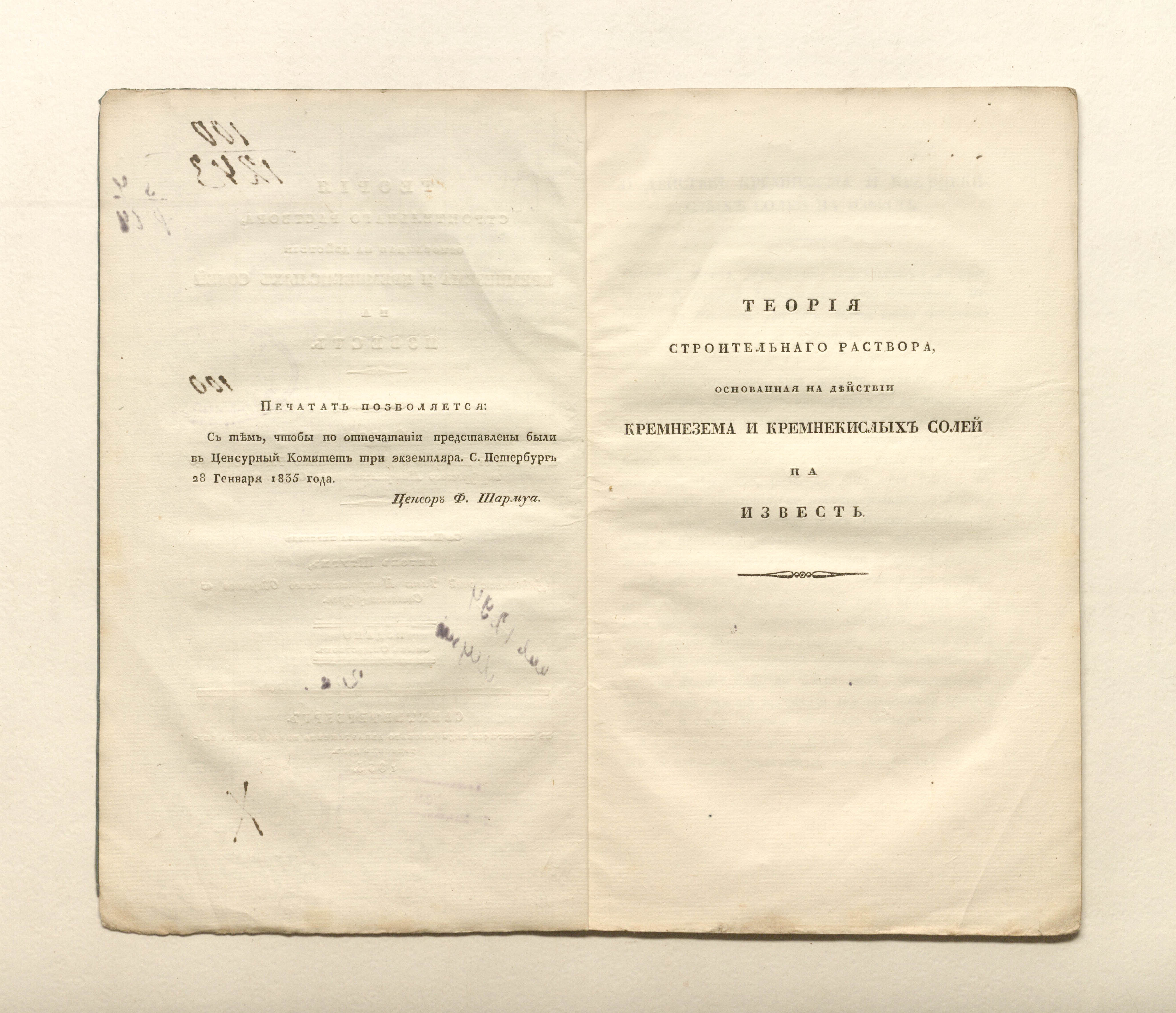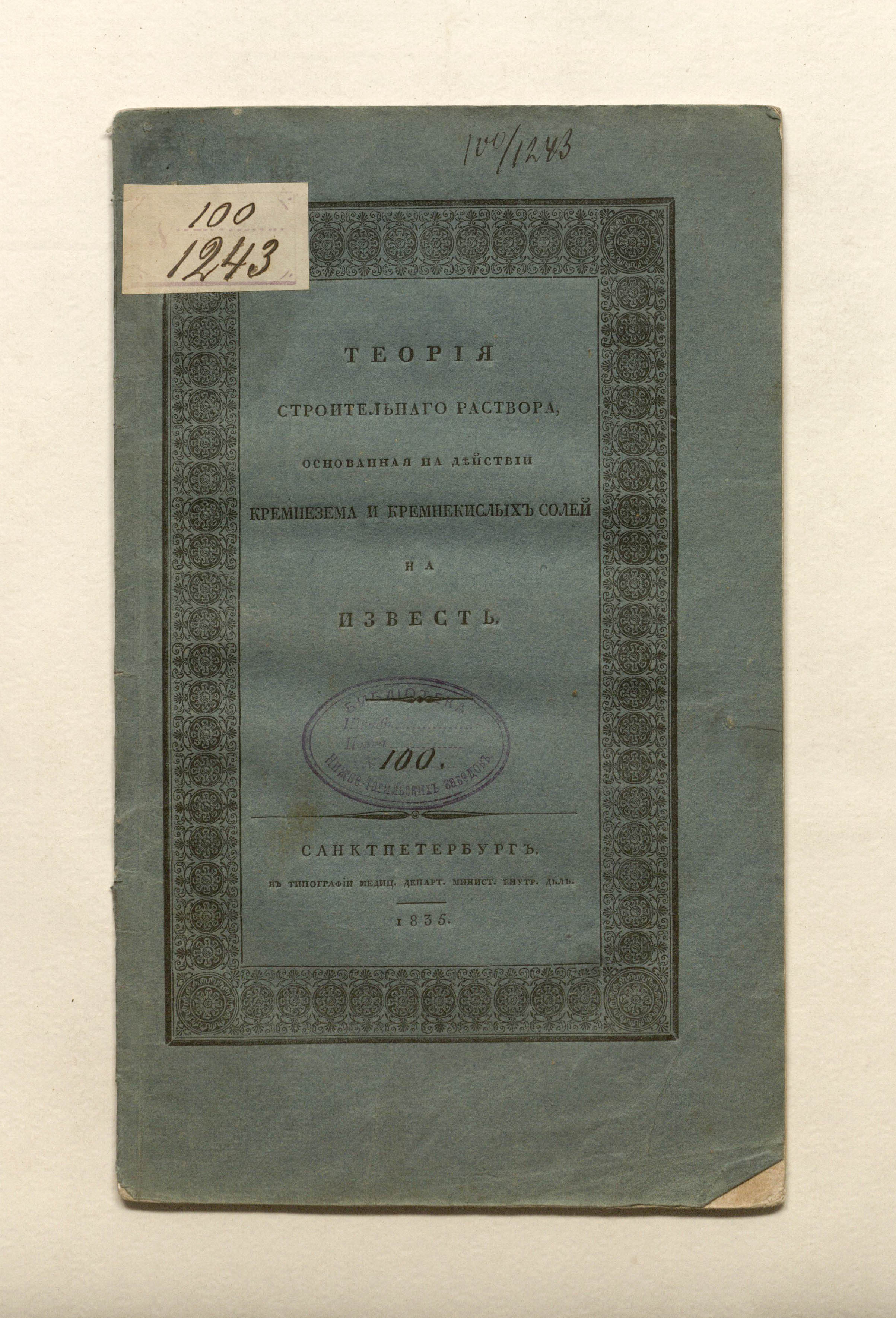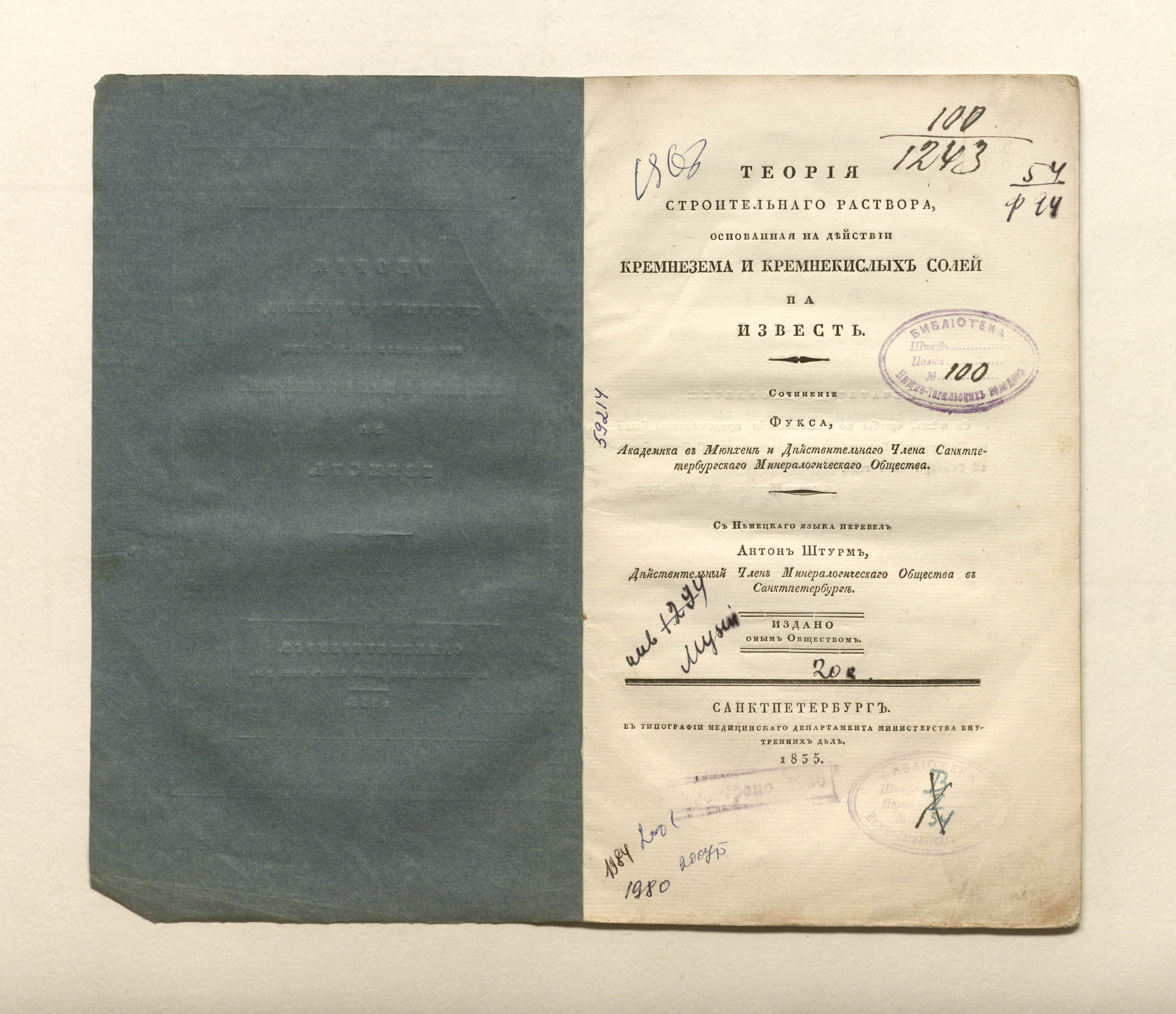 Теория строительного раствора, основанная на действии кремнезема и кремнекислых солей на известь / Соч. Фукса, акад. в Мюнхене, и д. чл. Санктпетерб. минерал. о-ва; С нем. яз. пер. Антон Штурм, д. чл. Минерал. о-ва в Санктпетербурге. — Санкт-Петербург : тип. медицинского департамента министерства внутренних дел, 1835. — [4], 18 с. ; 24,4х15 см.