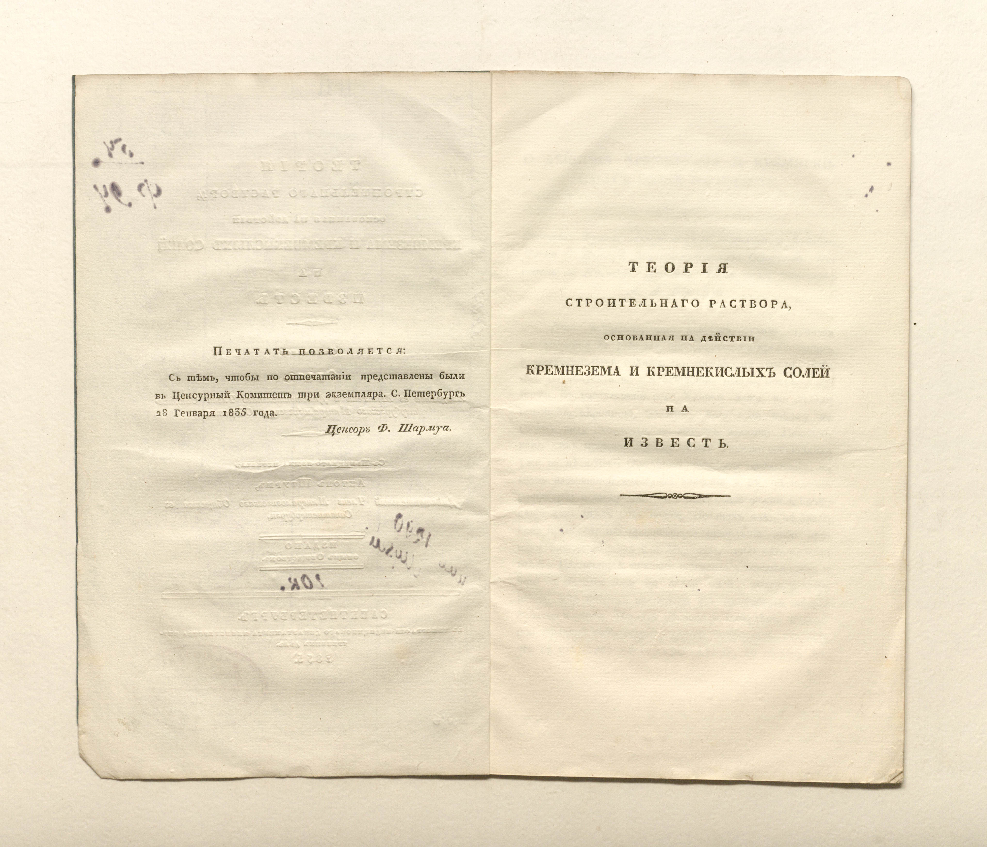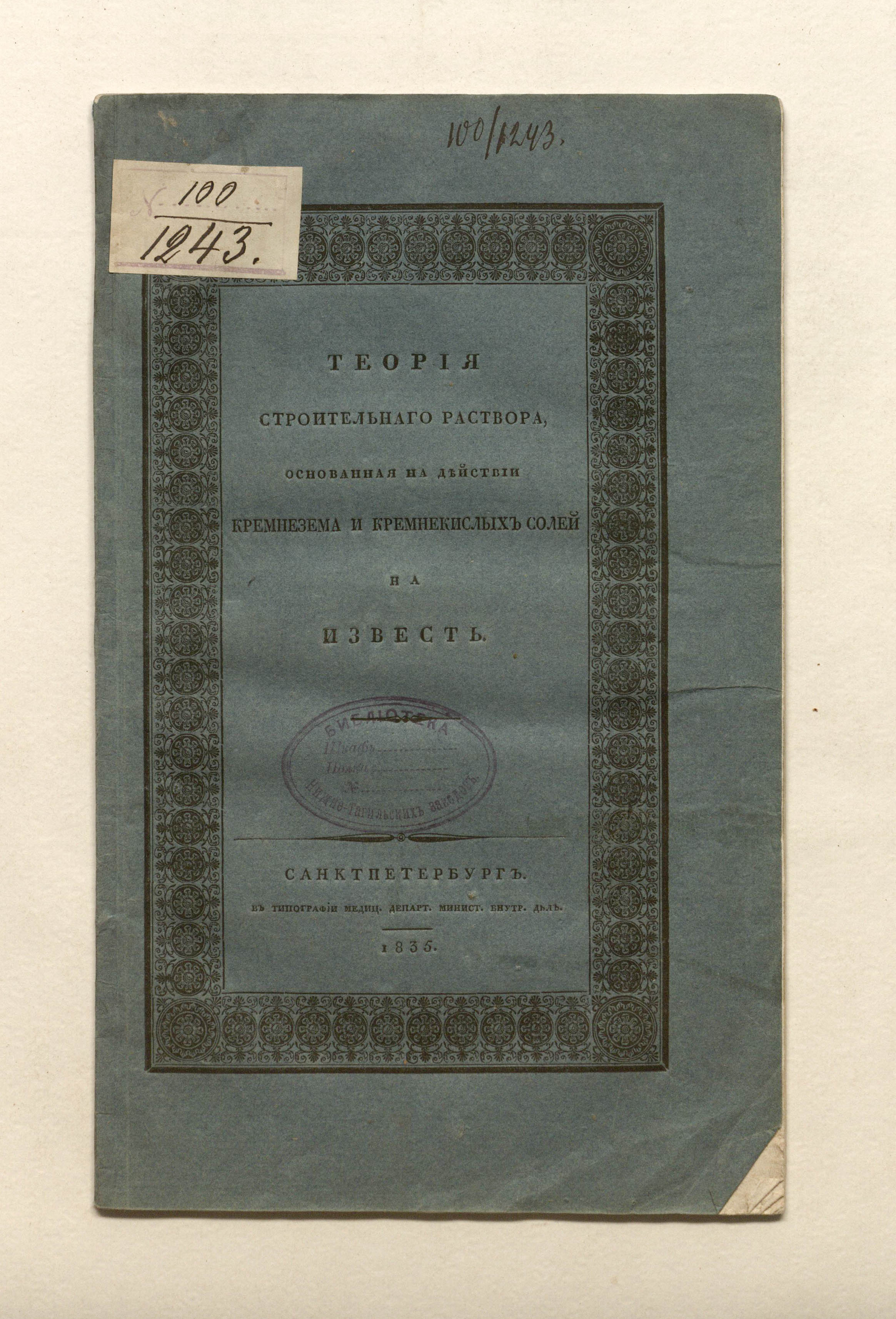 Теория строительного раствора, основанная на действии кремнезема и кремнекислых солей на известь / Соч. Фукса, акад. в Мюнхене, и д. чл. Санктпетерб. минерал. о-ва; С нем. яз. пер. Антон Штурм, д. чл. Минерал. о-ва в Санктпетербурге. — Санкт-Петербург : тип. медицинского департамента министерства внутренних дел, 1835. — [4], 18 с. ; 24,4х15 см.