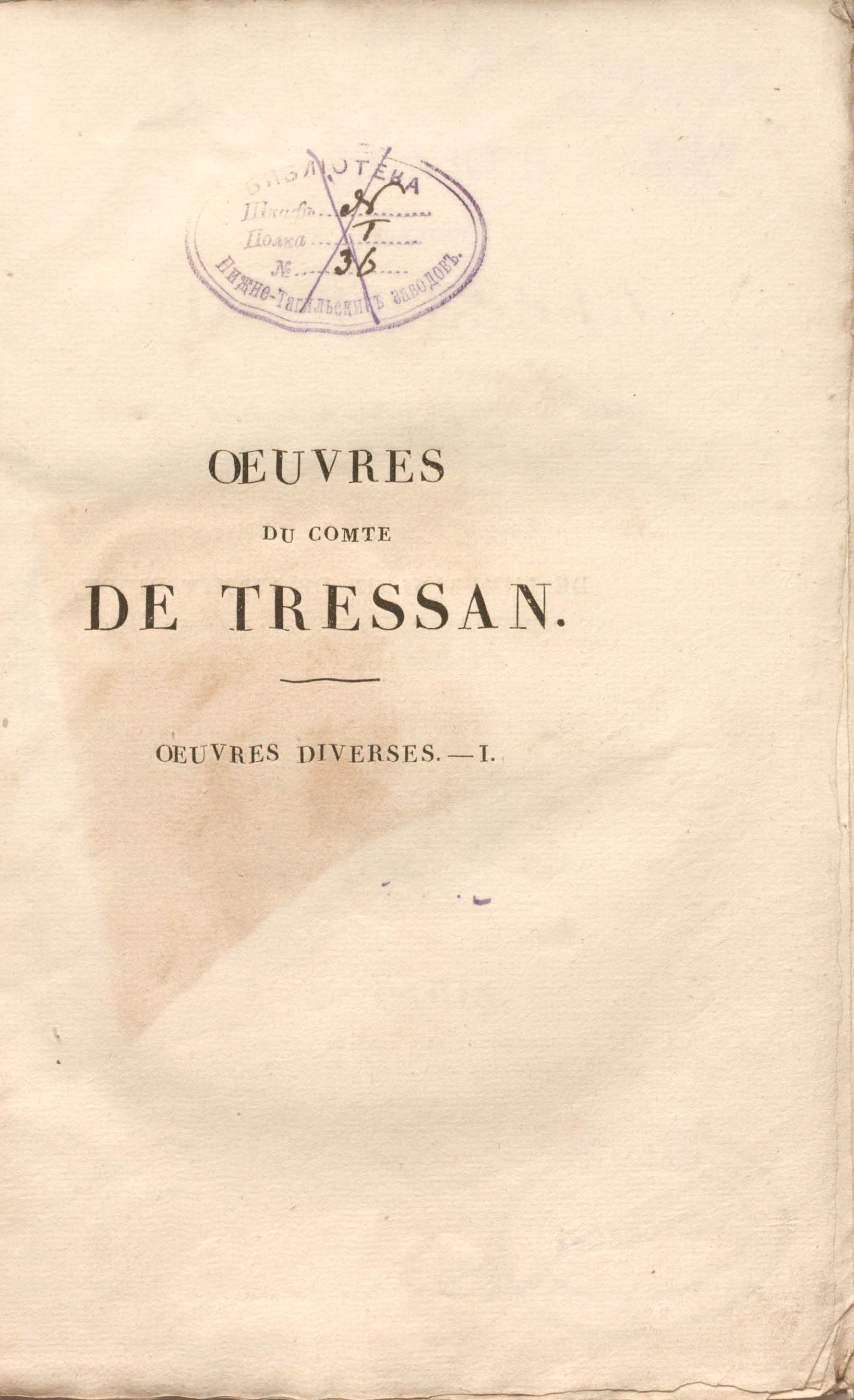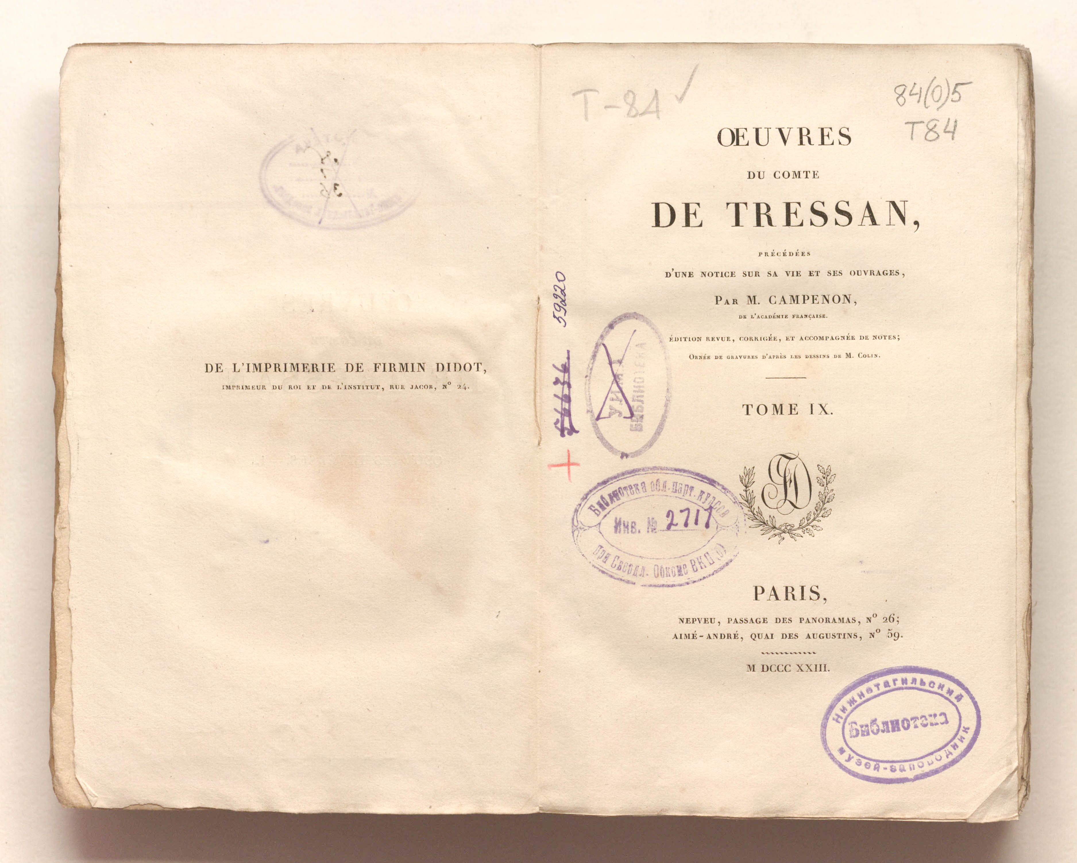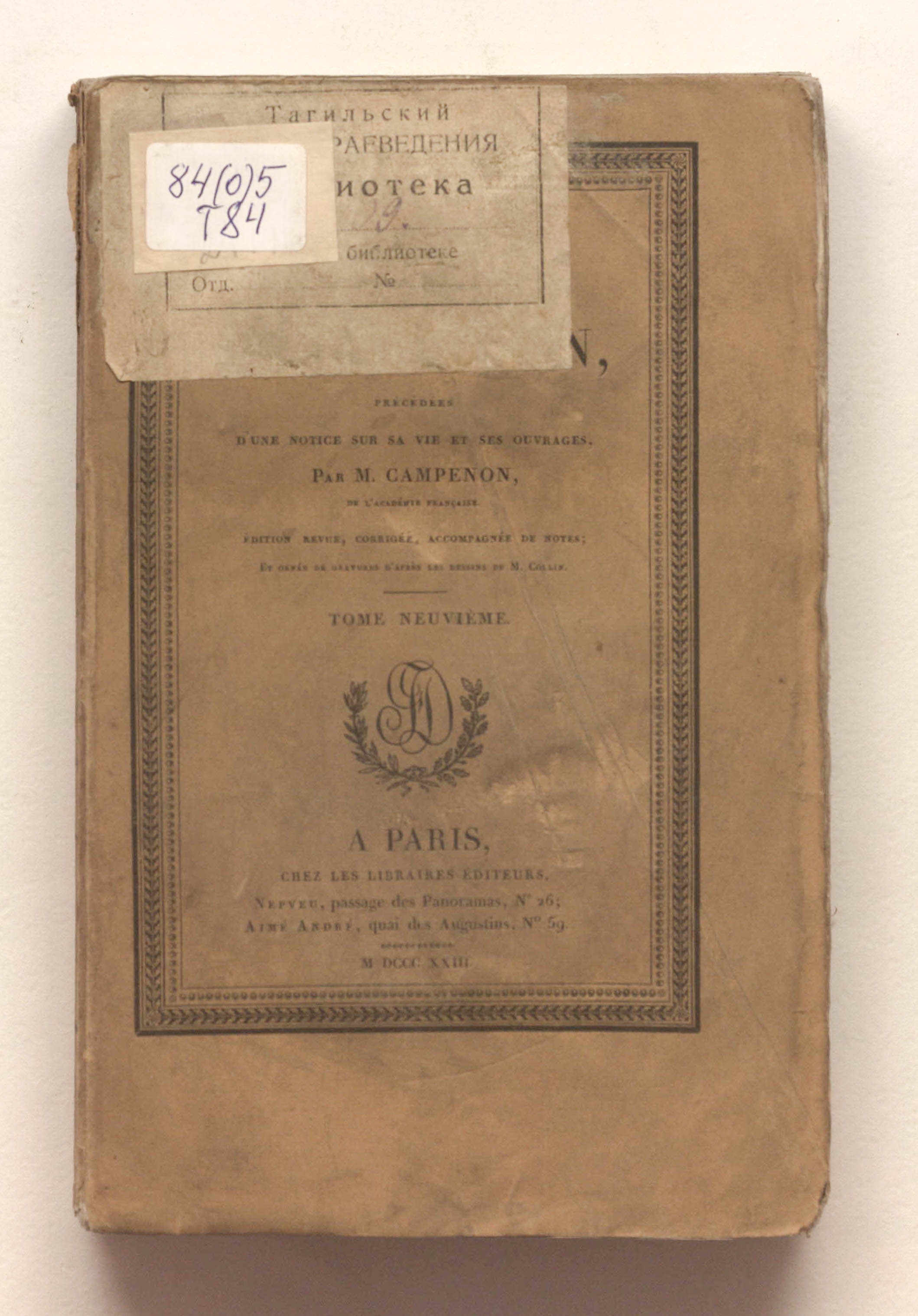 Сочинения графа Трессана, предварённые запиской о его жизни и творчестве, написанной М. Кампеноном, членом Французской академии. Переработанное, исправленное издание с примечаниями, украшенное гравюрами по рисункам М. Колена. – 10 т. – Т. 9. – Париж : Непвё; Эме-Андре, 1823. – 463 с. ; 14х22 см.