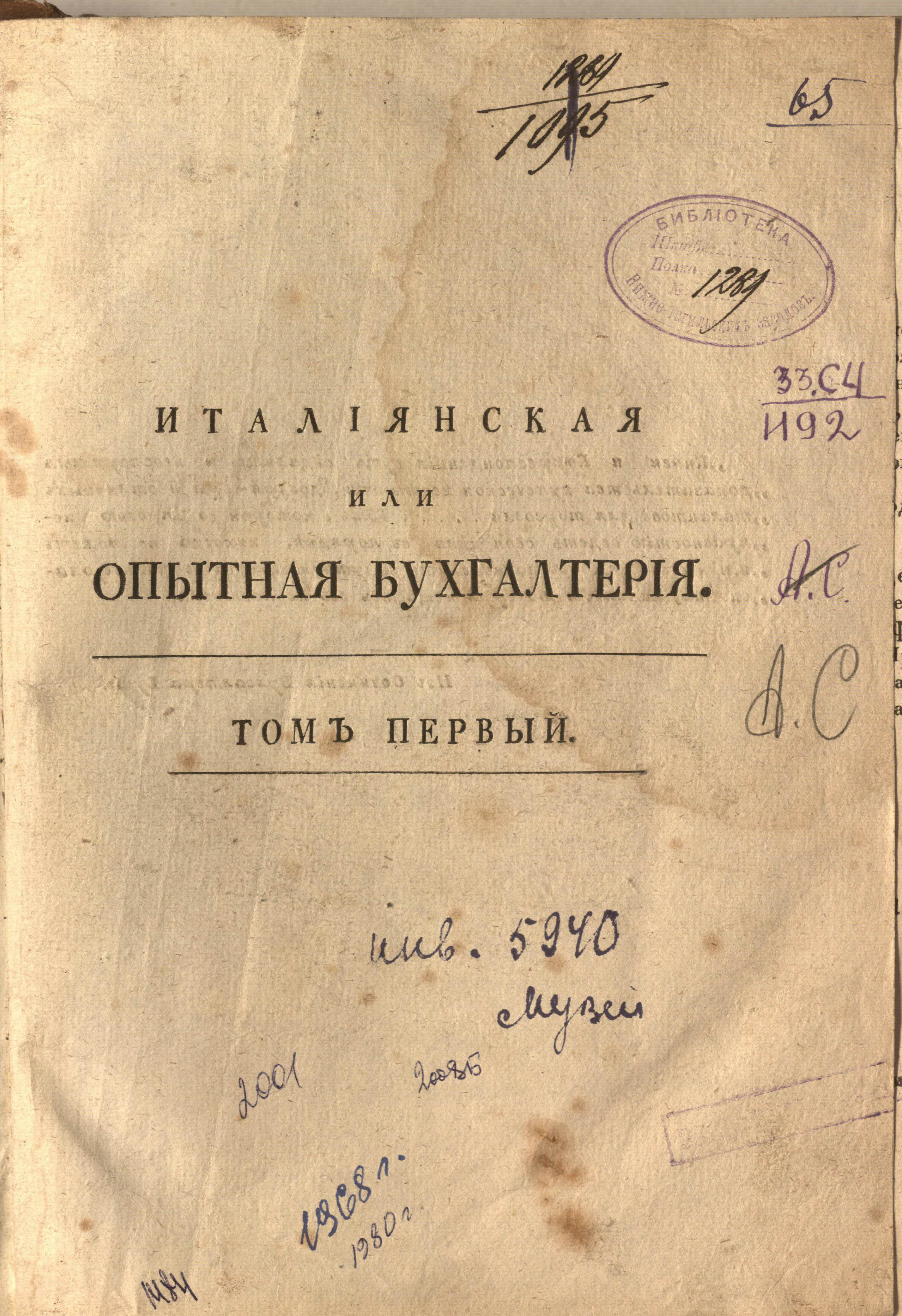Италиянская или опытная бухгалтерия : содержащая: простую и двойную или италиянскую бухгалтерию; объяснение: коммерческих, технических терминов, по алфавитному порядку; слог употребительный в купеческих письмах; с наставлениями и формами: фактуры, приказы, коммиссии, тратты, риммессы, векселя, росписки, ассигнации, надписи, кладныя, конноссементы, страховыя контракты, сертепартии и счеты морской торговли. Всех четырех частей света, славнейших торговлею городов: стран и областей: со сравнениями в одиннадцати таблицах: счетныя деньги и их превращение; действительныя ходячия: золотыя, серебренныя и медныя монеты; торговой и аптекарьской вес; аршинныя, футовыя и поземельныя меры; сухия и жидкия тела; знатнейшия ярмарки; вексельные переводы; узанции, грации, и все то , что касается до управления мелочною, гуртовою, внутренною и чужестранною торговлею.