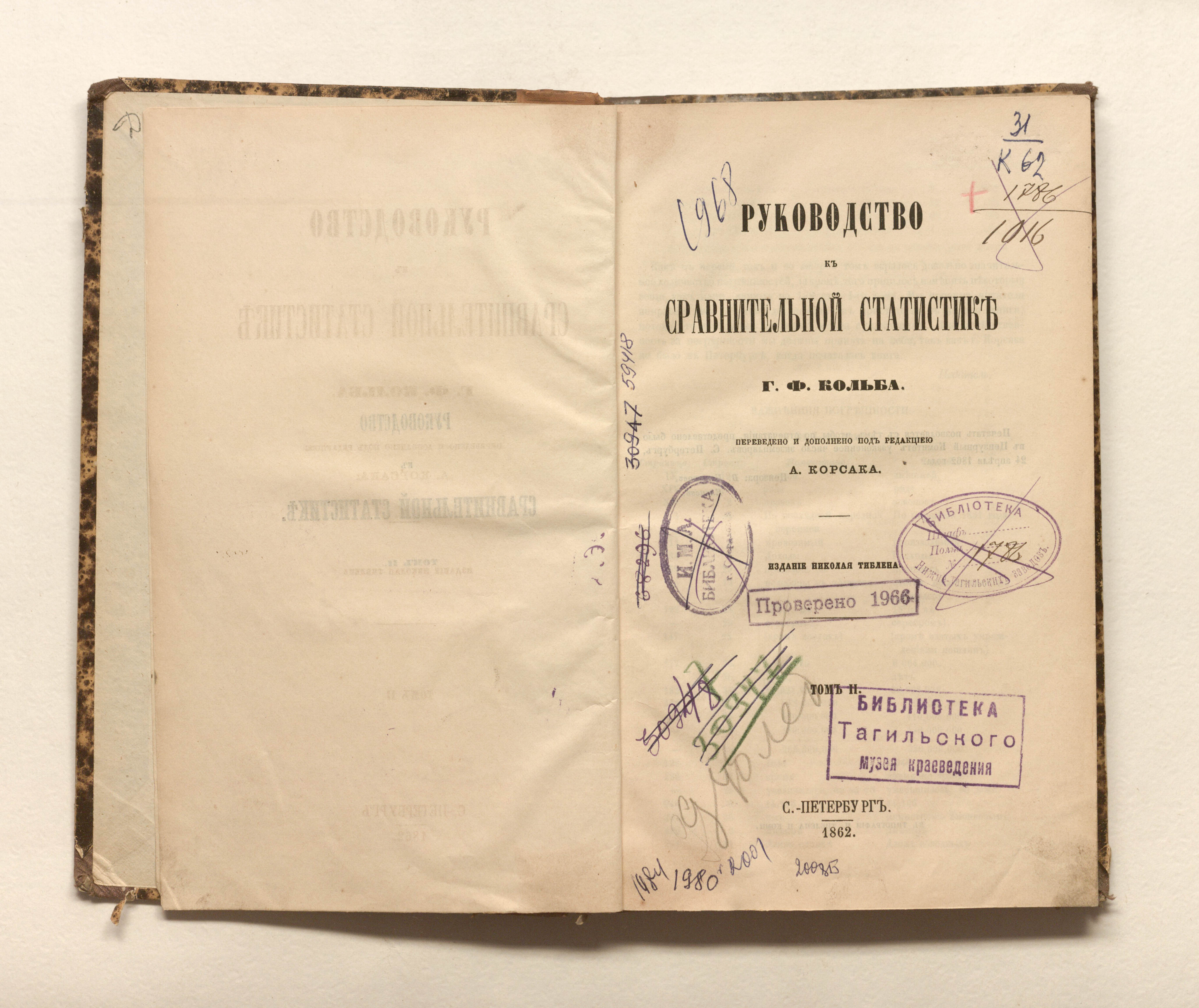 Руководство к сравнительной статистике Г.Ф. Кольба. Т. 2 / переведено и дополнено под ред. А. Корсака. — Санкт-Петербург : издание Николая Тиблена, 1862. — [12], 314 с. ; 2315 см.