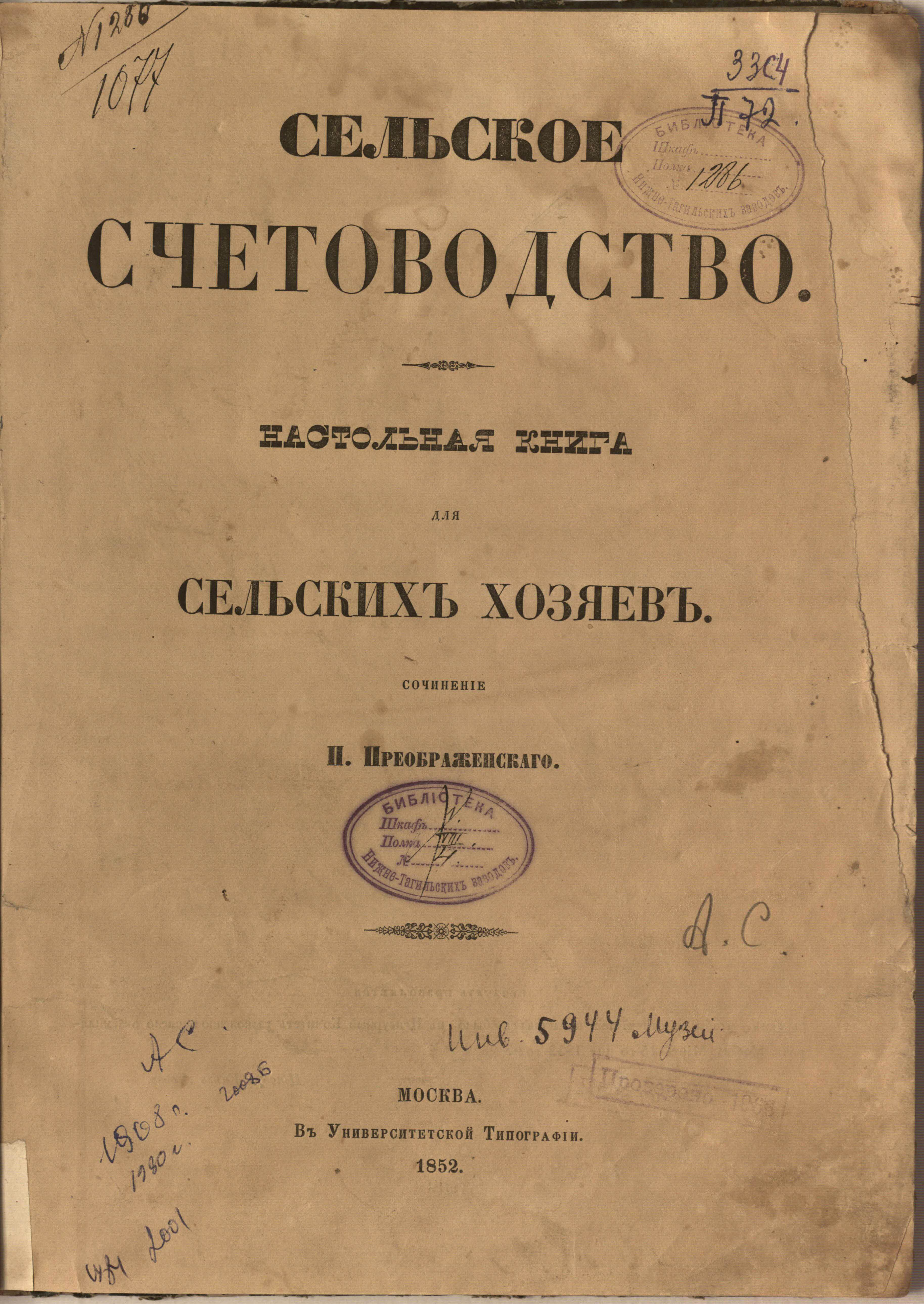 Сельское счетоводство : настольная книга для сельских хозяев / соч. П. Преображенского. — Москва : в Университетской типографии, 1852. — 160 с. ; 32х23 см.