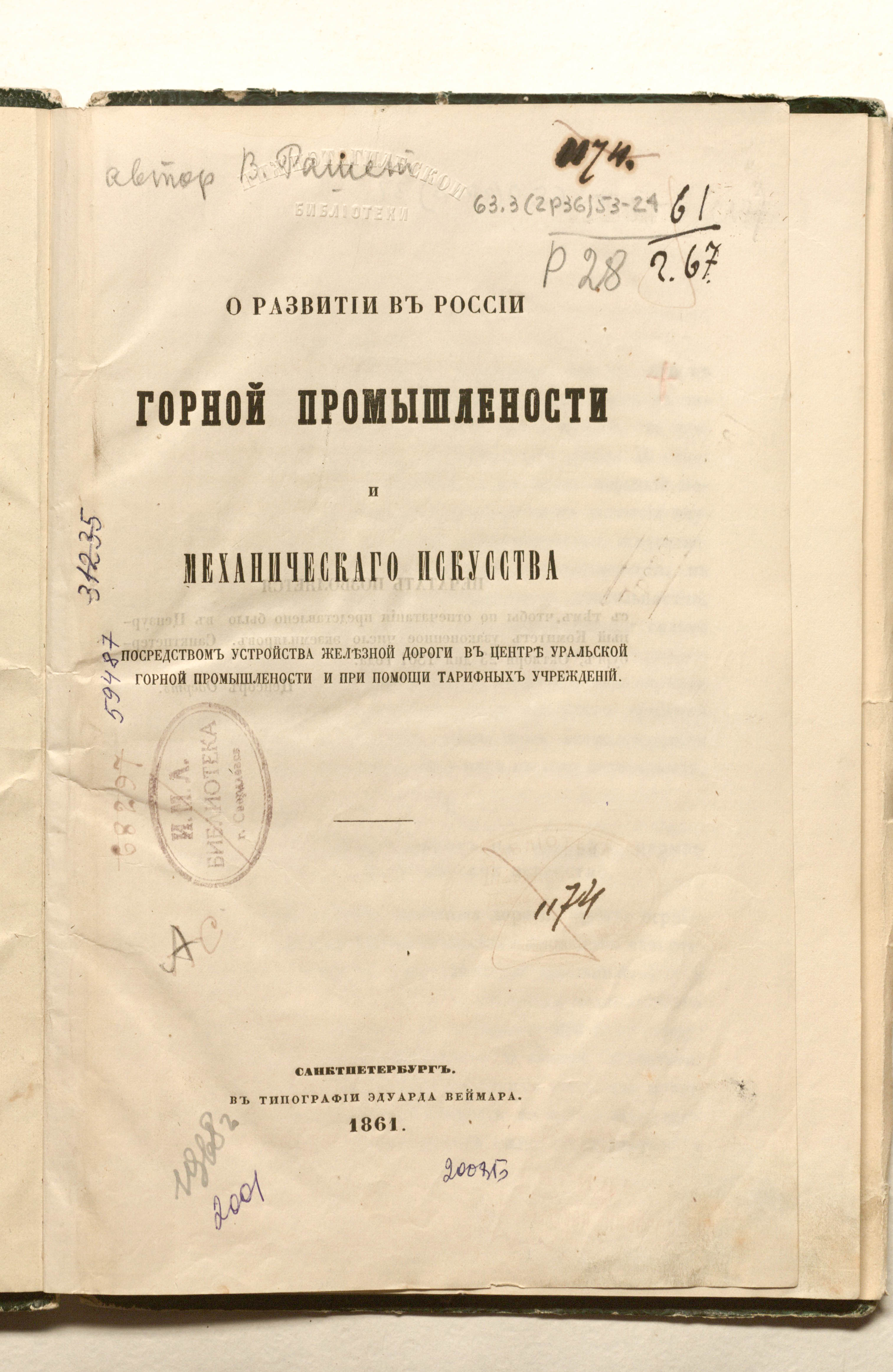 О развитии в России горной промышленности и механического искусства посредством устройства железной дороги в центре уральской горной промышленности и при помощи тарифных учреждений / [Владимир Рашет]. — 2-е изд. — Санкт-Петербург : тип. Э. Веймара, 1861. — 40 с. : 1 л. карт. ; 26х17 см.