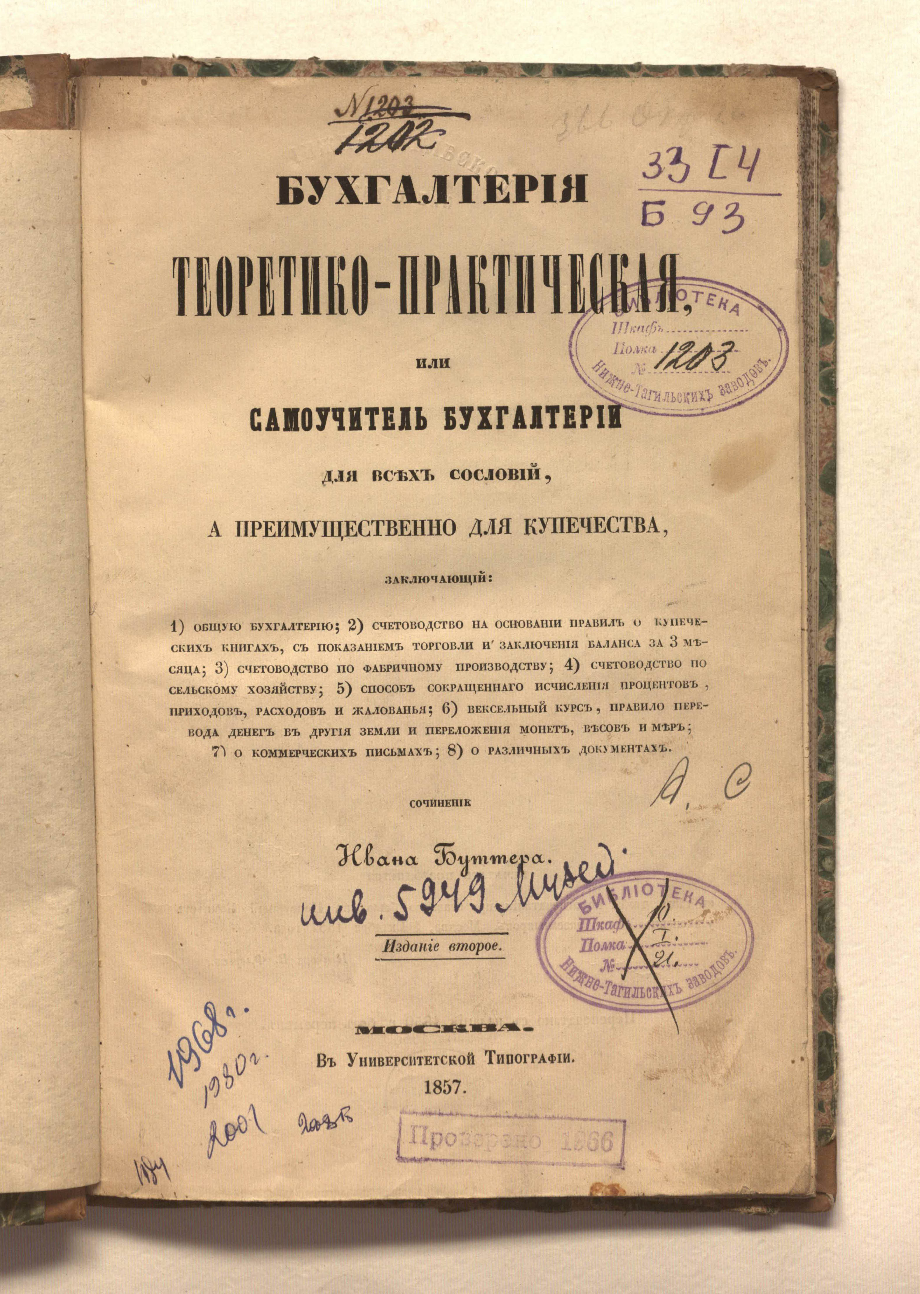 Бухгалтерия теоретико-практическая или Самоучитель бухгалтерии для всех сословий, а преимущественно для купечества / соч. Ивана Буттера. — 2-е изд. — Москва : в университетской типографии, 1857. — 99, III с. : 2 л. табл. ; 24,5х16 см.