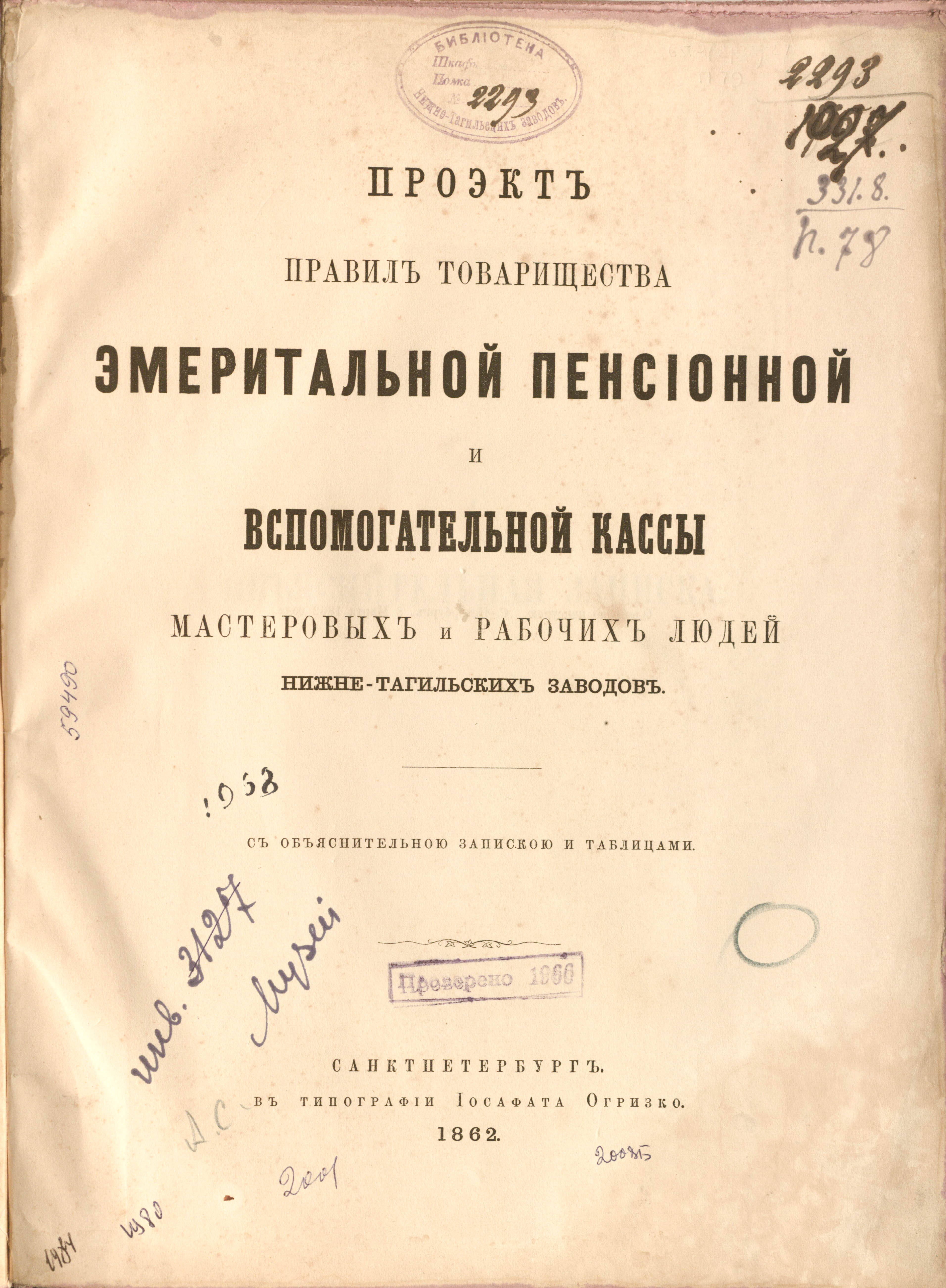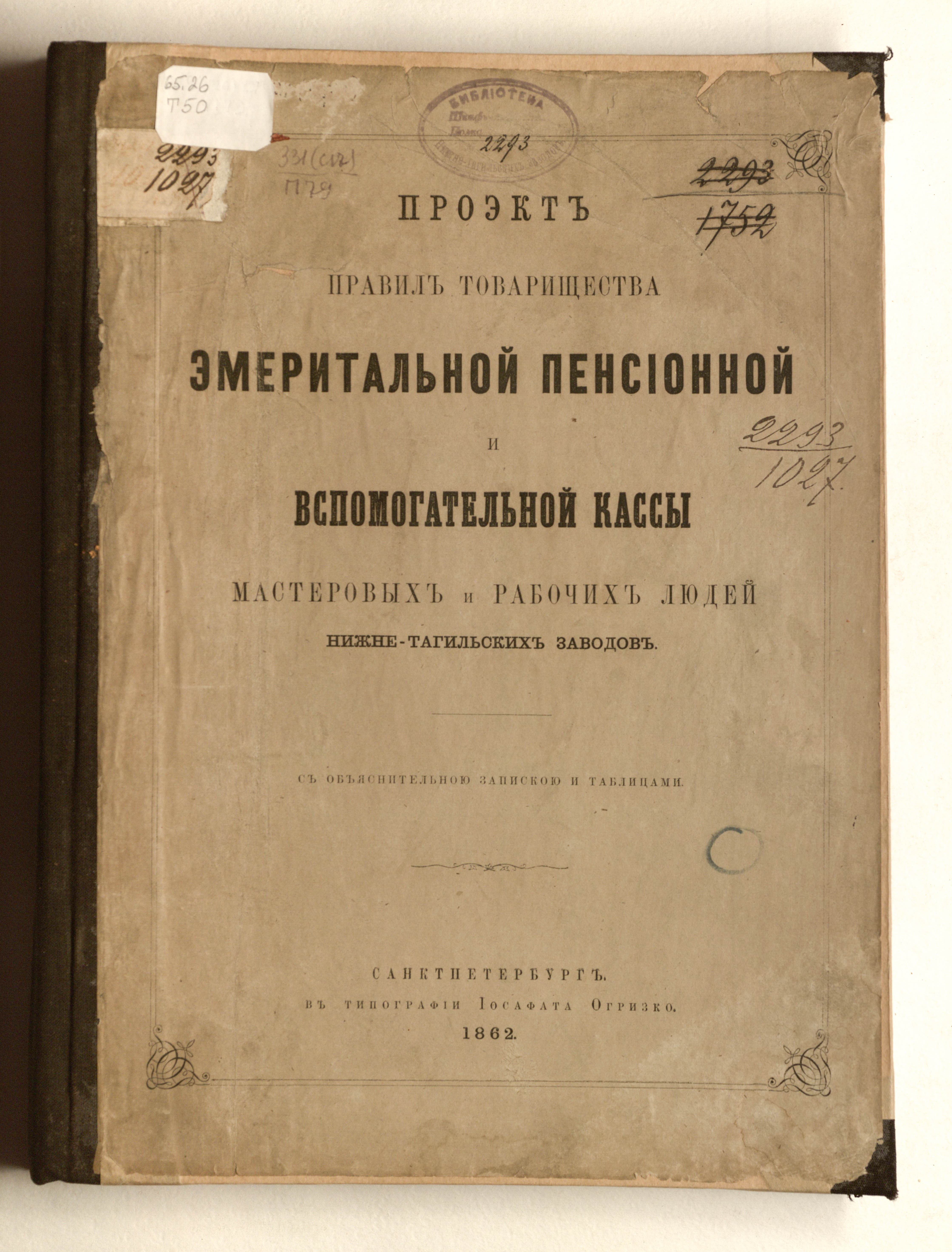 Проэкт правил товарищества эмертальной пенсионной вспомогательной кассы мастеровых и рабочих людей Нижне-Тагильских заводов : с объяснительною запискою и таблицами / Товарищество эмеритальной пенсионной и вспомогательной кассы мастеровых и рабочих людей Нижнетагильских заводов ; сост. П. Н. Шиленков. — Санкт-Петербург : в типографии Иосафата Огризко, 1862. — [2], 210 с. ; 32х25 см.