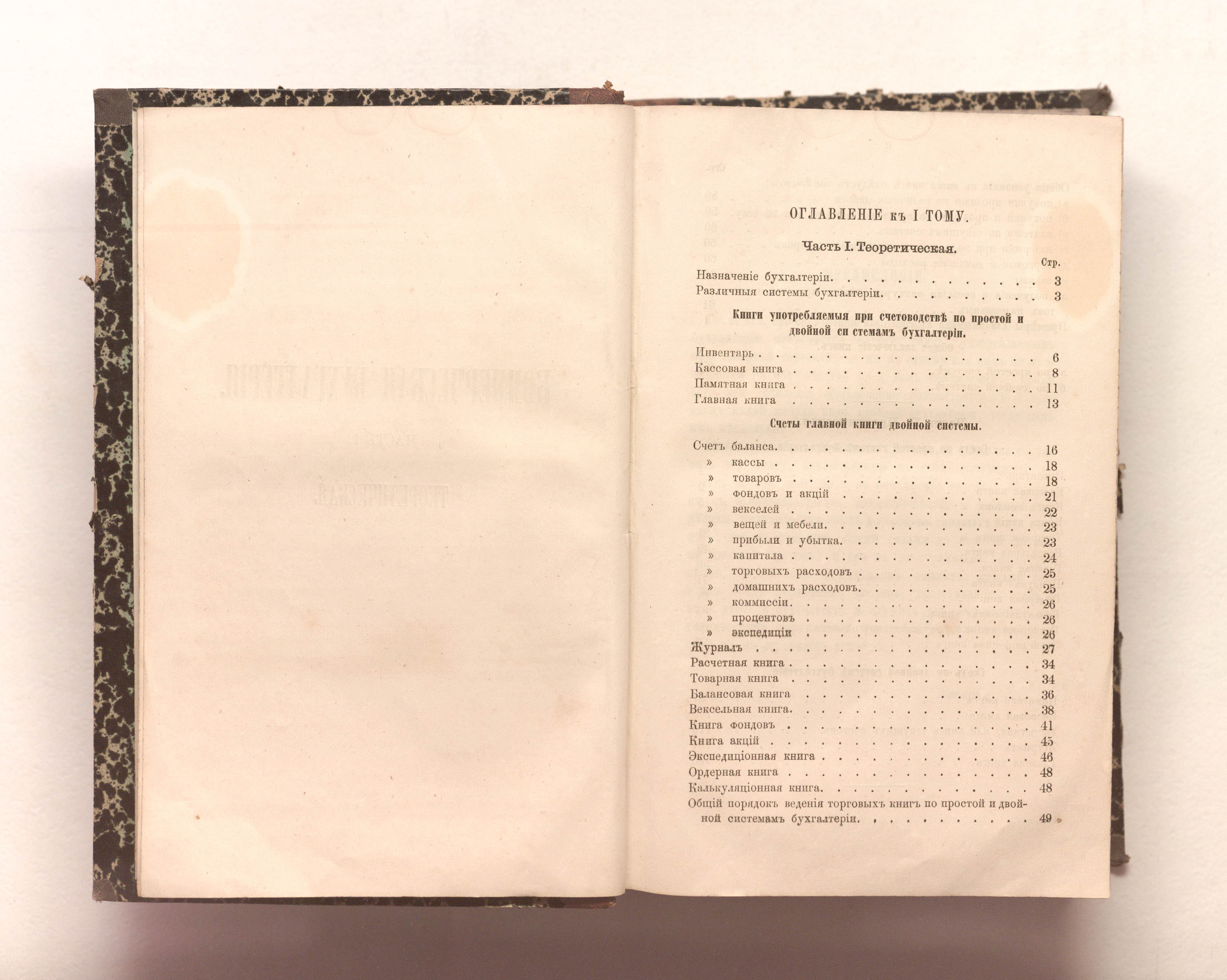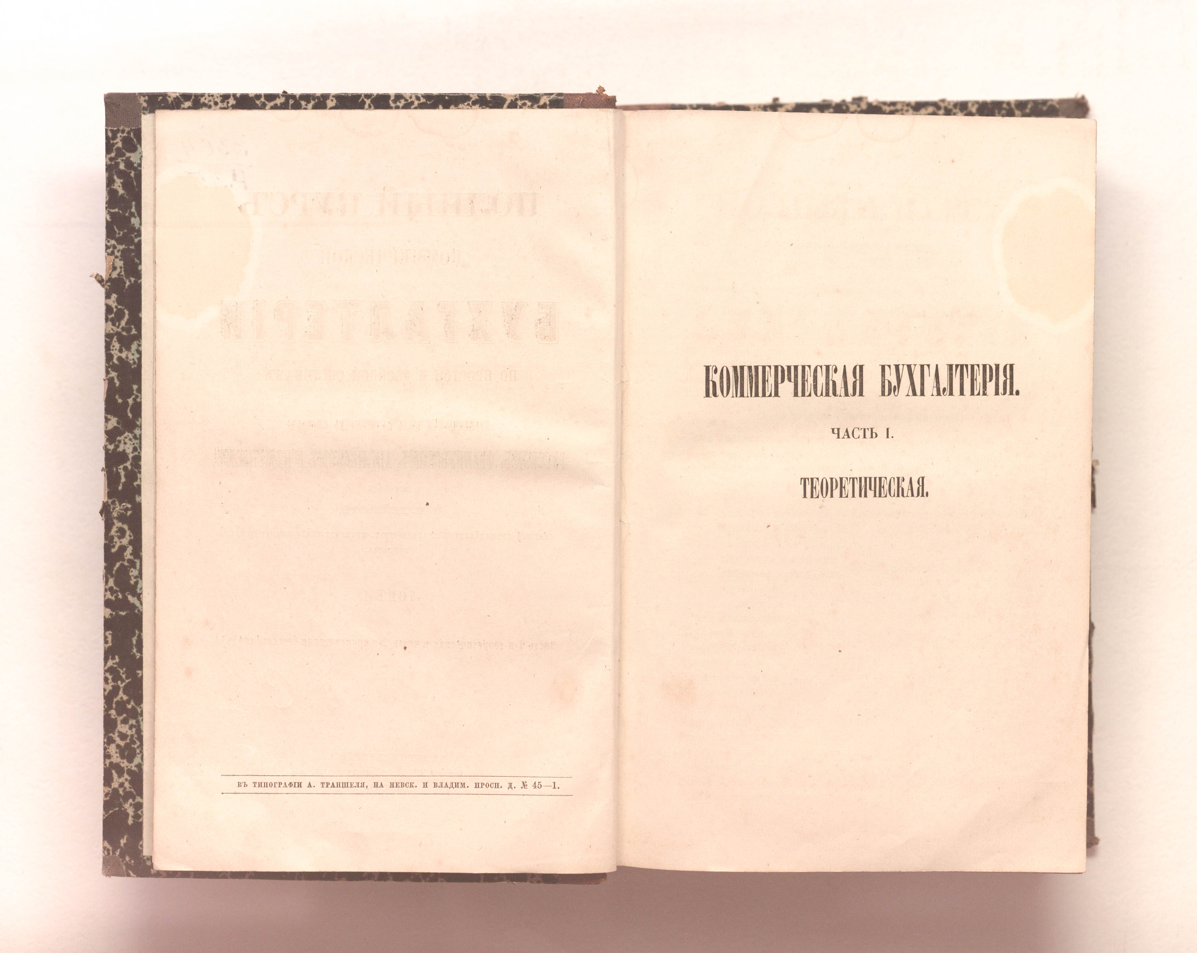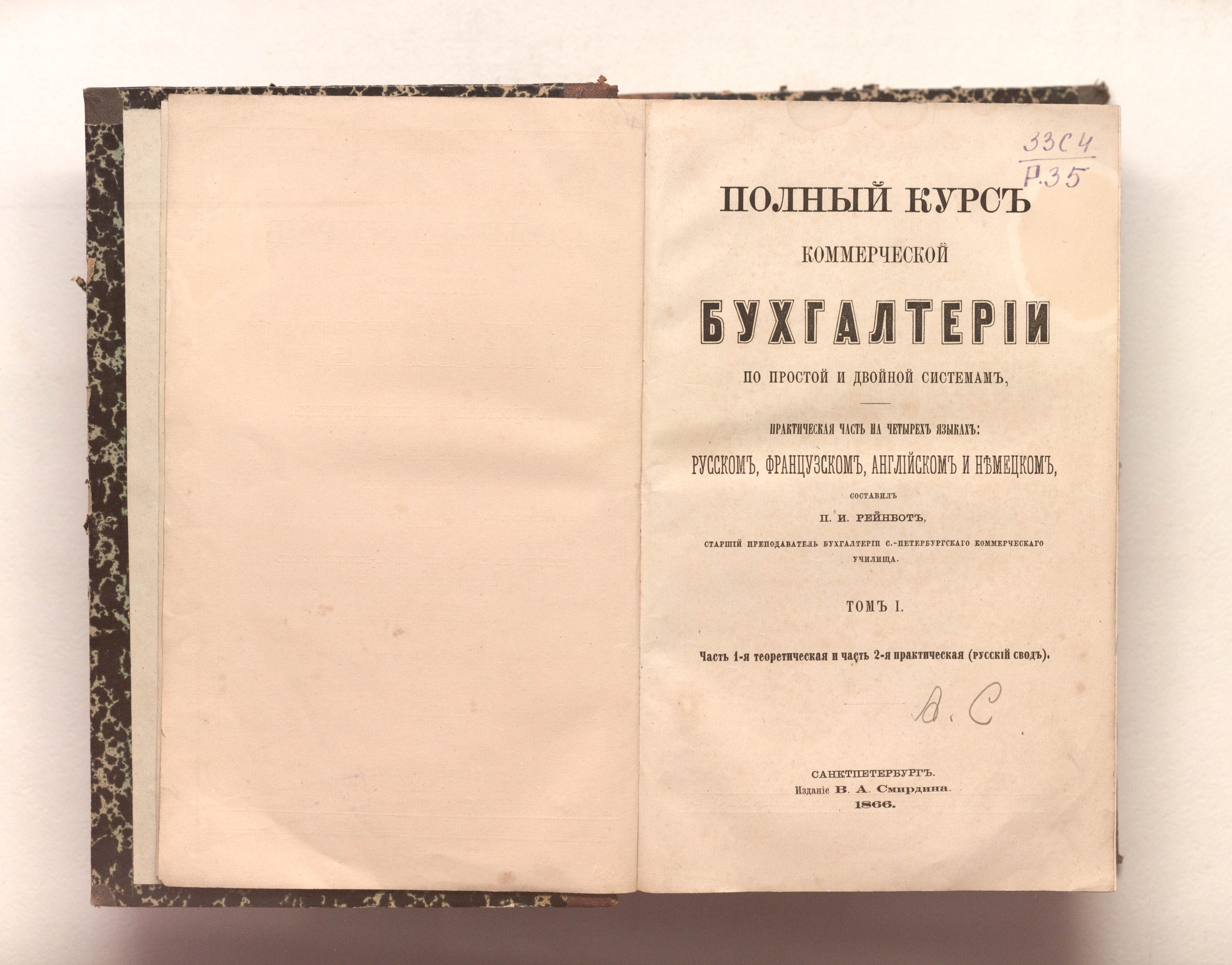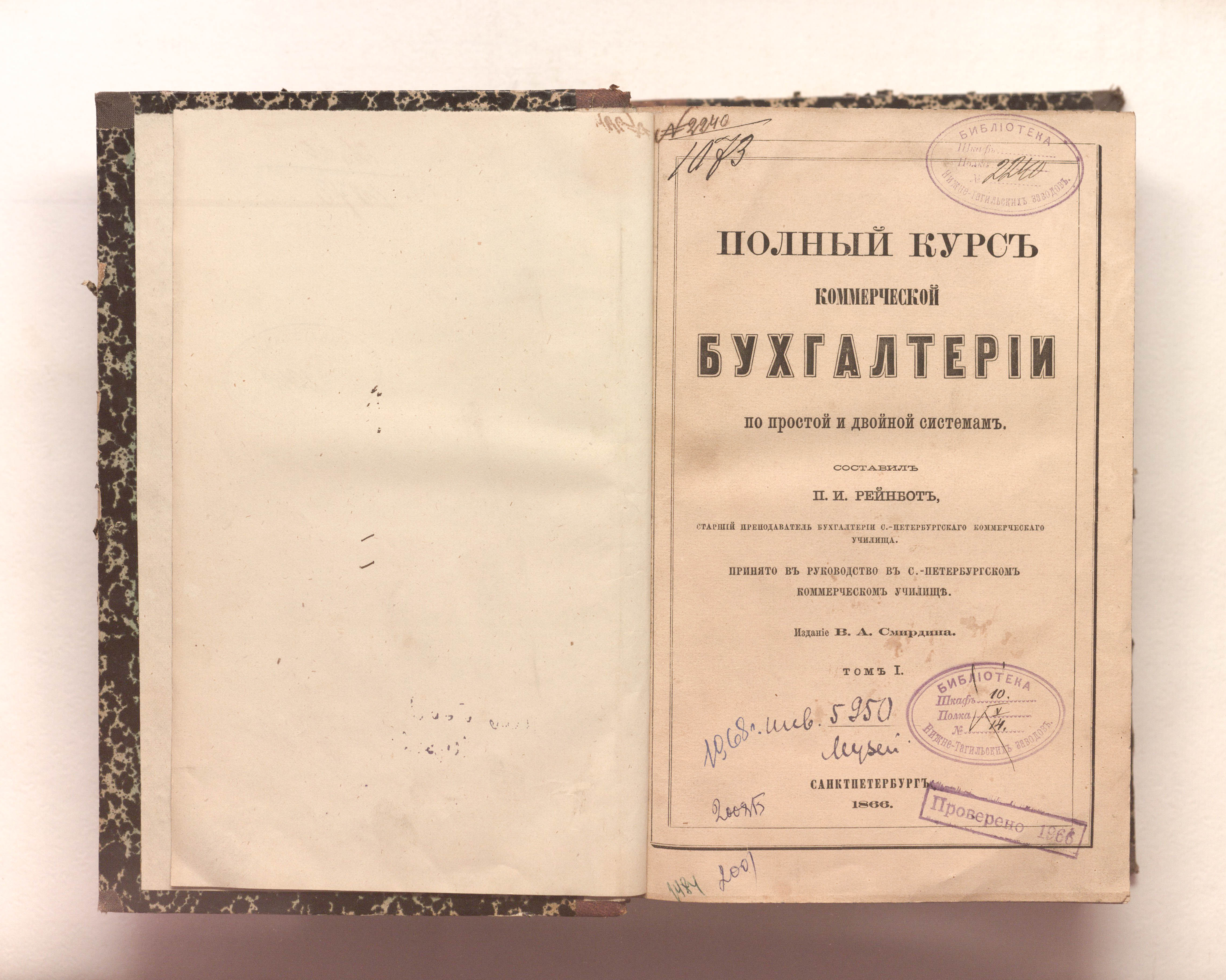 Рейнбот, Павел Иванович (1839-). Полный курс коммерческой бухгалтерии по простой и двойной системам : практ. часть на четырех яз.: рус., фр., англ. и нем. / сост. П.И. Рейнбот, ст. преп. бухгалтерии С.-Петерб. коммерч. уч-ща. Т. 1-2. — Санкт-Петербург : В.А. Смирдин, 1866. ; 24х16 см.