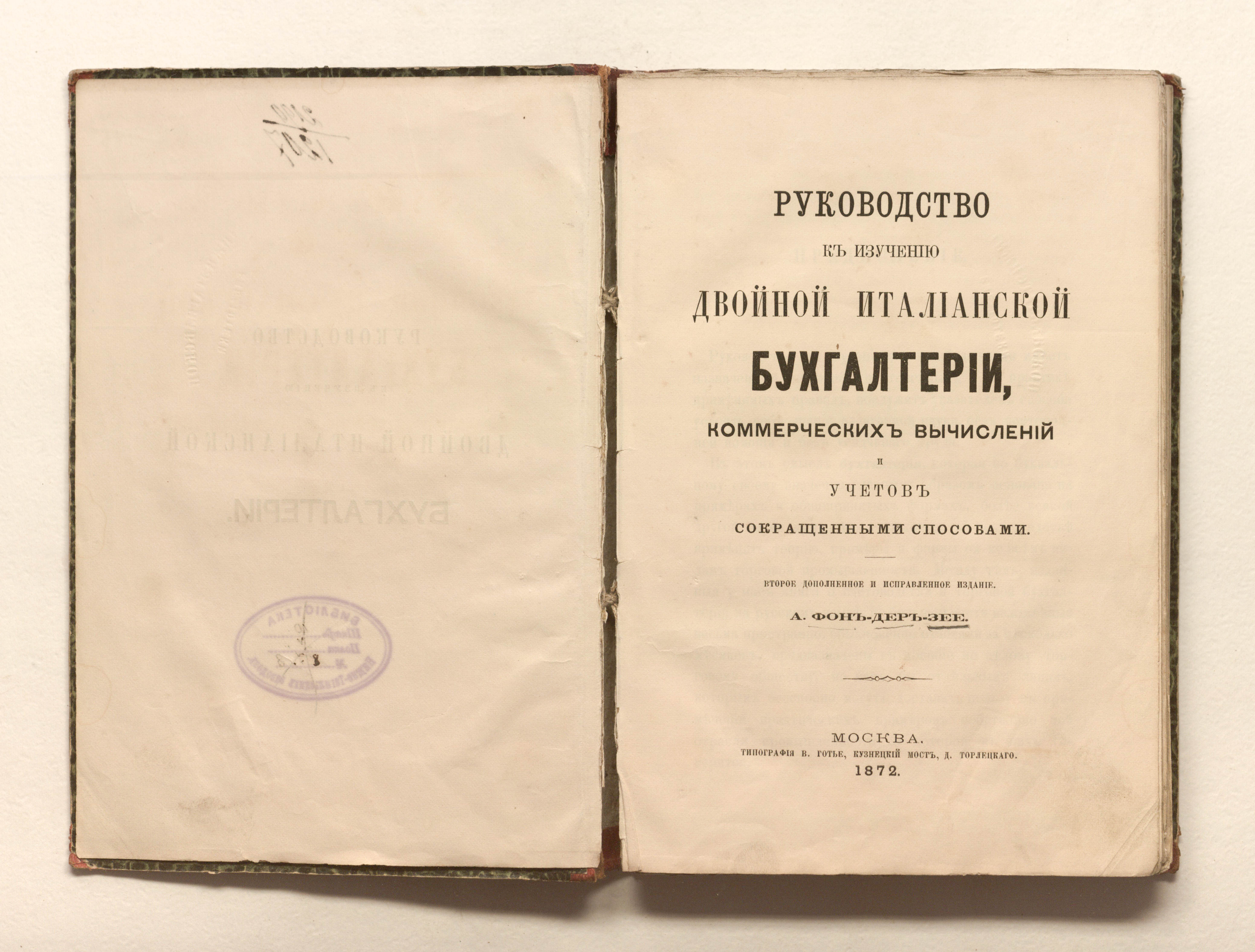 Руководство к изучению двойной итальянской бухгалтерии, коммерческих вычислений и учетов сокращенными способами / А. К. Фон дер Зее. — 2-е изд., испр. и доп. — Москва : тип. В. Готье, 1872. — III, 305, IV с. ; 23,5х15,5 см.