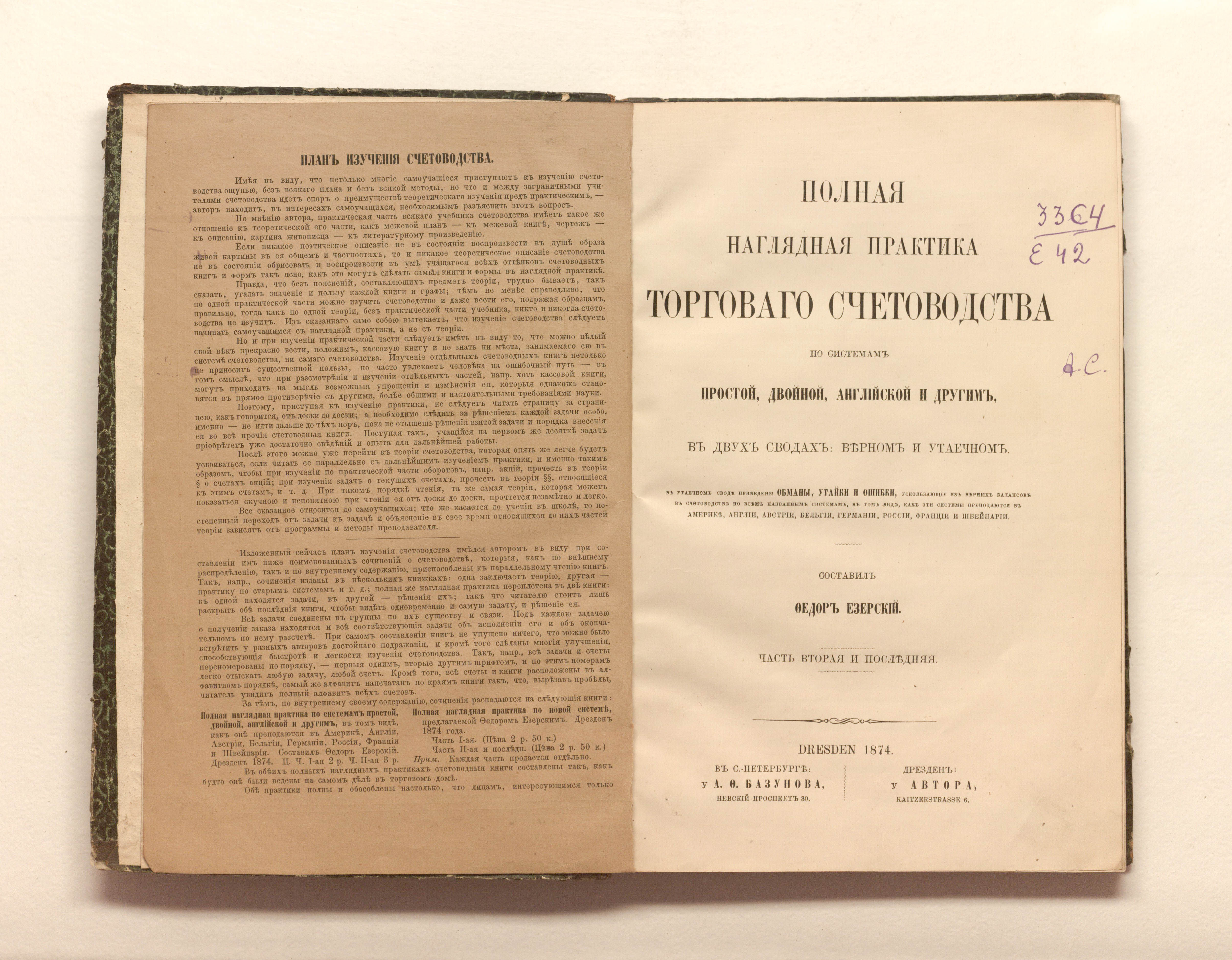 Езерский, Федор Венедиктович (-1915). Полная наглядная практика торгового счетоводства по системам простой, двойной, английской и другим, в двух сводах: верном и утаечном / сост. Федор Езерский. Ч. 2. — Dresden : у автора, 1874. — 191 с. ; 25х16,5 см.
