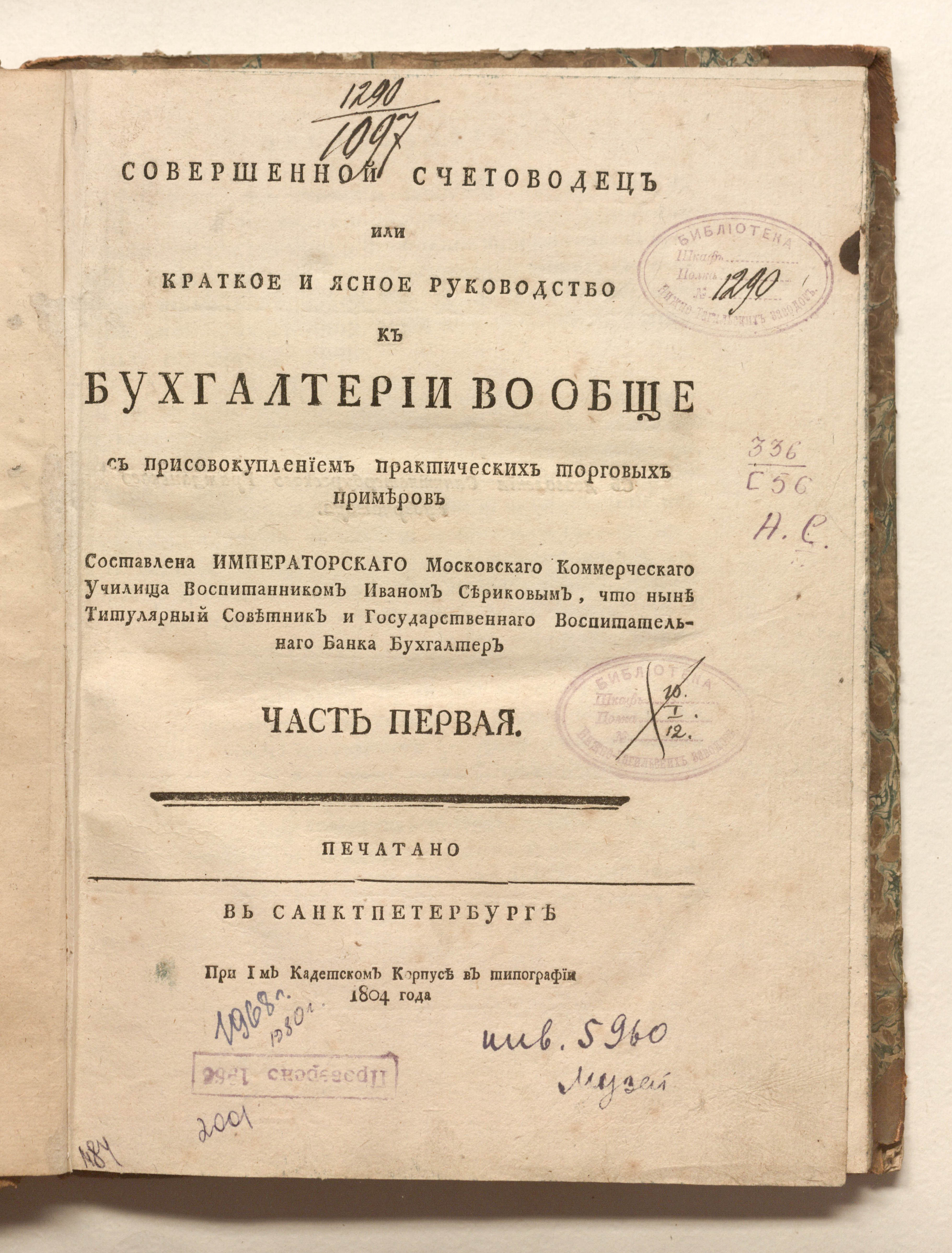 Совершенной счетоводец или краткое и ясное руководство к бухгалтерии вообще : с присовокуплением практических торговых примеров. Ч. 1-2 / составлена Императорскаго Московскаго коммерческаго училища воспитанником Иваном Сериковым, что ныне титулярный советник и Государственнаго Воспитательнаго банка бухгалтер. — Санкт-Петербург : при I м Кадетском корпусе в типографии, 1804. — [4], 11, [3], 26, [26], 43 с. ; 26,8х21 см.
