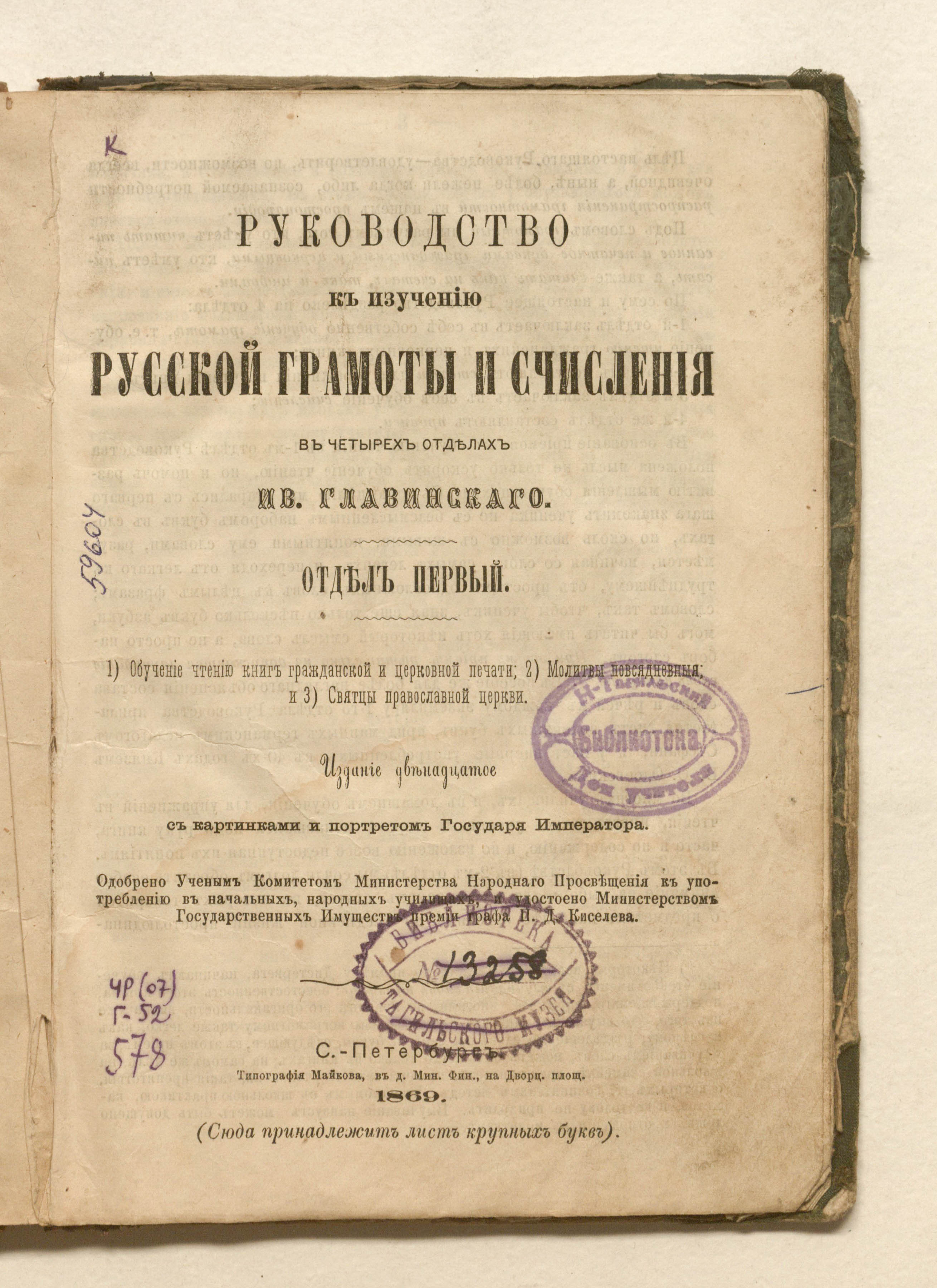 Руководство к изучению русской грамоты и счисления : в четырех отделах. Отдел 1 / И. Главинский. — 12-е изд. — Санкт-Петербург : тип. Майкова, 1869. — 51, [13] с. : ил. ; 20х14,5 см.