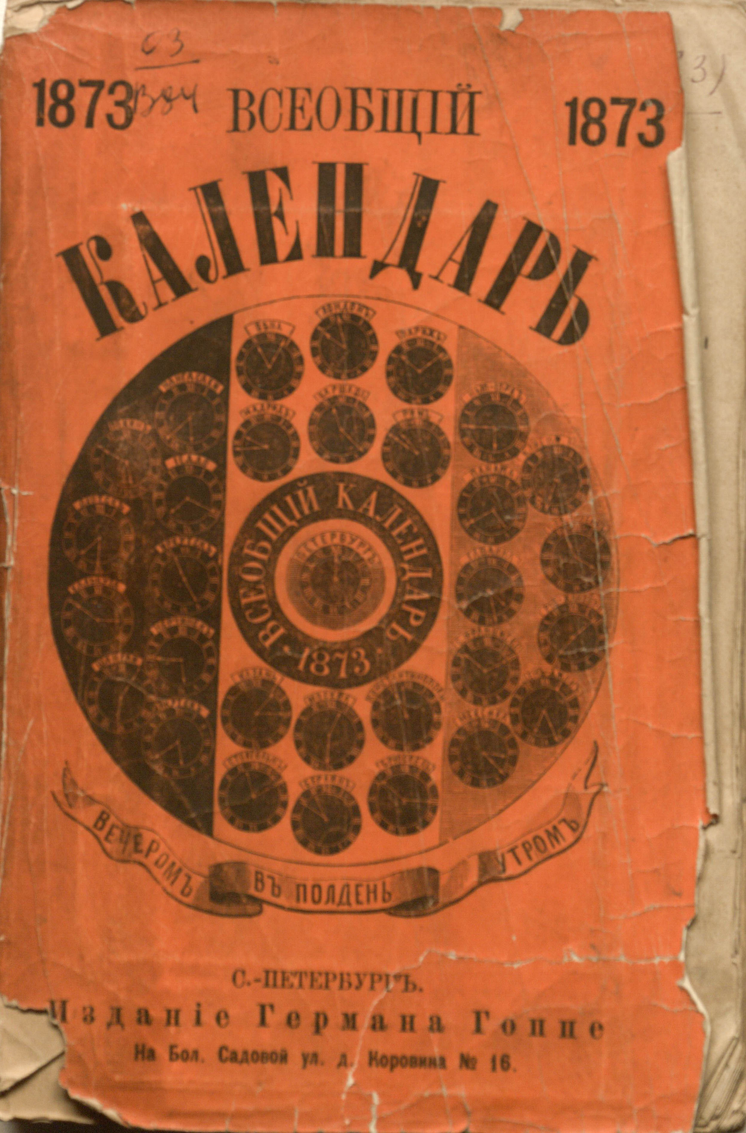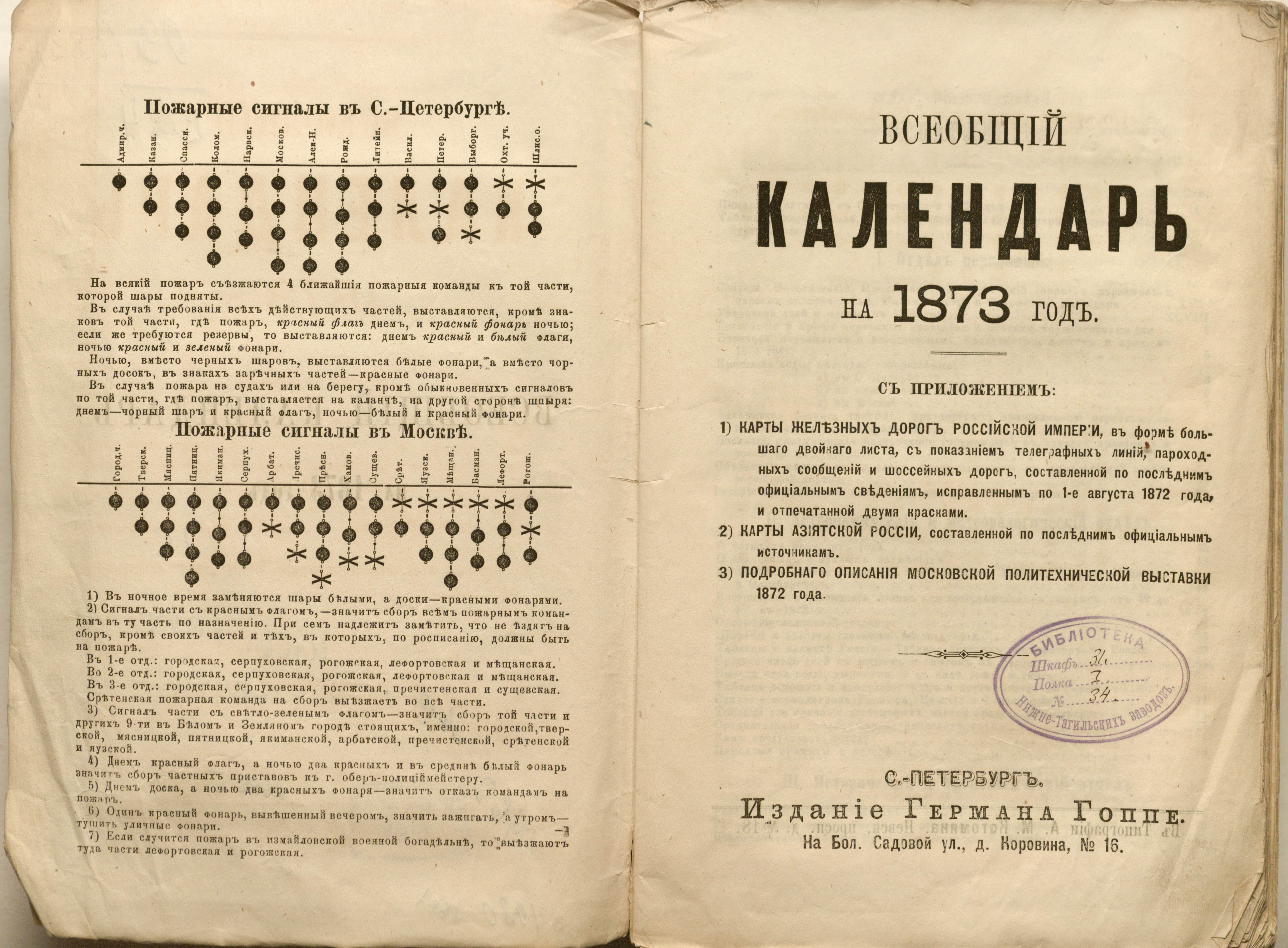 Всеобщий календарь на 1873 г. с прил.: 1) карты ж. д. Рос. империи, сост. по последним офиц. сведениям, испр. по 1-е авг. 1872 г., 2) карты Азиат. России, сост. по последним офиц. источникам, 3) подробного описания Моск. политехн. выставки 1872 г. : календарь. — Санкт-Петербург : Издание Германа Гоппе, 1872 (тип. А. М. Котомина). — LXIV, 603, 27, 60 с. : м.карты, табл. ; 22,5х15 см.