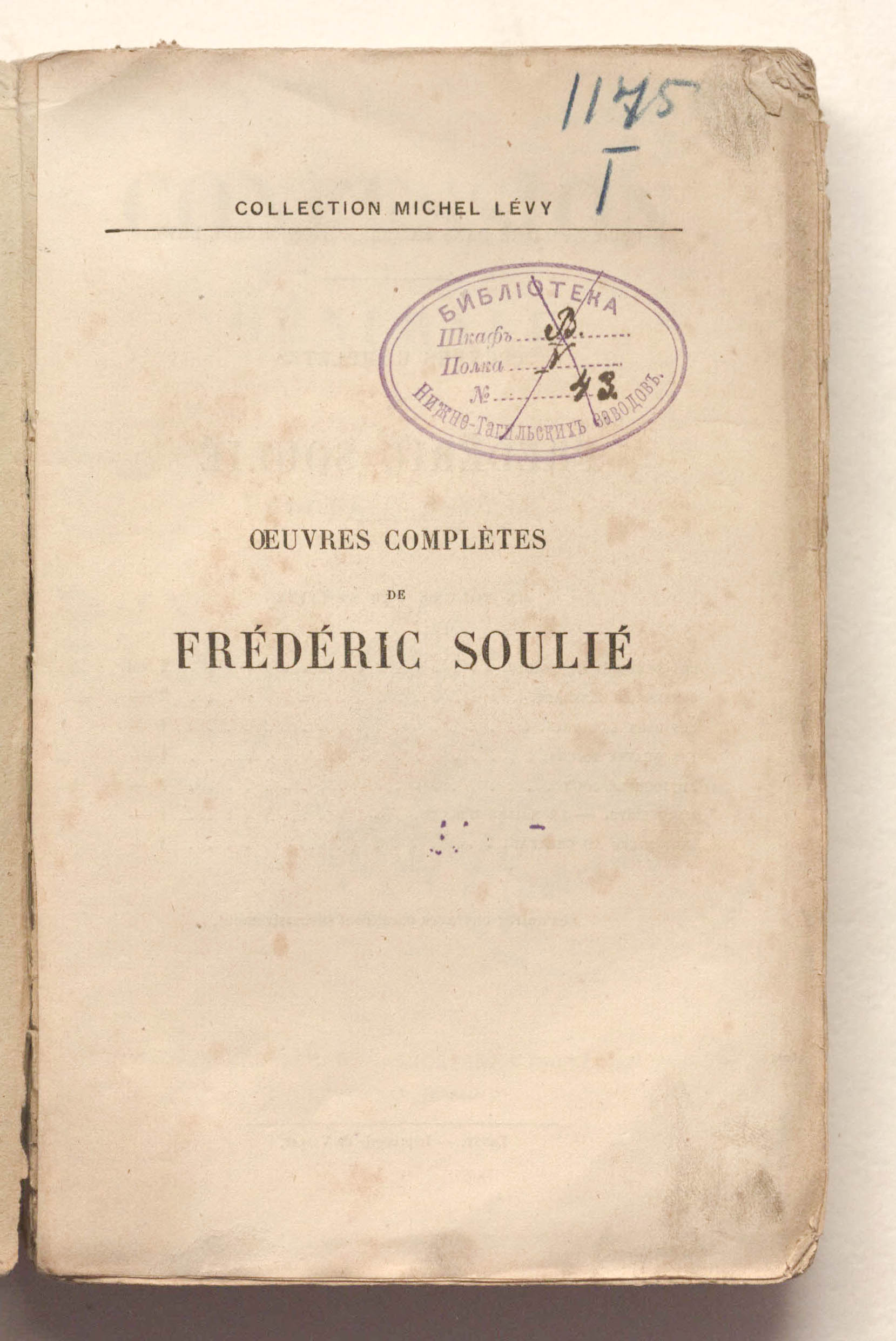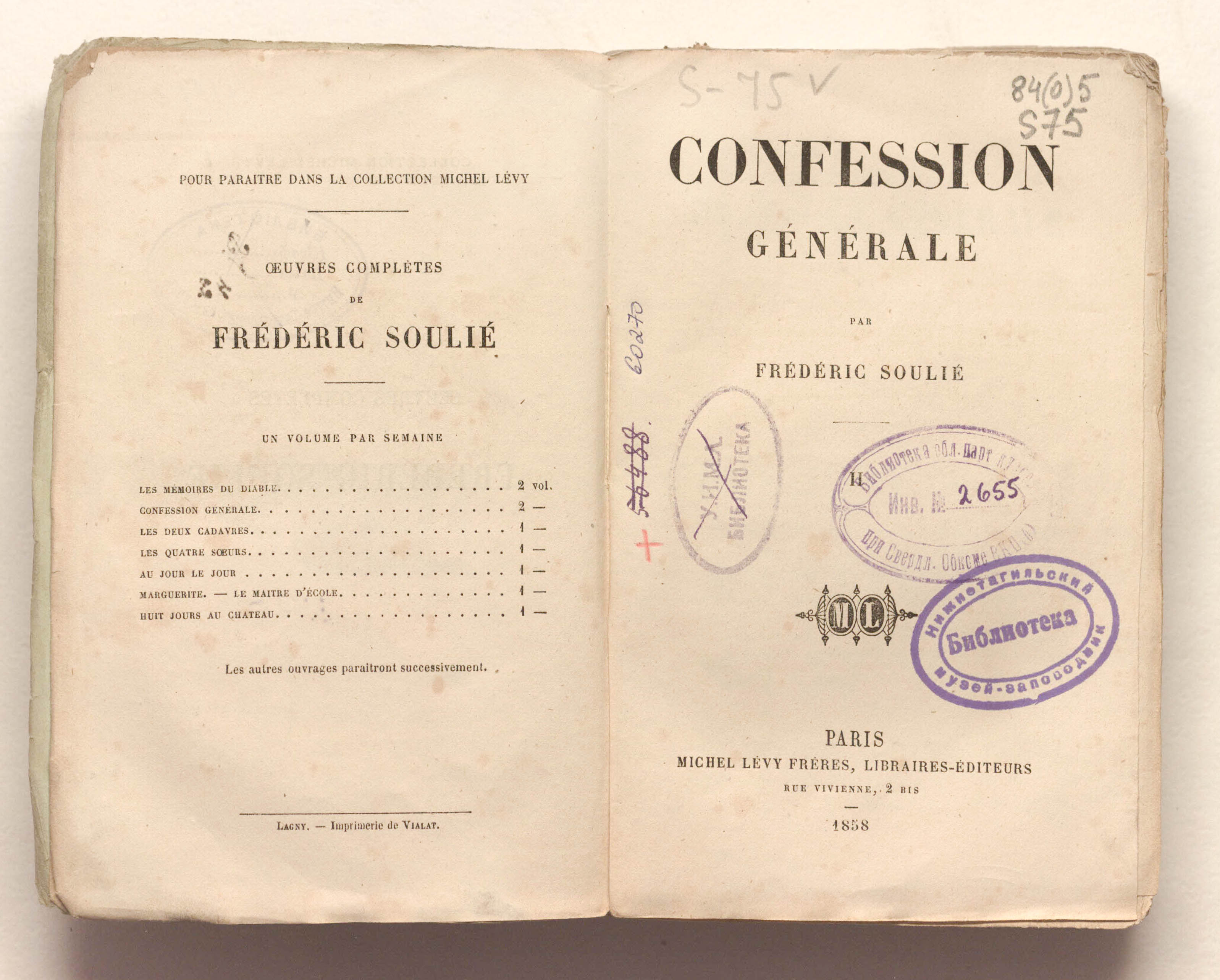 Всеобщая исповедь / Полное собрание сочинений Фредерика Сулье. – Париж : Братья Мишел-Леви, 1858. – 342 с. ; 12х18,5 см.