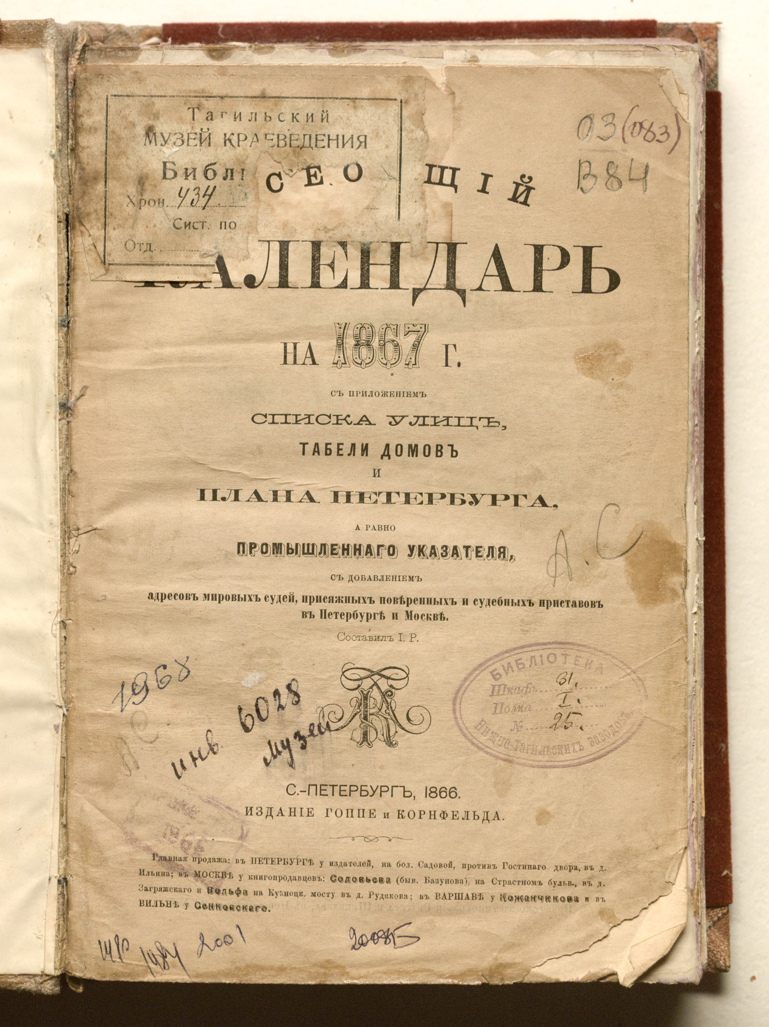 Всеобщий календарь на 1867 г. с прил. списка улиц, табели домов и плана Петербурга, а равно промышленного указателя, с добавлением адресов мировых судей, присяжных поверенных и судебных приставов в Петербурге и Москве / сост. И. Р[ынкевич]. — Санкт-Петербург : издание Гоппе и Корнфельда, 1866 (тип. Ретгера и Шнейдера). — 148, [22] с. : карты. ; 23,515,5 см.