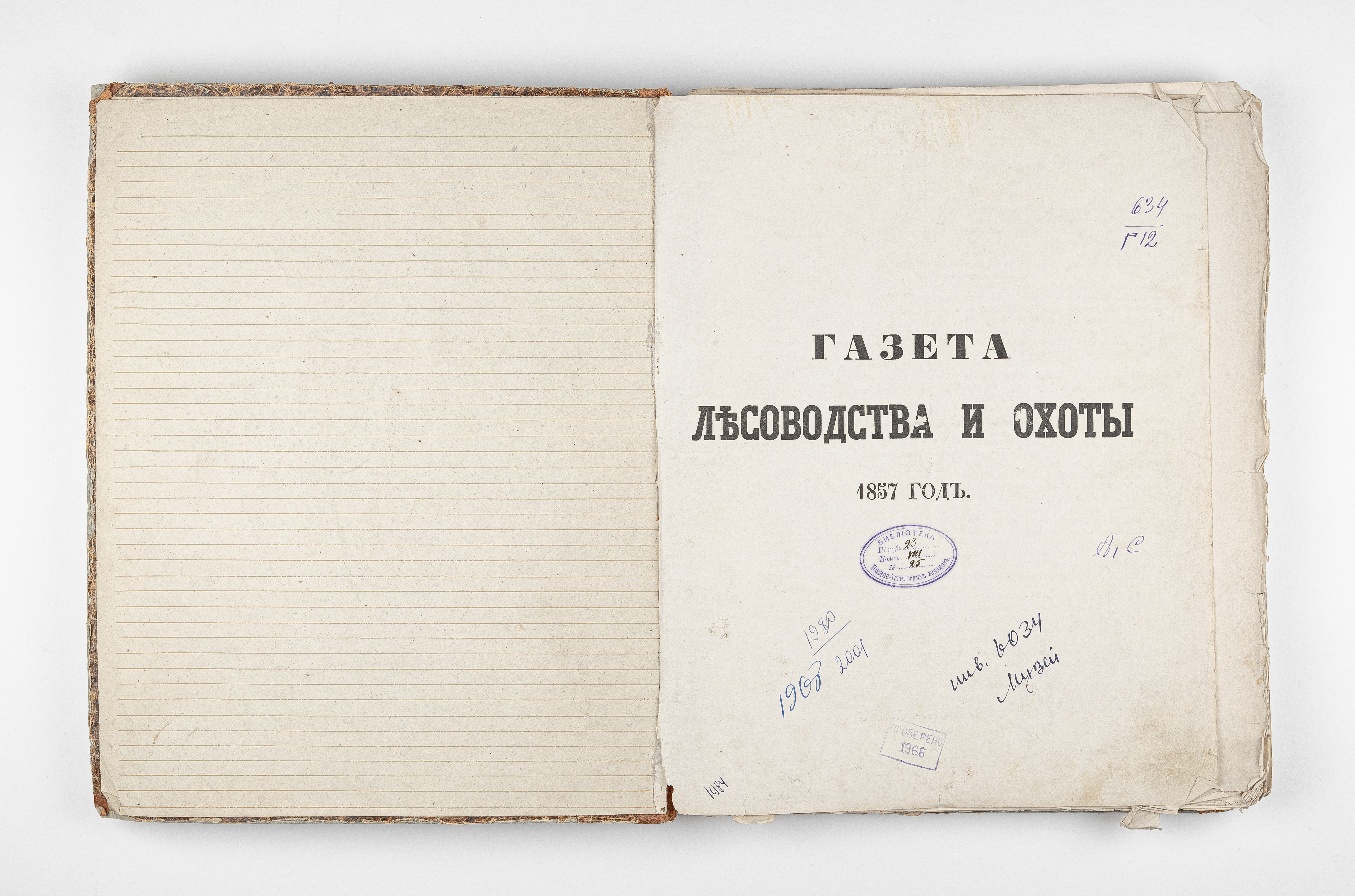 Бумажный ярлык «958. Газета лесоводства и охоты. 1857» (на корешке перепл.).