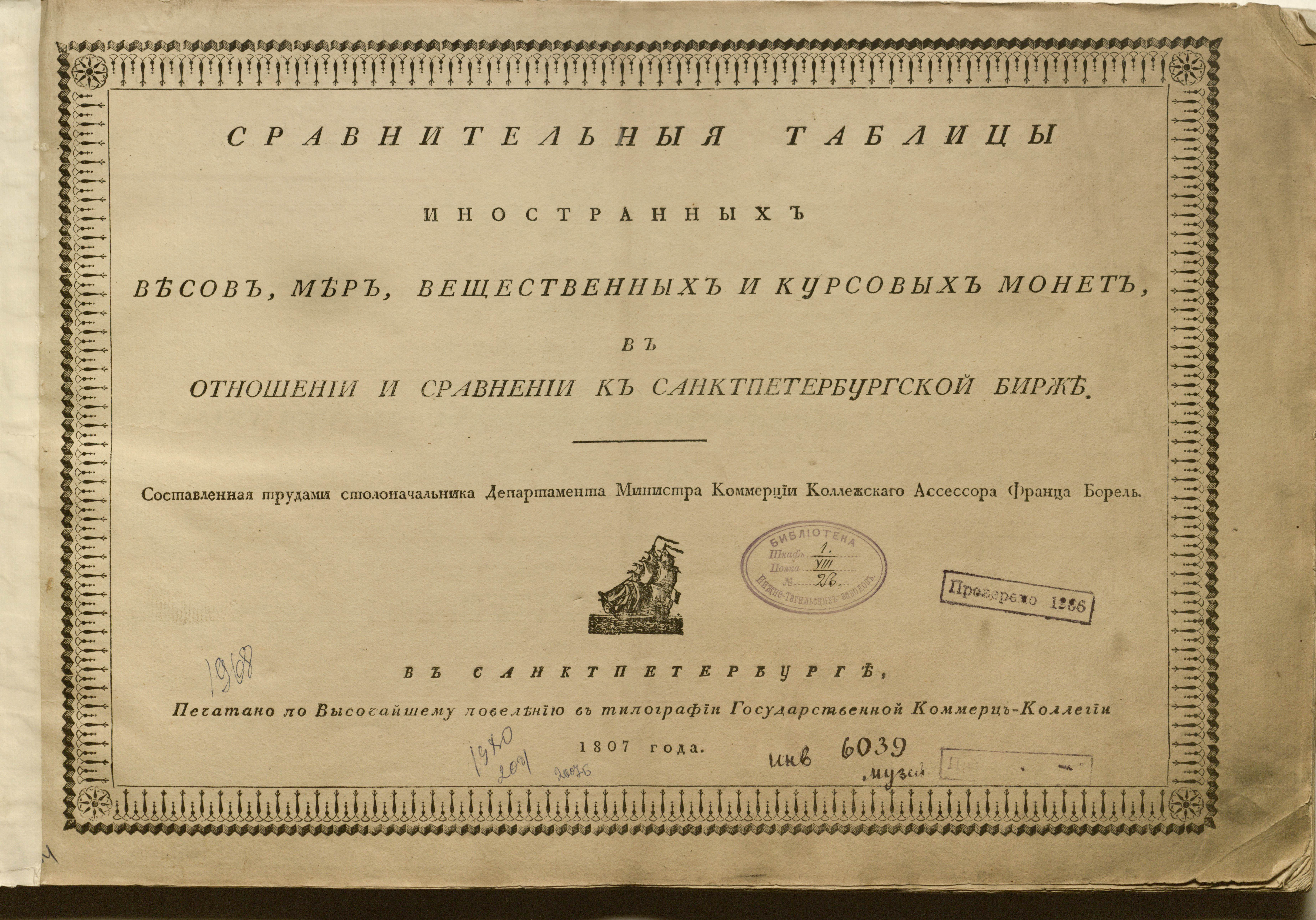 Сравнительныя таблицы иностранных весов, мер, вещественных и курсовых монет, в отношении и сравнении к Санктпетербургской бирже / cоставленная трудами столоначальника Департамента министра коммерции коллежскаго ассессора Франца Борель. — В Санктпетербурге : Печатано по Высочайшему повелению в типографии Государственной Коммерц-коллегии, 1807. — [10], 116 с. ; 29 х 43 см.