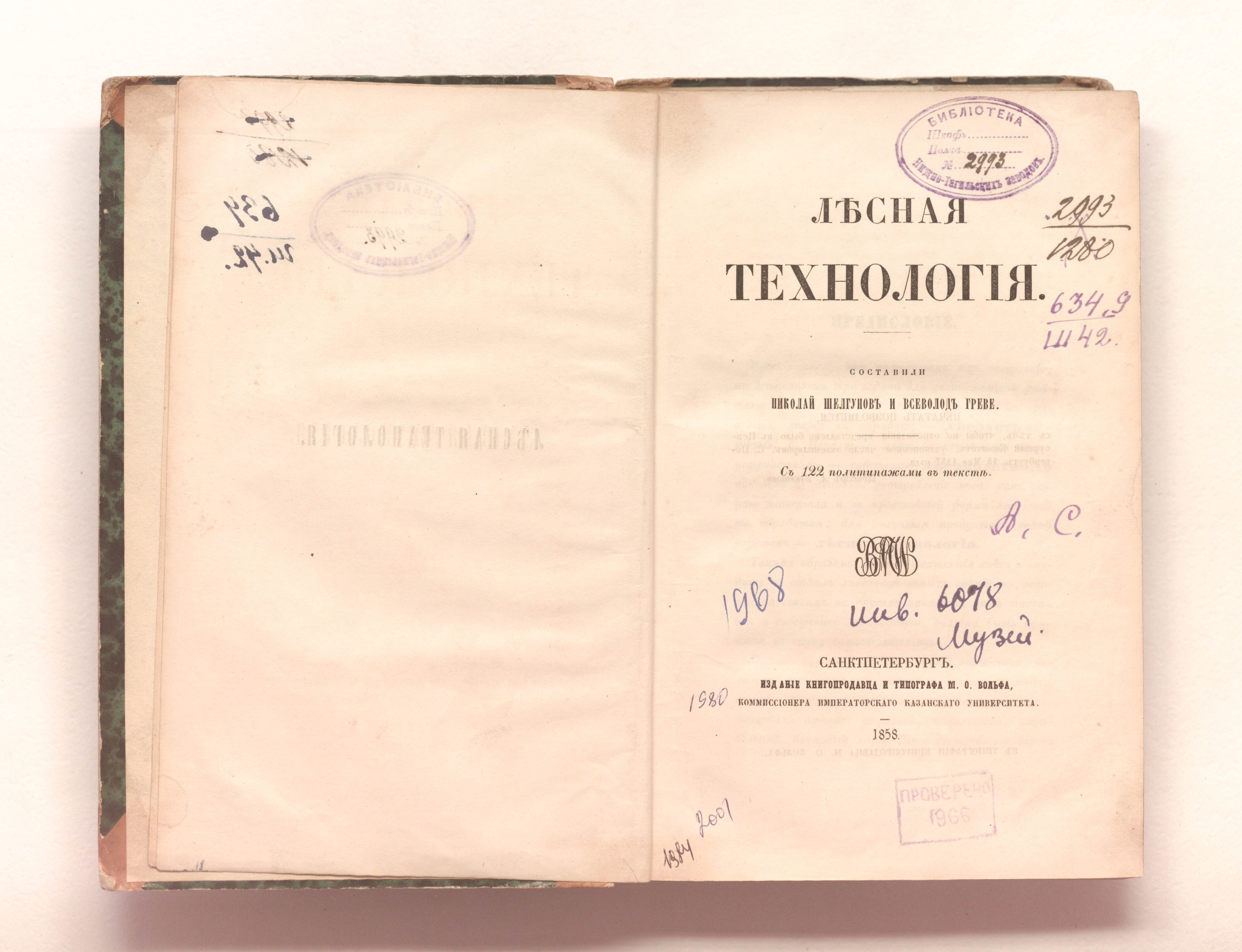 Лесная технология : с 122 политипажами в тексте / составили: Николай Шелгунов и Всеволод Греве. — Санкт-Петербург : издание книгопродавца и типографа М. О. Вольфа, 1858. — [4], II, 383 с. ; 23х15,5 см.