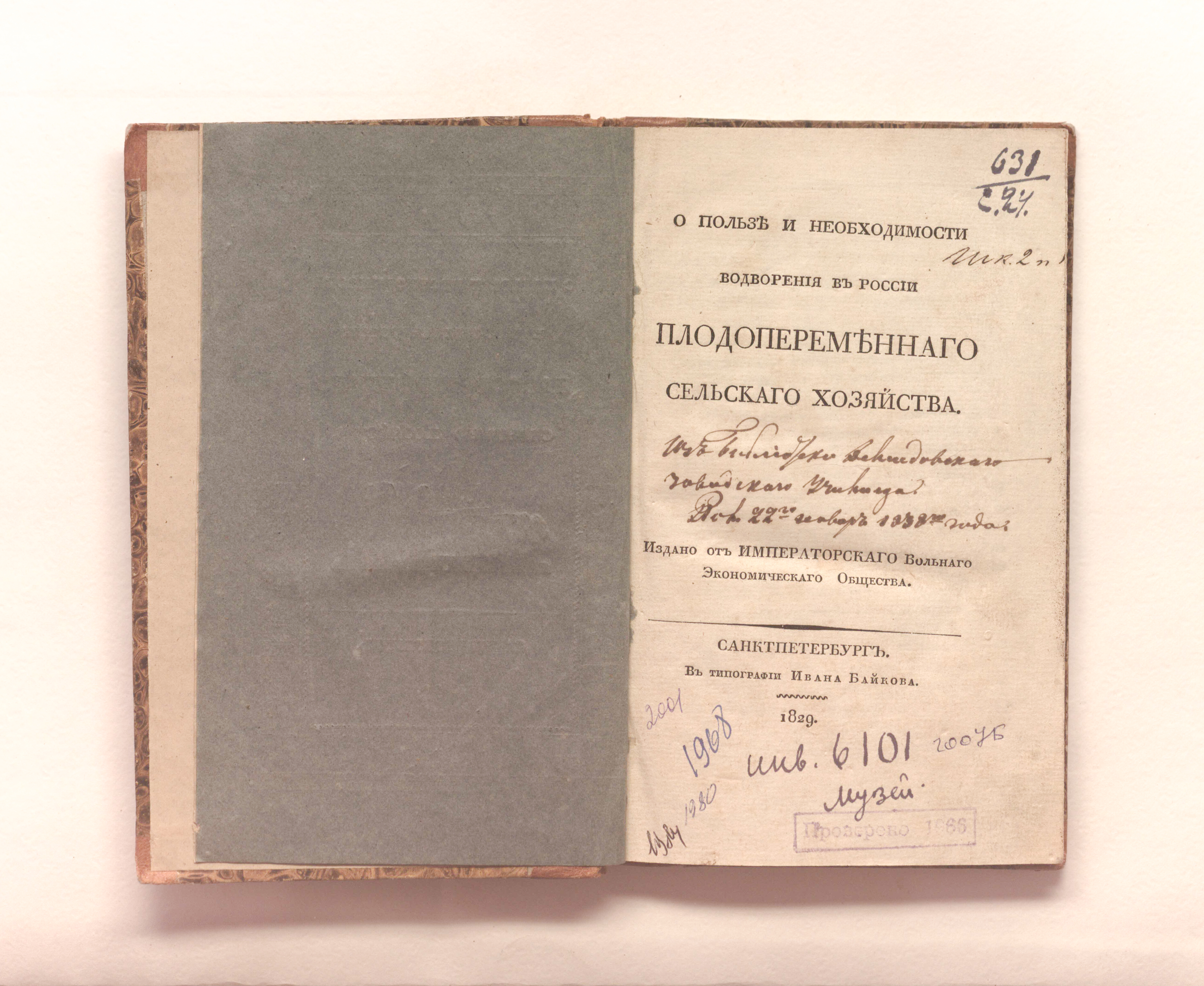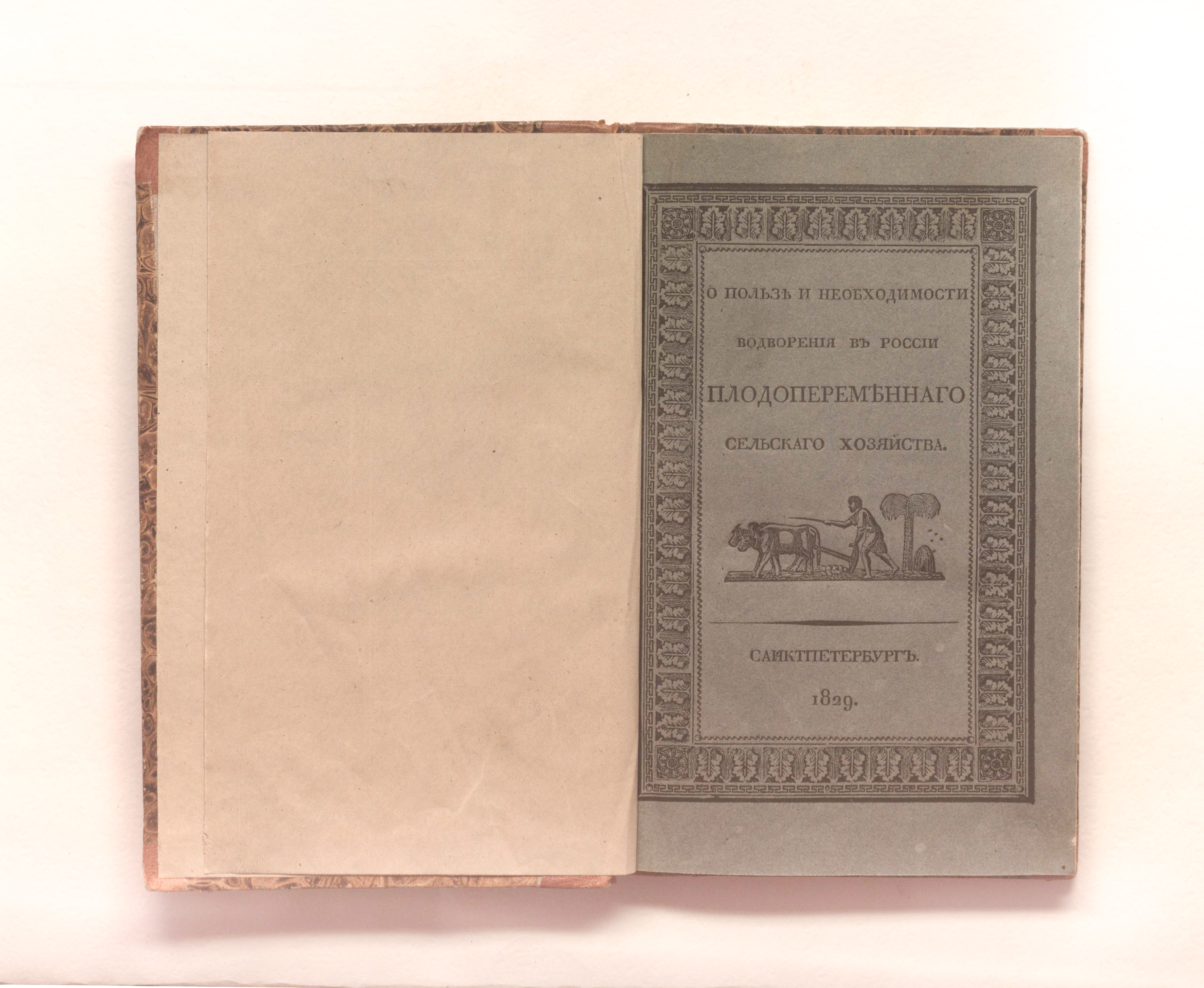 О пользе и необходимости водворения в России плодопеременного сельского хозяйства / Имп. Вольное экон. о-во. — Санкт-Петербург : в тип. Ивана Байкова, 1829. — [1], II, IV, 101 с., 7 л. табл. ; 20х12.5 см.