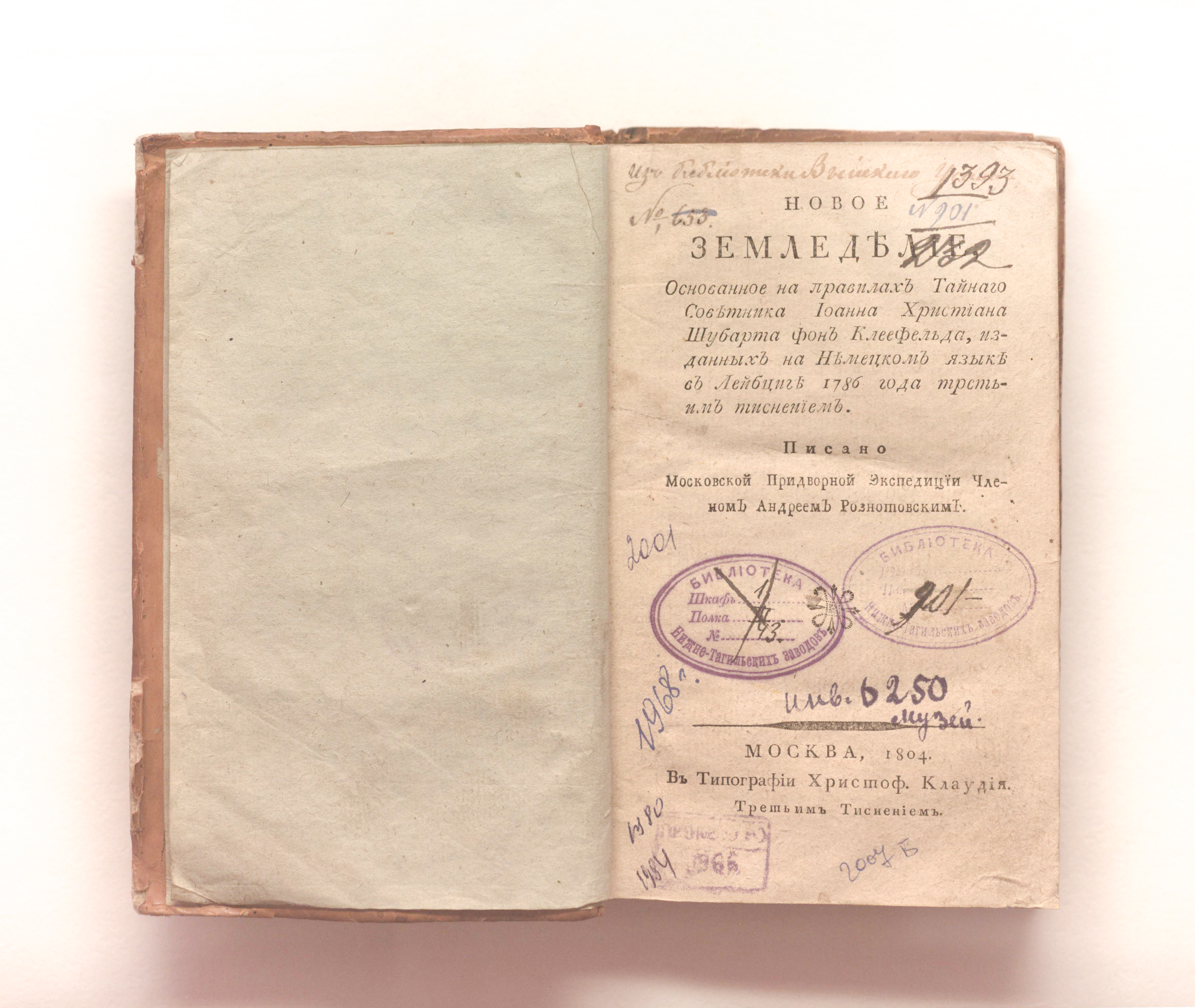 Рознотовский, Андрей Васильевич. Новое земледелие, основанное на правилах тайнаго советника Иоанна Христиана Шубарта фон Клеефельда, изданных на немецком языке в Лейбциге 1786 года третьим тиснением / писано Московской придворной экспедиции членом Андреем Рознотовским. — Москва : в типографии Христоф. Клаудия, 1804. — XXXIV, 380, [8] с. ; 19х11 см.