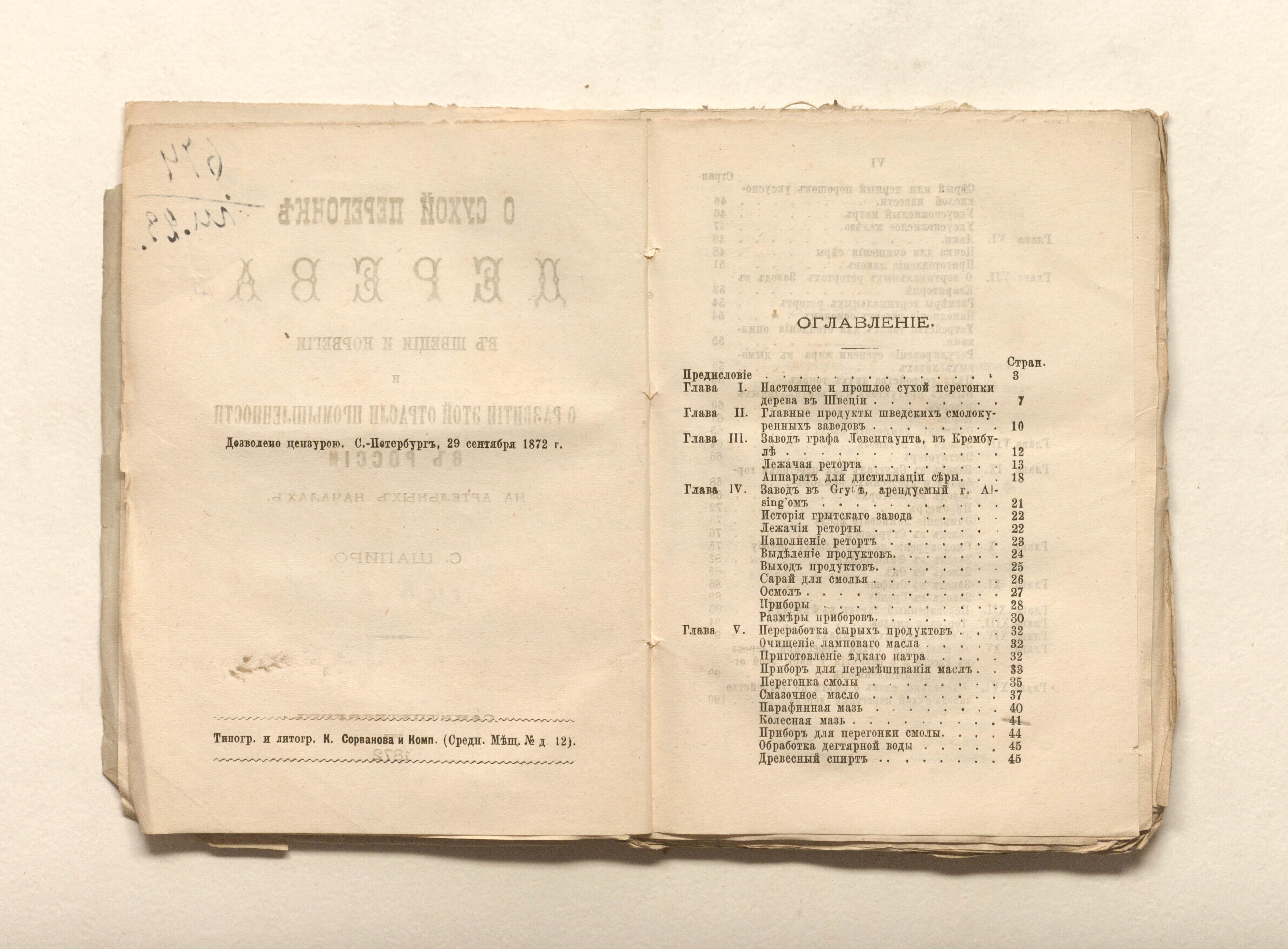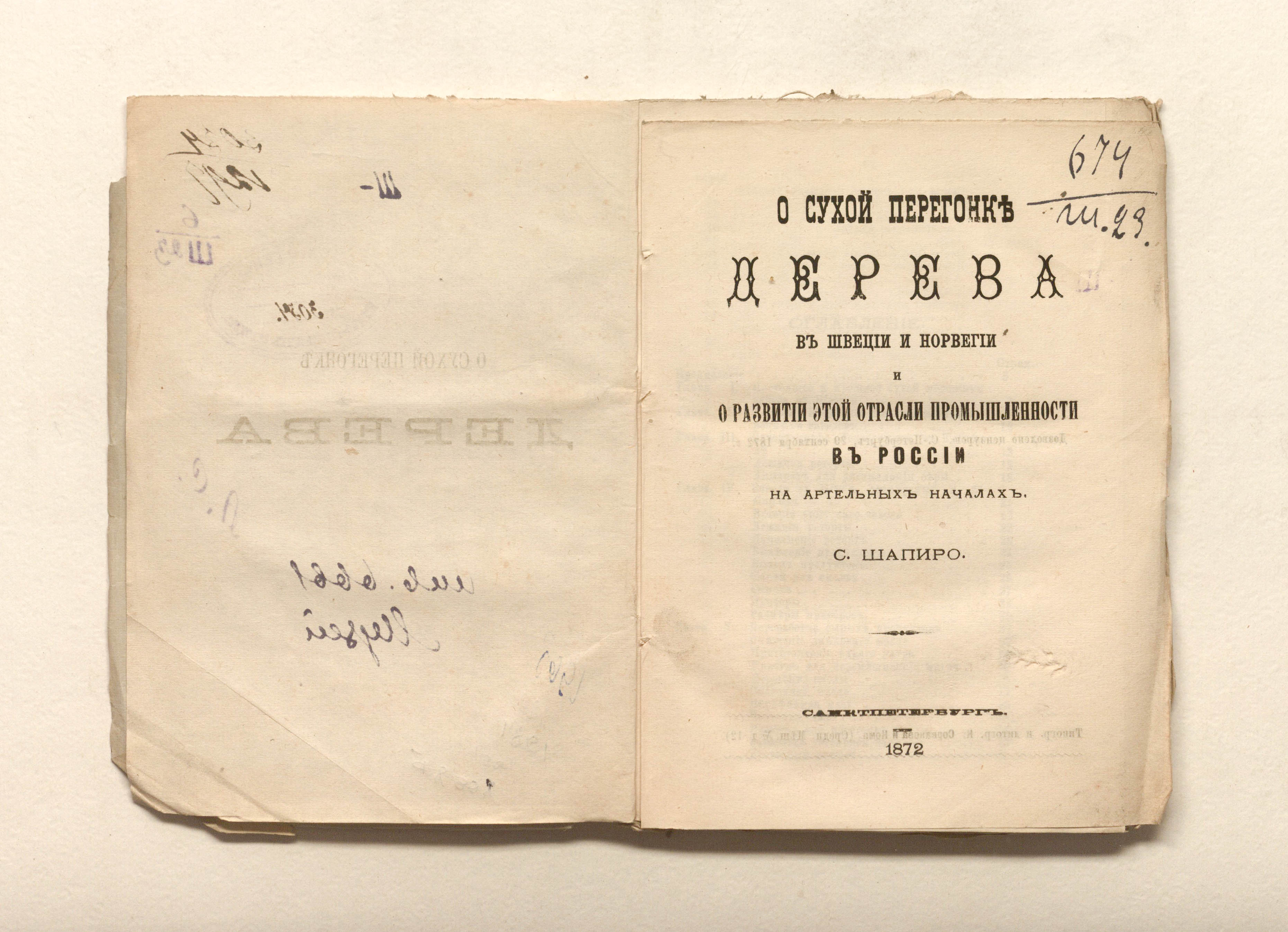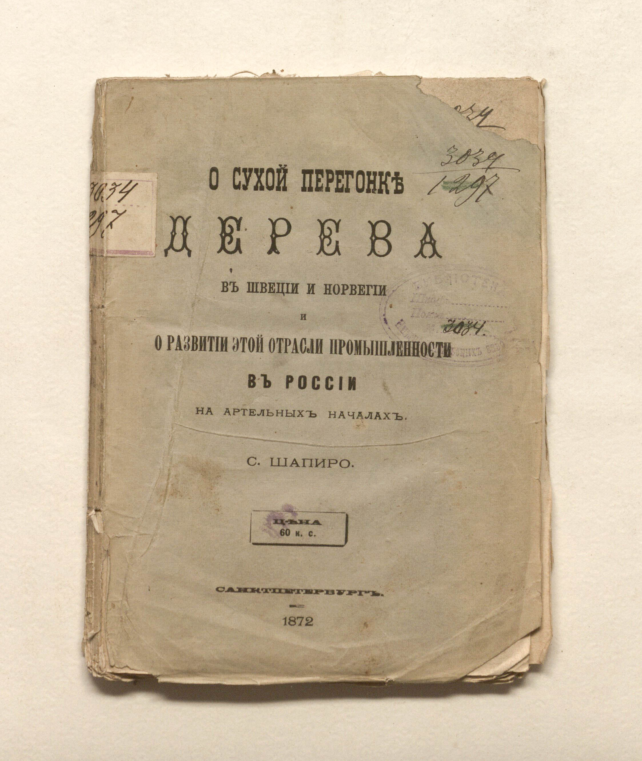 О сухой перегонке дерева в Швеции и Норвегии и о развитии этой отрасли промышленности в России на артельных началах / С. Г. Шапиро. — Санкт-Петербург : тип. и лит. К. Сорванова и К°, 1872. — VIII, 128 с. : ил. ; 17.х13 см.