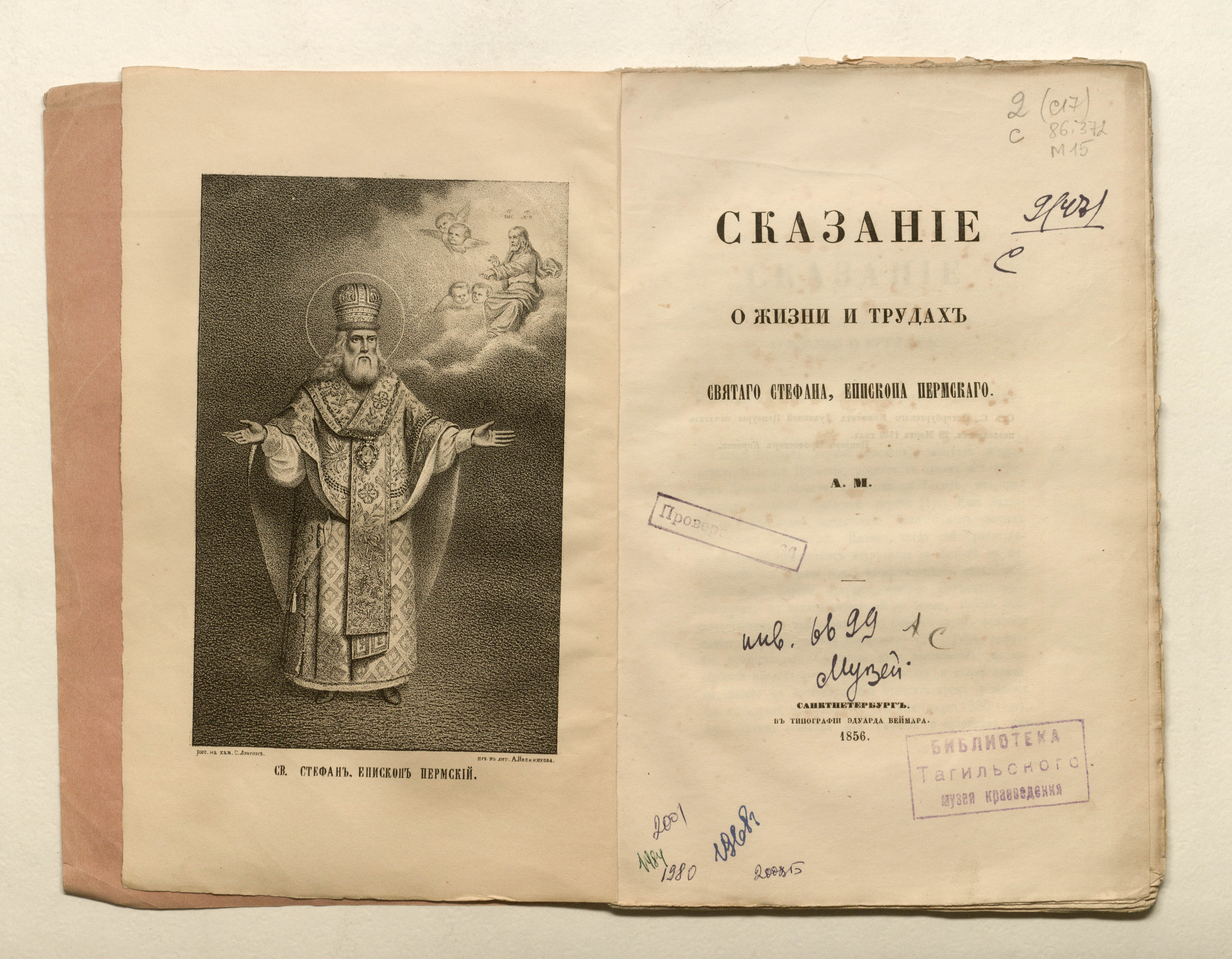 Сказание о жизни и трудах святого Стефана, епископа Пермскаго / А. М. — Санкт-Петербург : в типографии Эдуарда Веймара, 1856. — 67 с. : 1 л. фронт. (ил.), портр. ; 25.5х17 см.