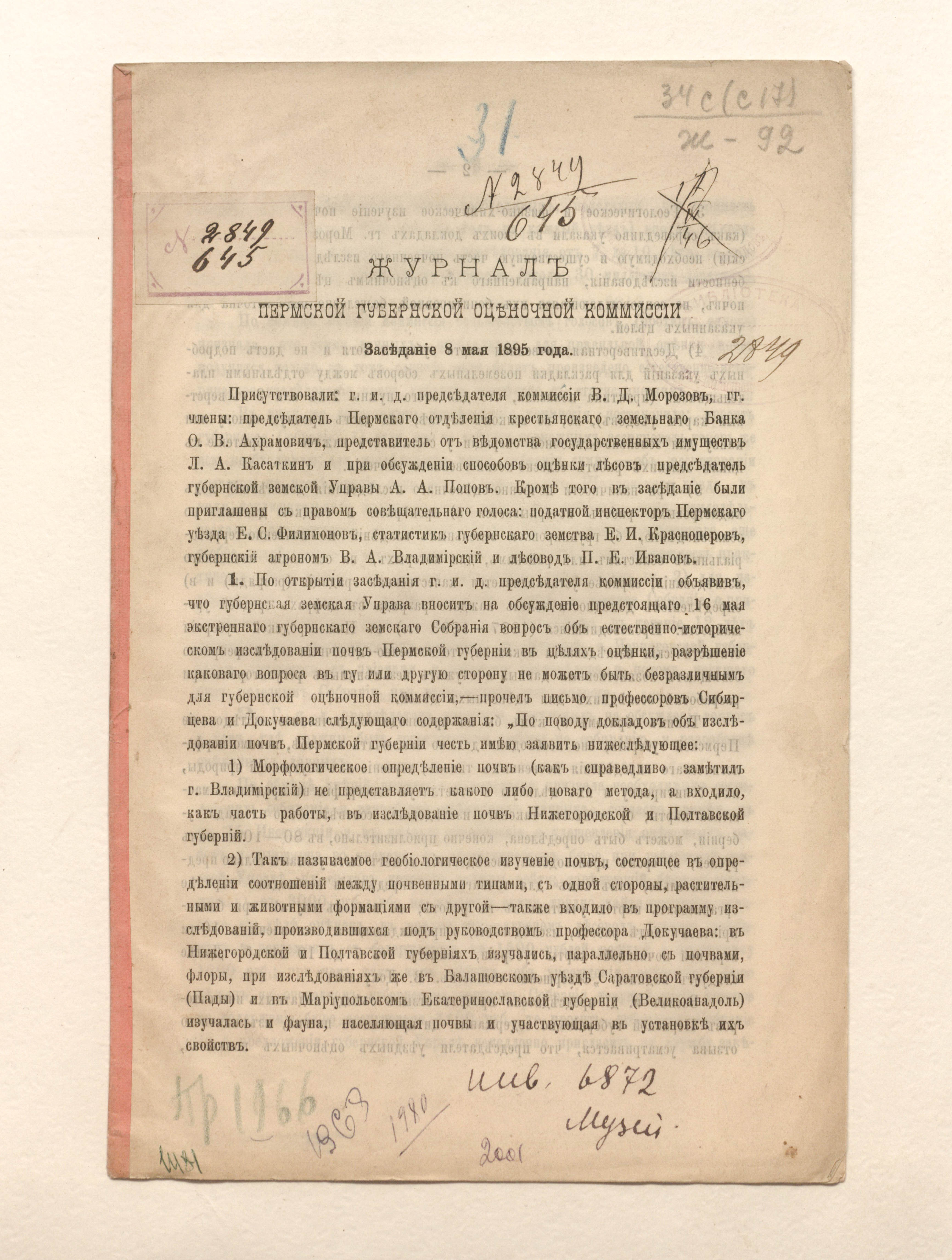 Пермская губернская оценочная комиссия. Журнал Пермской губернской оценочной комиссии : заседание 8 мая 1895 года / Пермская губернская оценочная комиссия. — Пермь : тип. Губернс. земс. управы, 1895. — 20 с. ; 25,5х17 см.