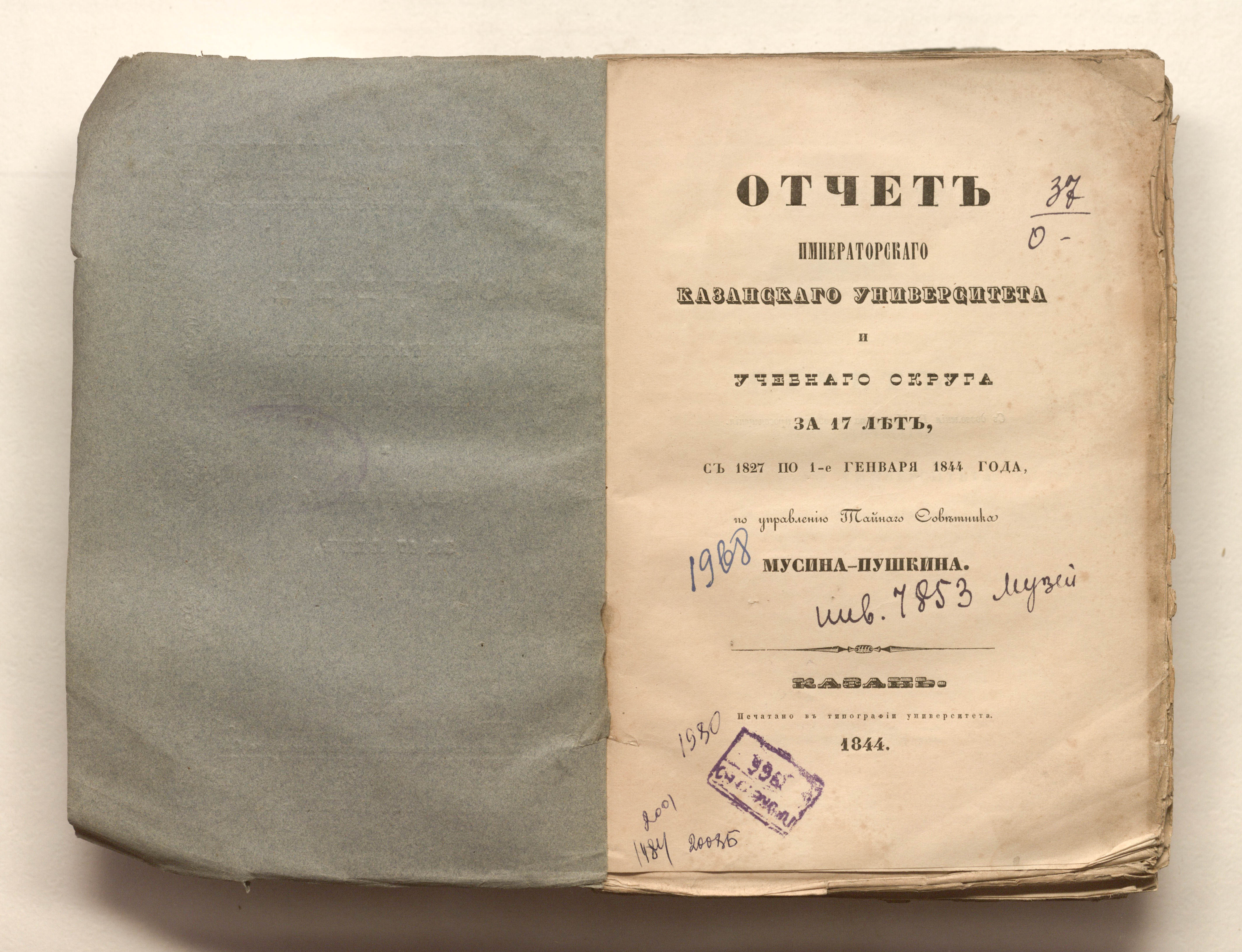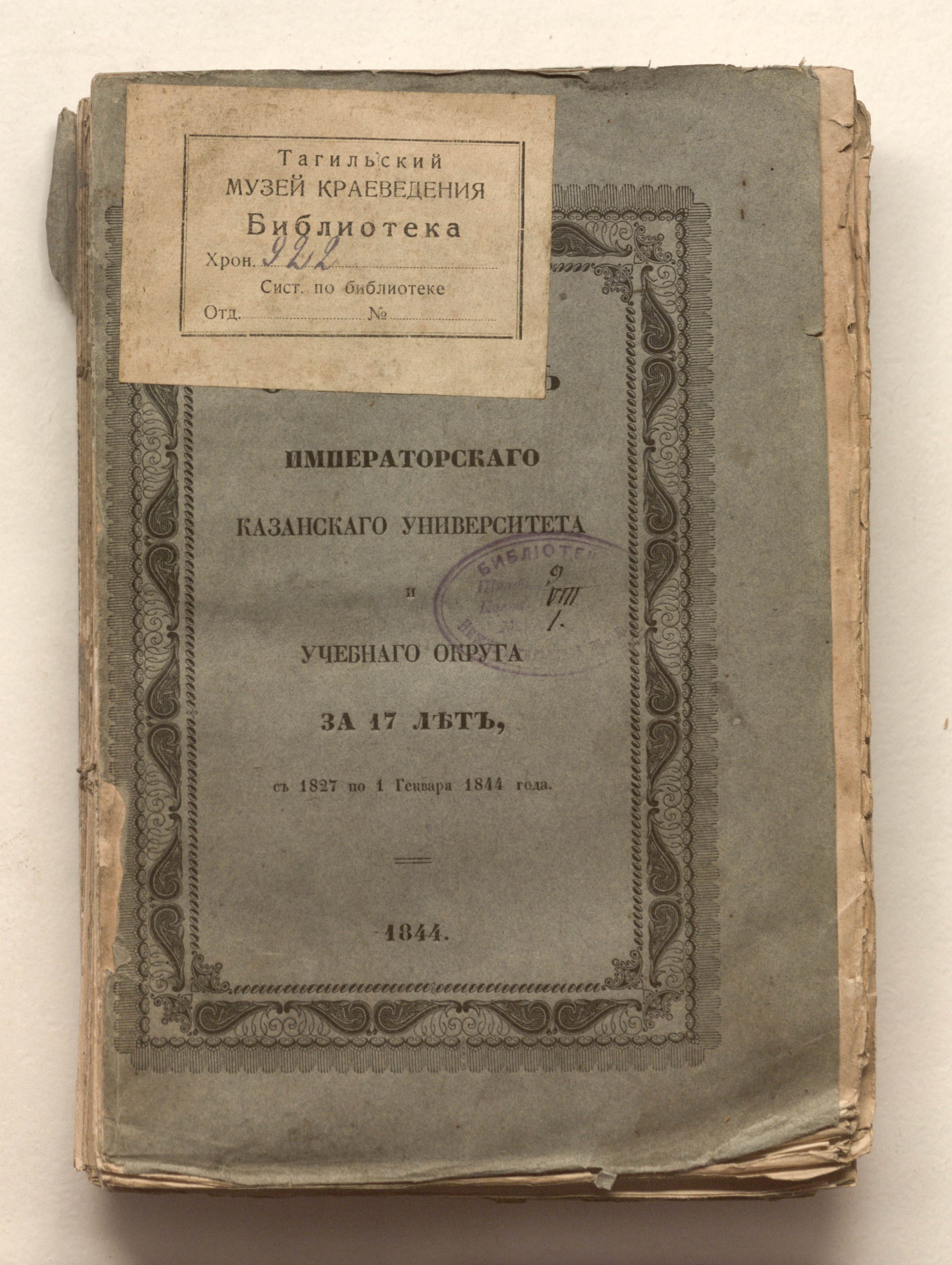 Отчет Казанского университета и Учебного округа за 17 лет, с 1827 по 1-е генваря 1844 года, по управлению тайного советника Мусина-Пушкина / Казанский университет ; сост.: Фойгт, Антропов. – Казань : тип. Ун-та, 1844. – 448, V, 67, III с. : 3 табл. ; 22,5х15,5 см.