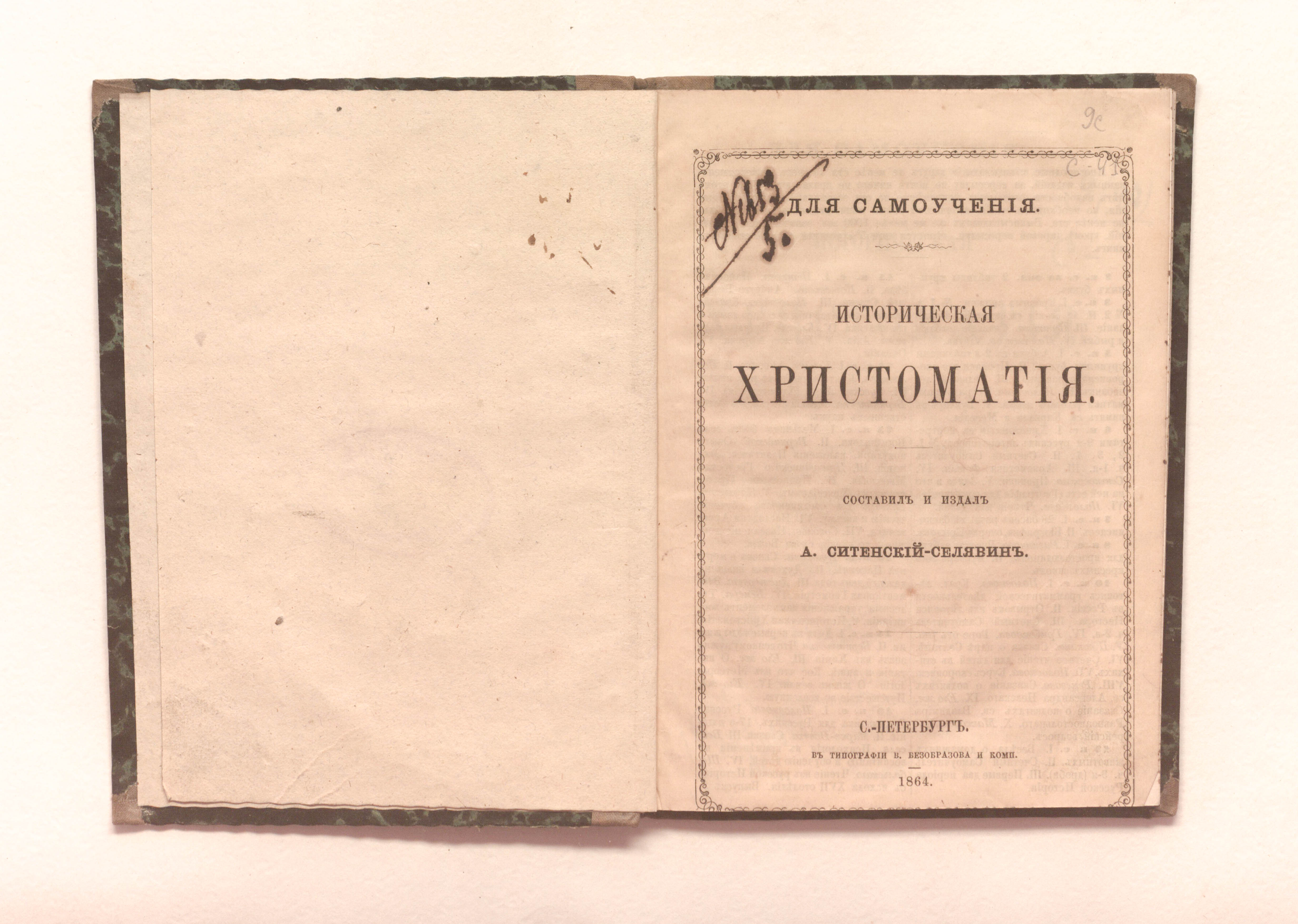 Историческая христоматия : для самоучения / сост. и изд. А. Ситенский-Селявин. — Санкт-Петербург : в типографии В. Безобразова и комп., 1864. — 125, [2] с. ; 17,5х13 см.
