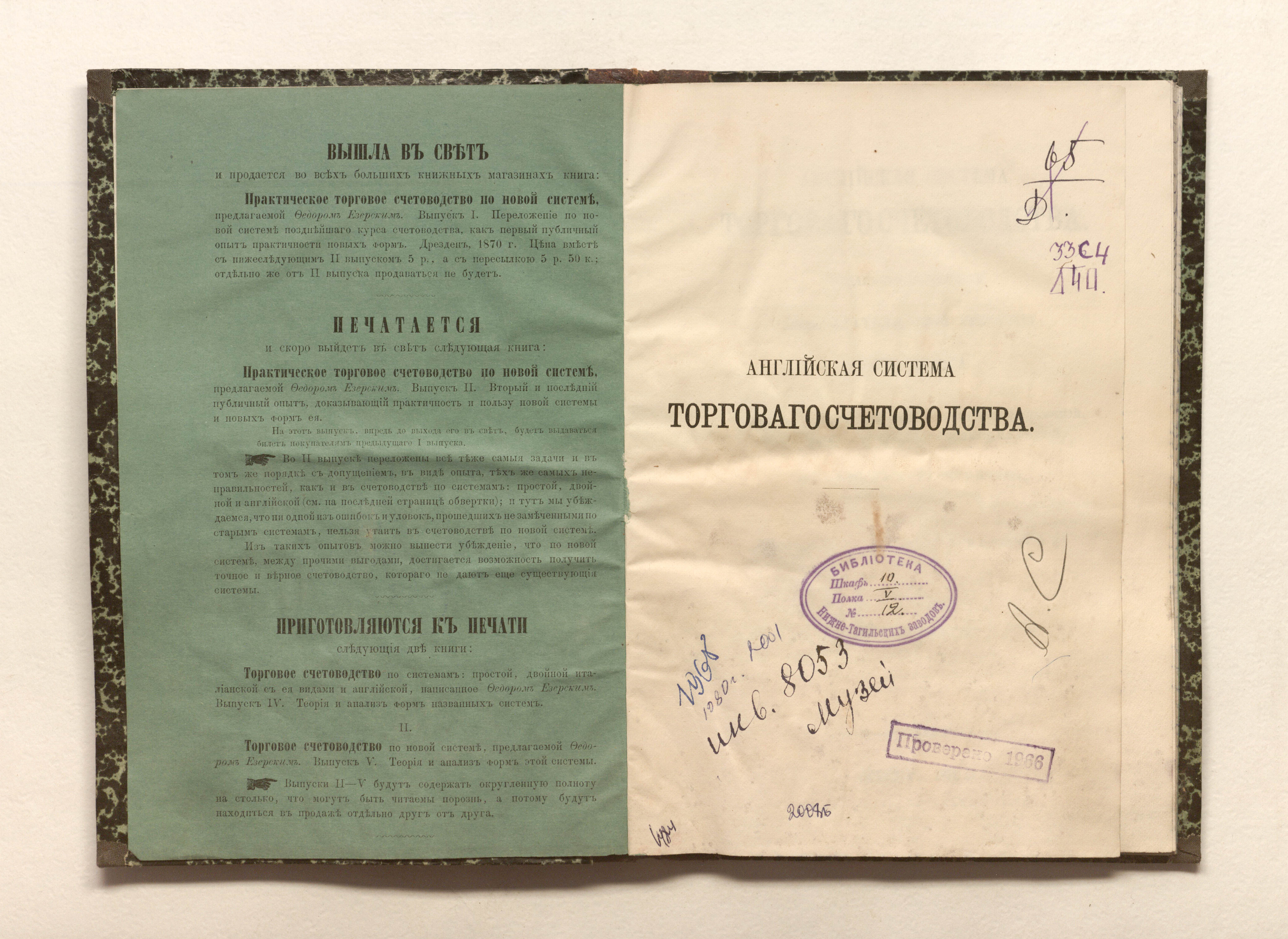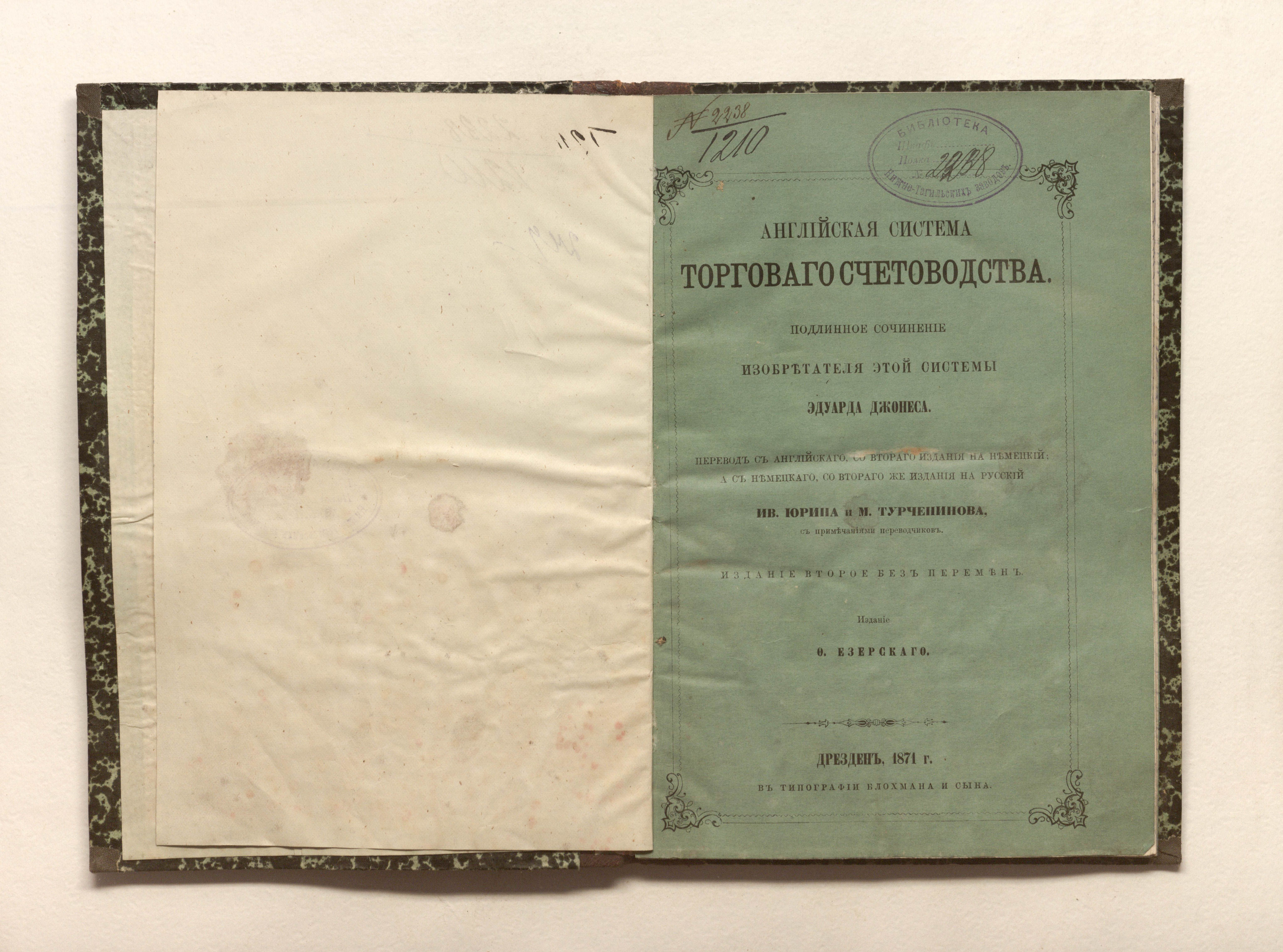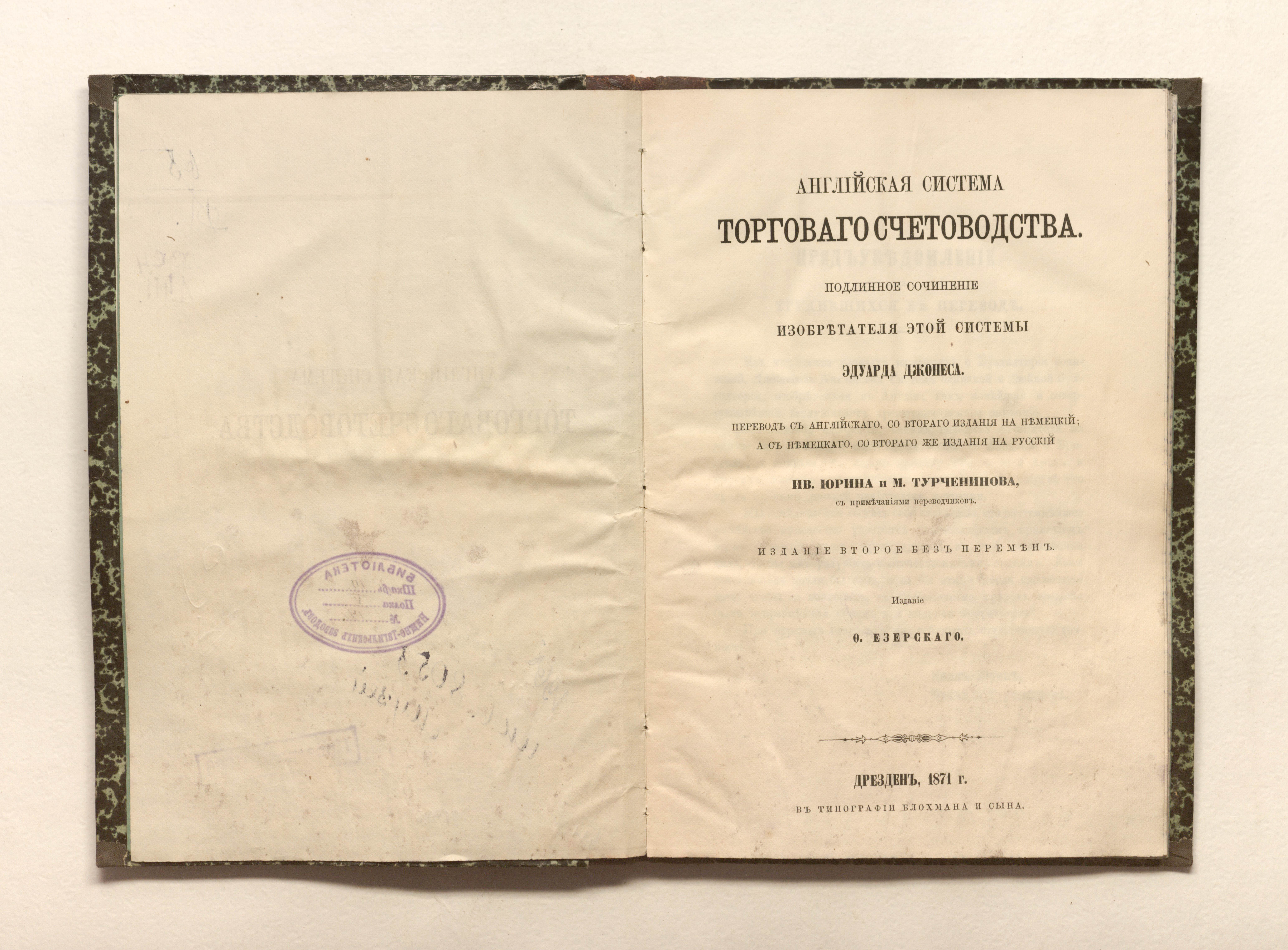 Английская система торговаго счетоводства : подлинное сочинение изобретателя этой системы Эдуарда Джонеса / перевод с английскаго, со втораго издания на немецкий, а с немецкаго, со втораго же издания на русский Ив. Юрина и М. Турченинова, с примечаниями переводчиков. — Изд. 2-е без перемен. — Дрезден : издание Ф. Езерскаго, 1871 (В тип. Блохмана и сына). — 76 с. ; 23,5х16 см.