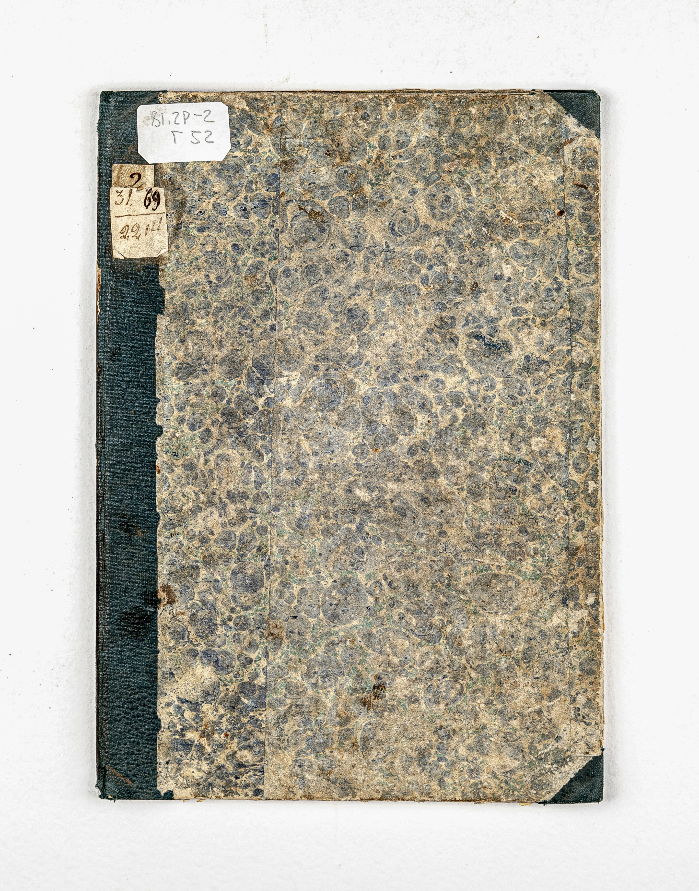 Книга в полутканевом владельческом переплете. Крышки переплета обтянуты бумагой с рисунком «под мрамор».