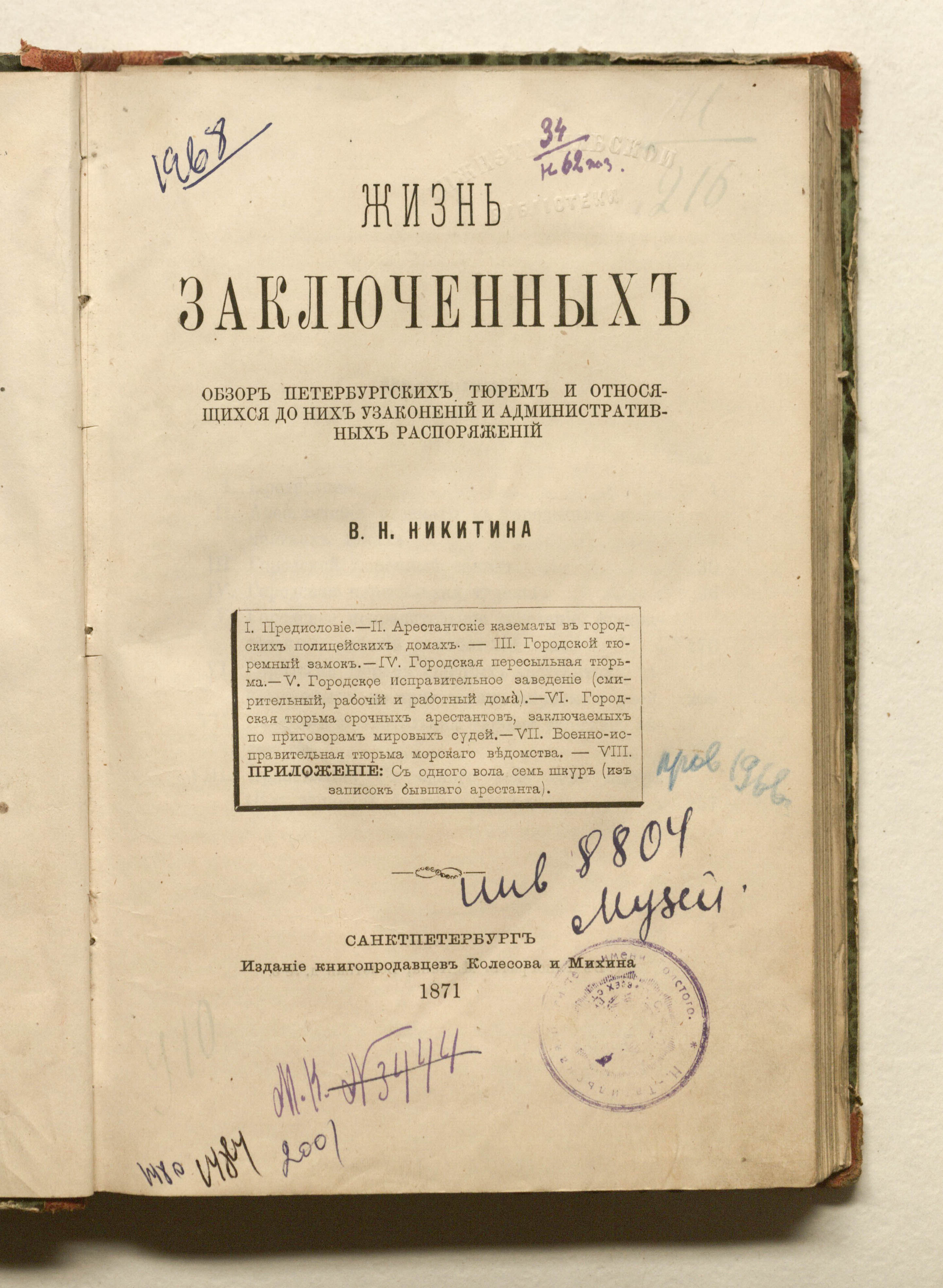 Жизнь заключенных : обзор петербургских тюрем и относящихся до них узаконений и административных распоряжений / [Соч.] В.Н. Никитина. — Санкт-Петербург : издание книгопродавцов Колесова и Михина, 1871. — [4], 300 с. ; 21,5х14 см.