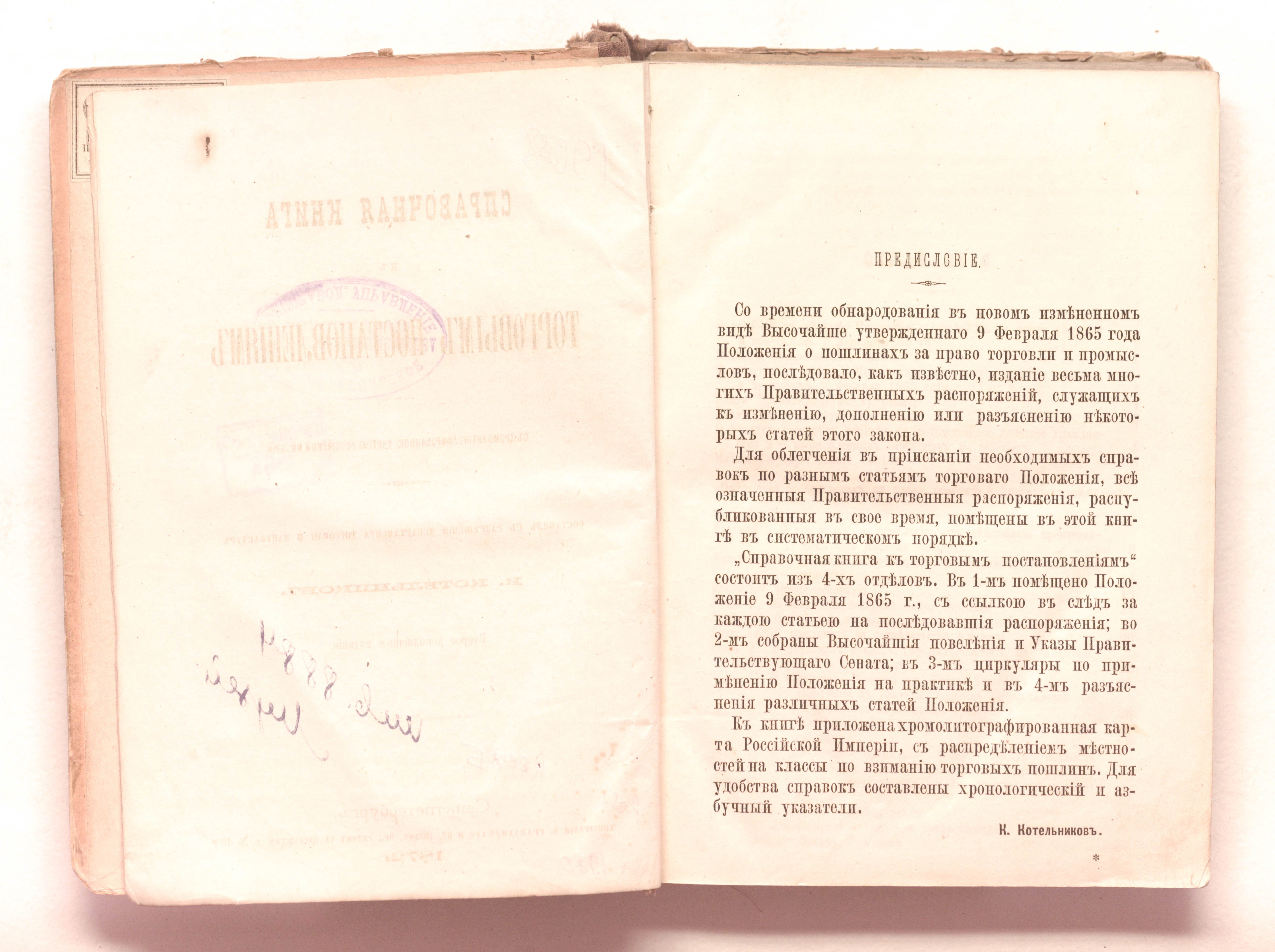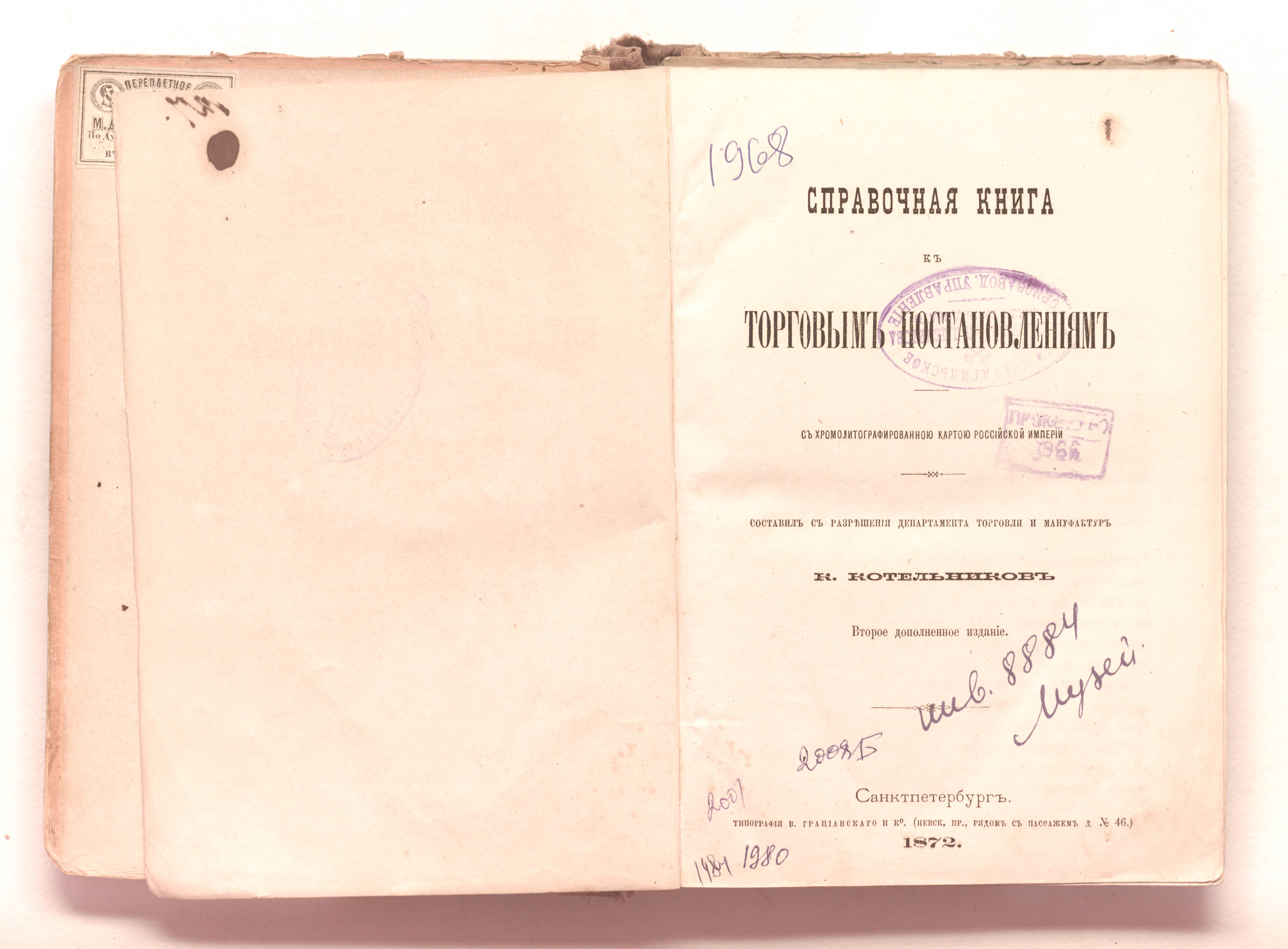 Справочная книга к торговым постановлениям с хромолитографированною картою Российской империи / составил с разрешения Департамента торговли и мануфактур К. Котельников. – 2-е изд., доп. – Санкт-Петербург : тип. В. Грацианскаго, 1872. – XVII, 353, [1] с. + 2 карты. – Хронологический указ.: с. 325-334. – Алф. указ.: с. 336-351. ; 21,5х16 см.