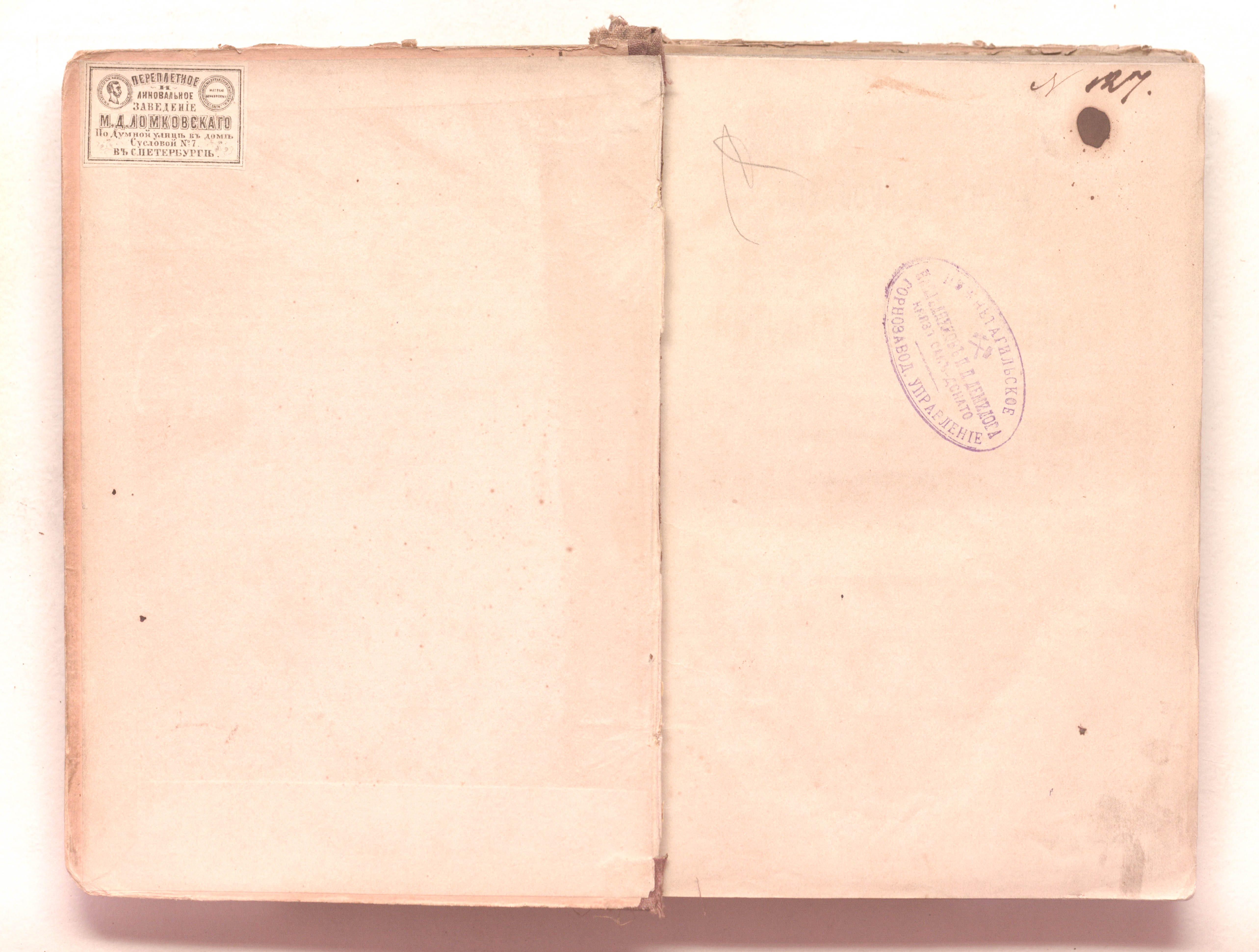 "Переплетное и линовальное заведение М. Д. Ломковскаго. По Думной улице в доме Сусловой № 7 в Санкт-Петербурге" (форзац).