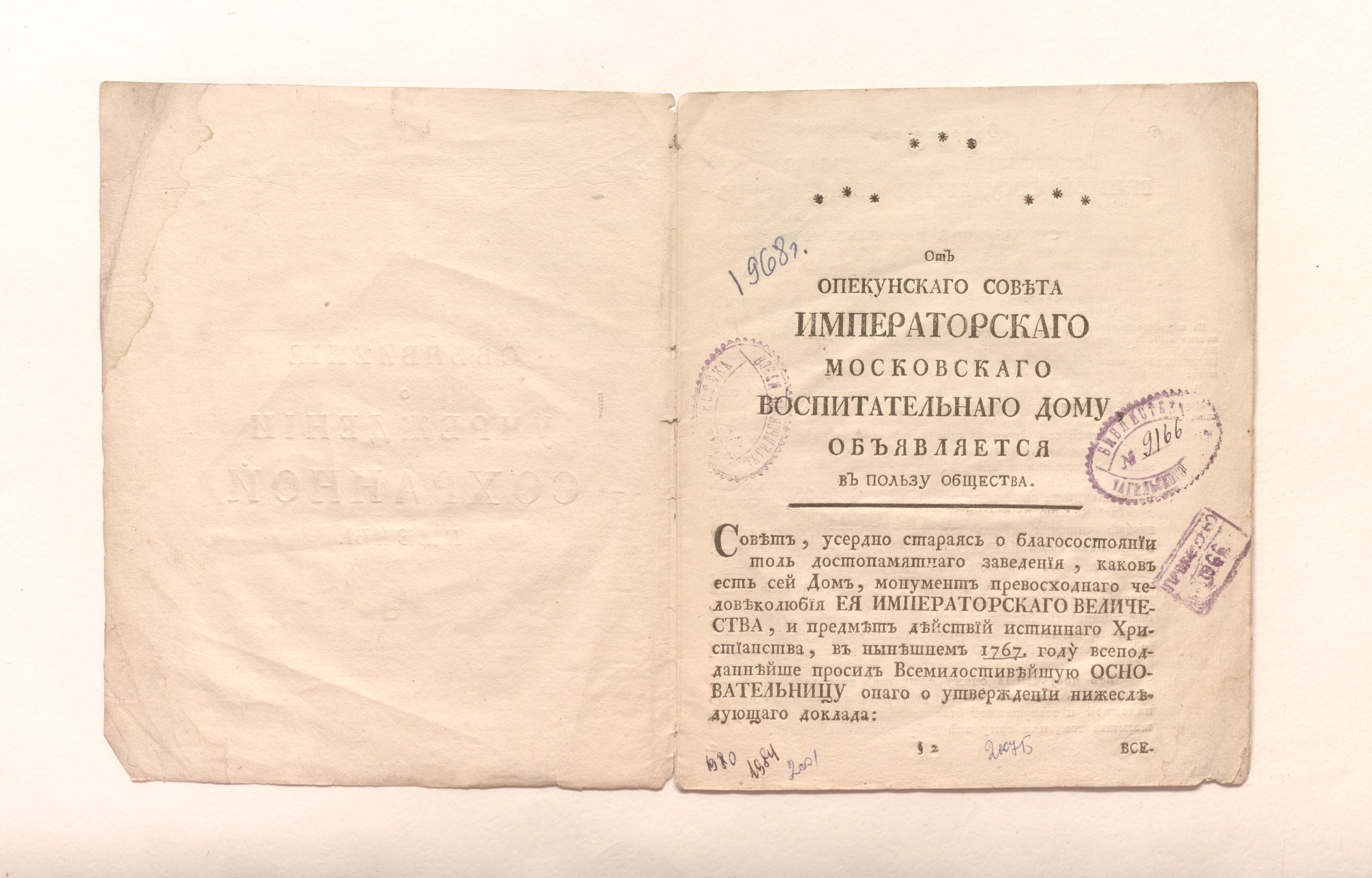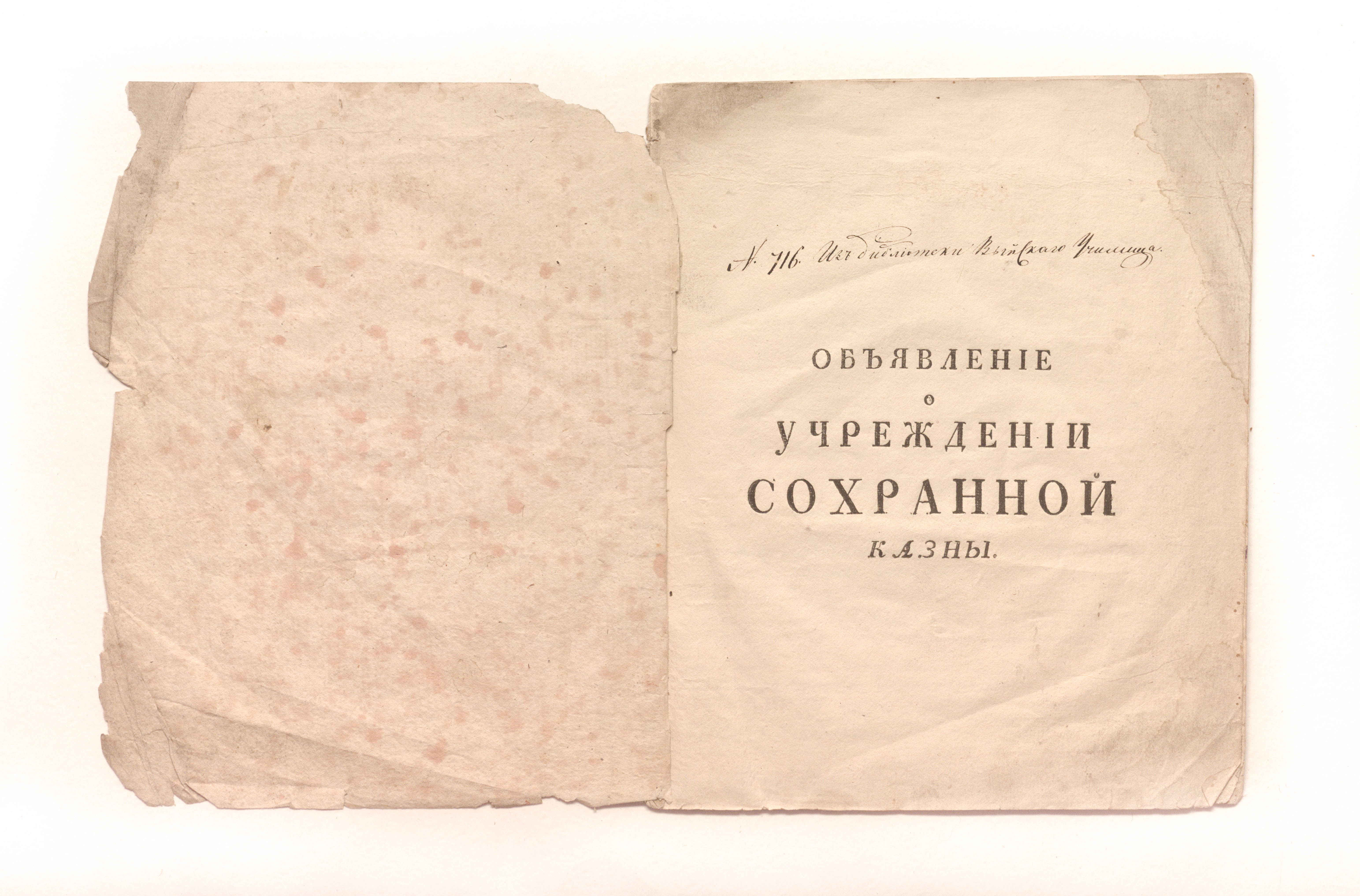 Объявление о учреждении сохранной казны / Московское присутствие. — Москва : Университетская типография, 1767. — 16 с. ; 20,5х16,5 см.