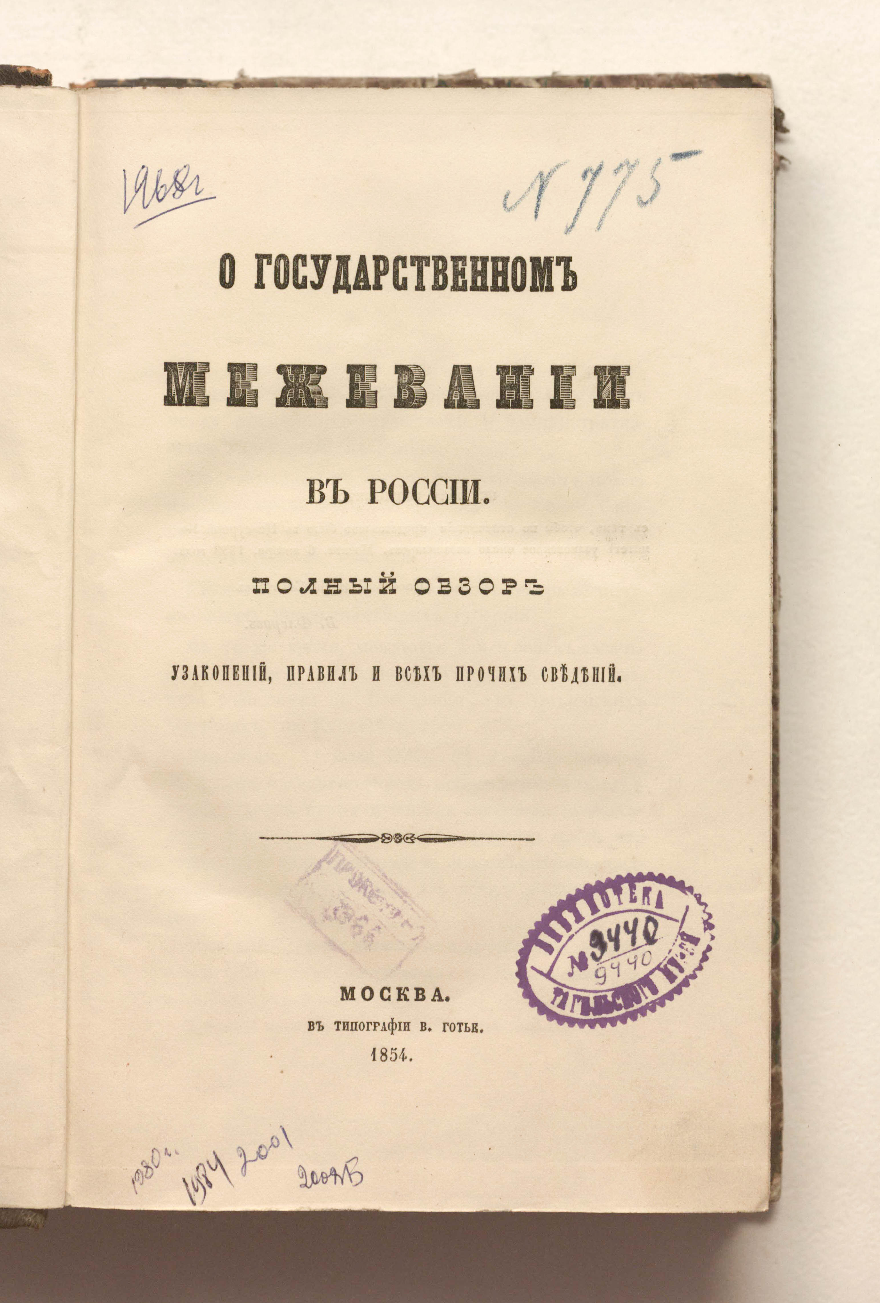 О государственном межевании в России : полный обзор узаконений, правил и всех прочих сведений / Н. А. Ермаков. — Москва : В тип. В. Готье, 1854. — [2], 365 с. : ил. ; 24,5х15,5 см.