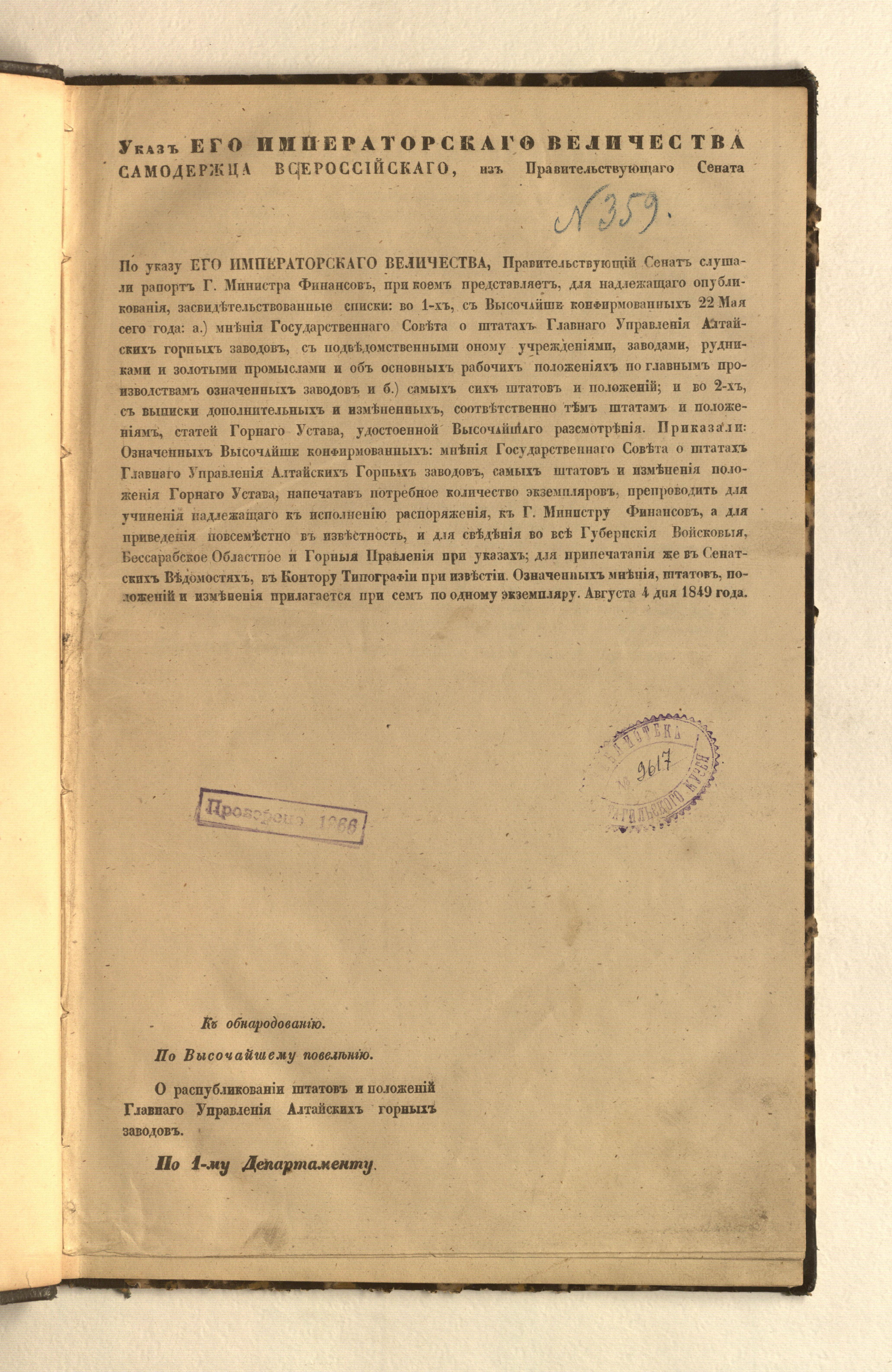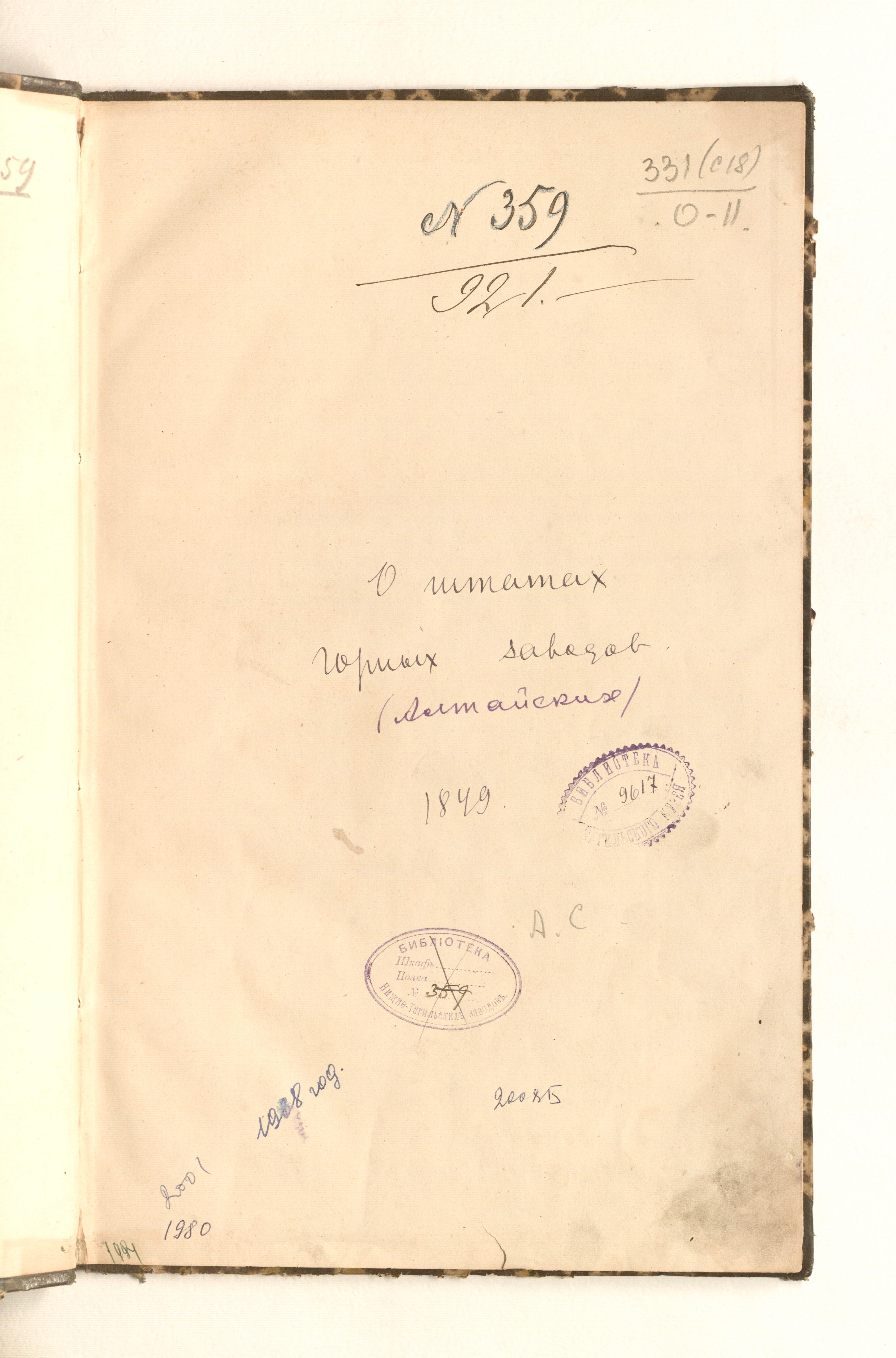 «Библиотека Нижне-Тагильских заводов. № 359» (форзац, с. 1).