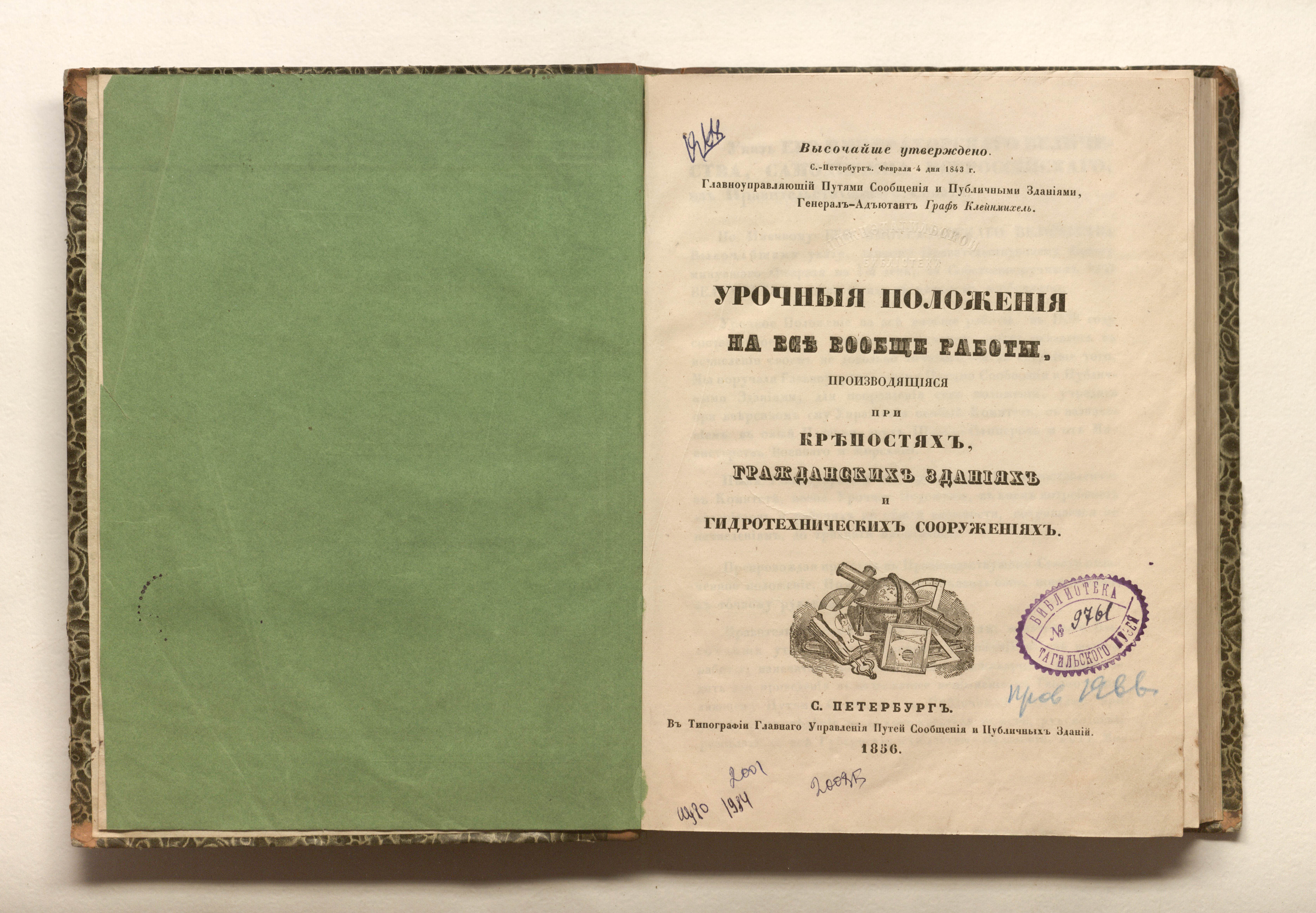 Урочные положения на все вообще работы, производящиеся при крепостях, гражданских зданиях и гидротехнических сооружениях : высочайше утверждено. С.-Петербург, февр. 4 дня 1843 г. — Санкт-Петербург : тип. Главного Управления путей сообщения и публичных зданий, 1856. — [8], 364 с. ; 24,5х18,8 см.