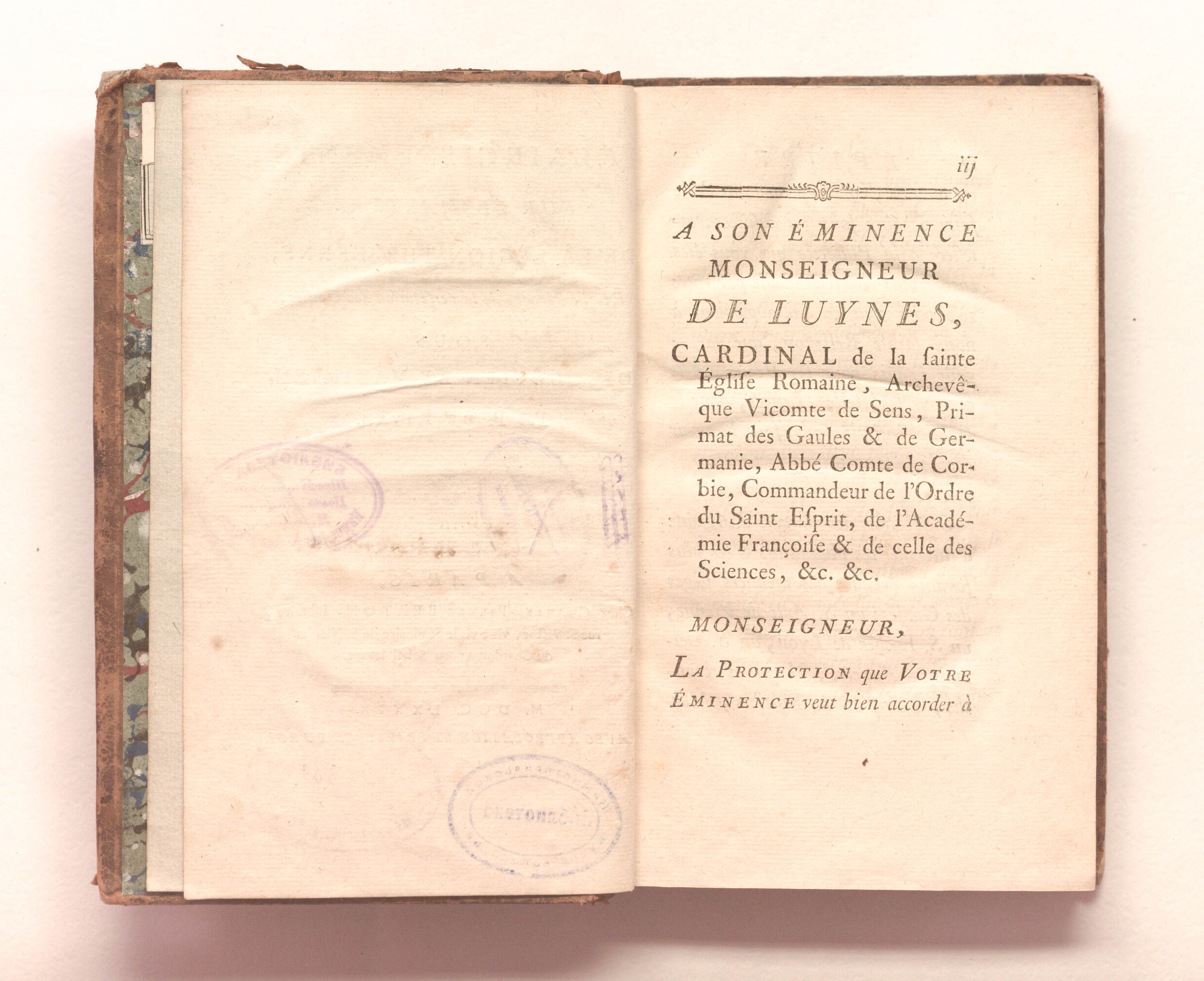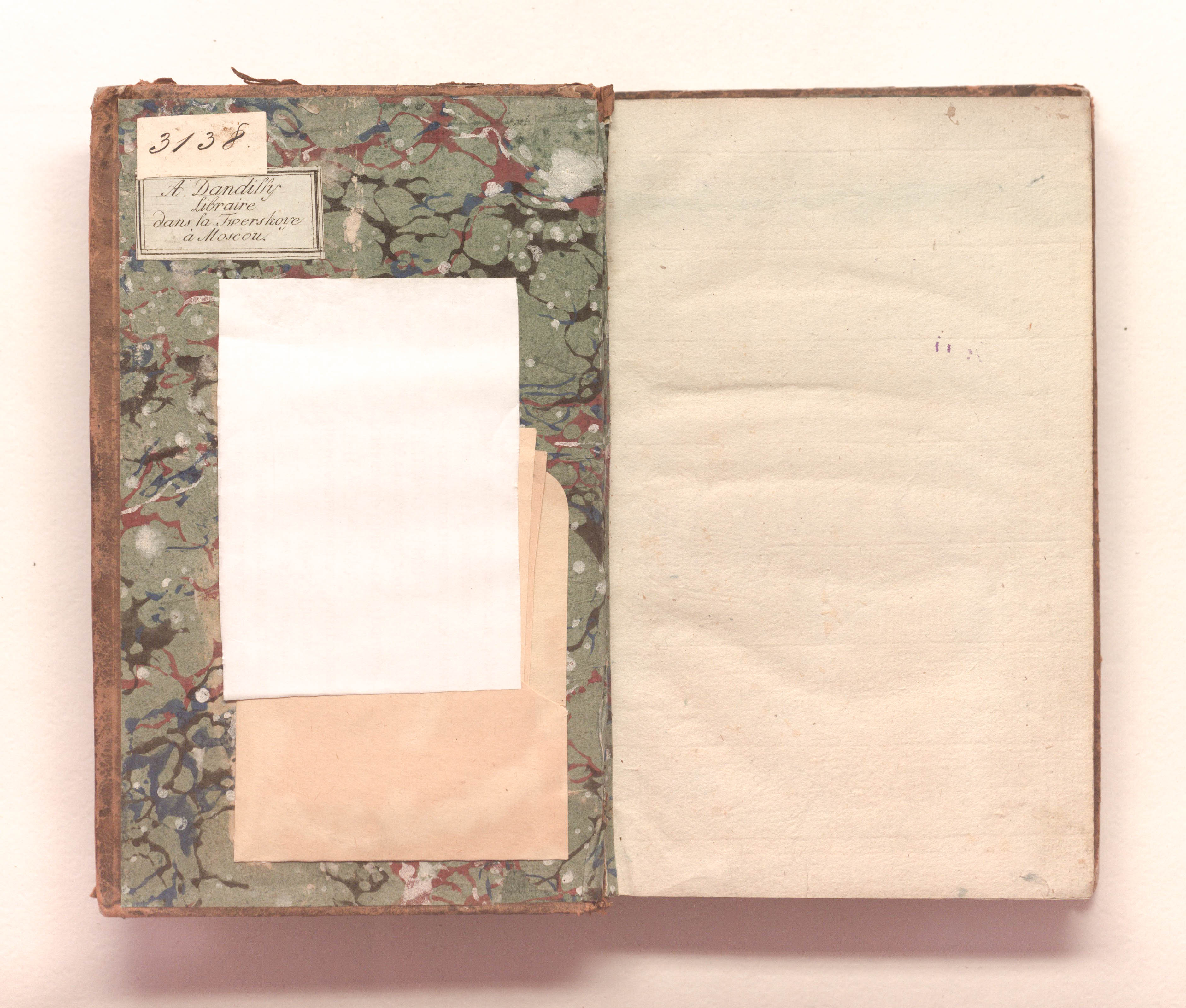 Книга в цельнокожаном владельческом переплете. На обороте передней сторонки бумажный ярлык "A.Dandilly, Libraire dans la Tverskoye a Moscou" [А.Дандийи, книгопродавец на Тверской в Москве] (4,5х2 см).