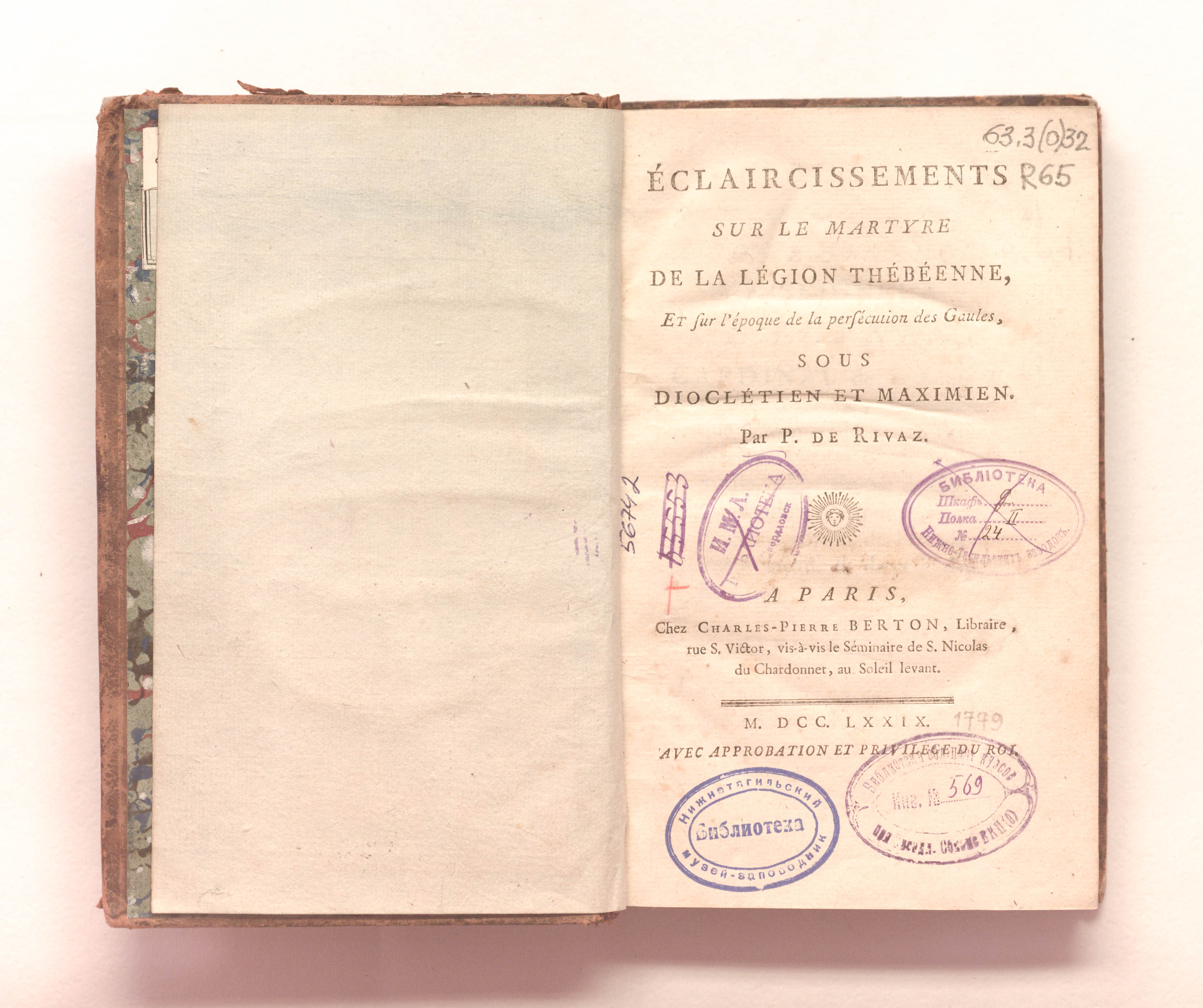 Eclaircissements sur le martyre de la legion Thebeenne,et sur l'epoque de la persecution des Gaules, sous Diocletien et Maximien. - Paris: Ch.-P. Berton, 1779. - XX, 368 p.; 13x21 cm.