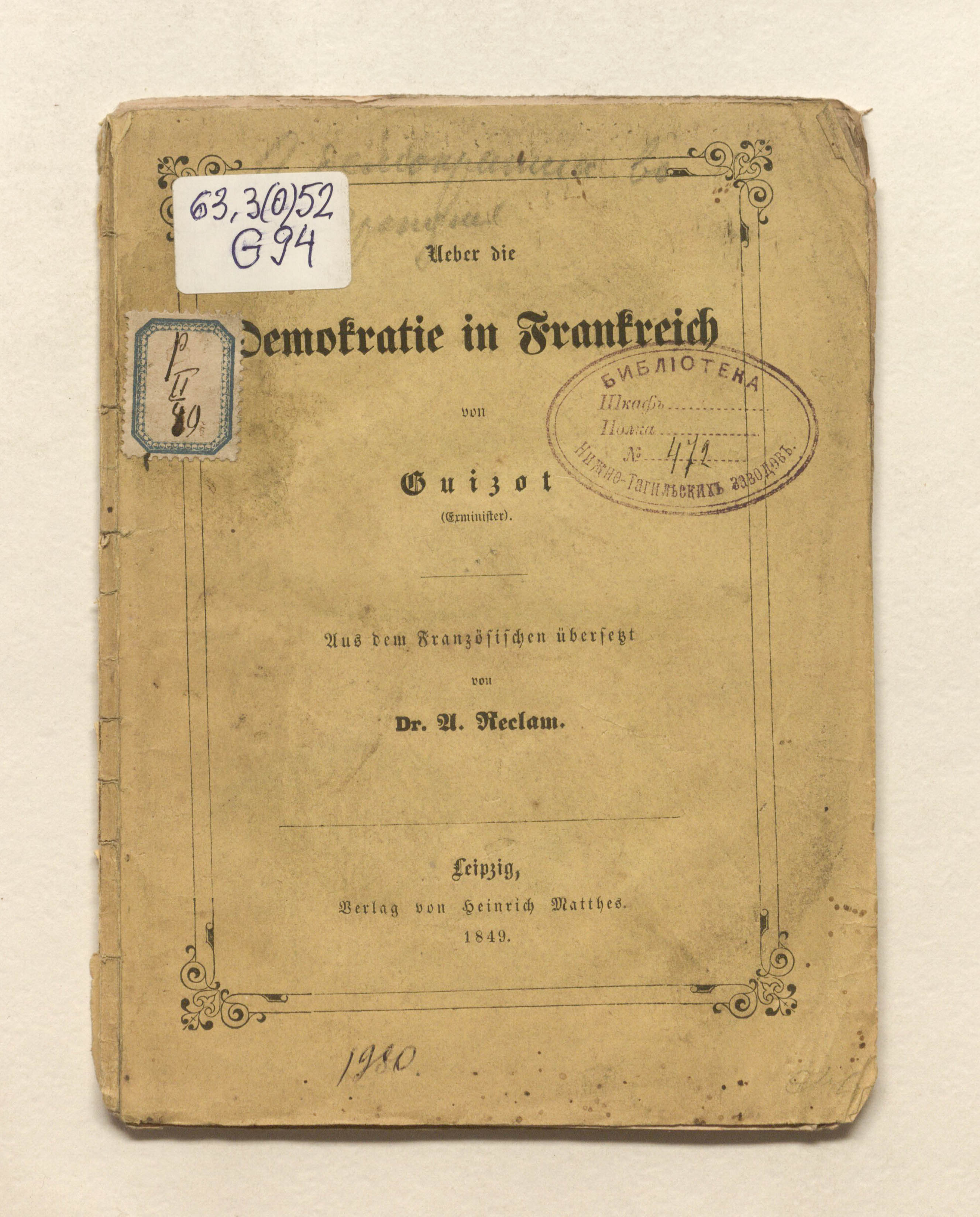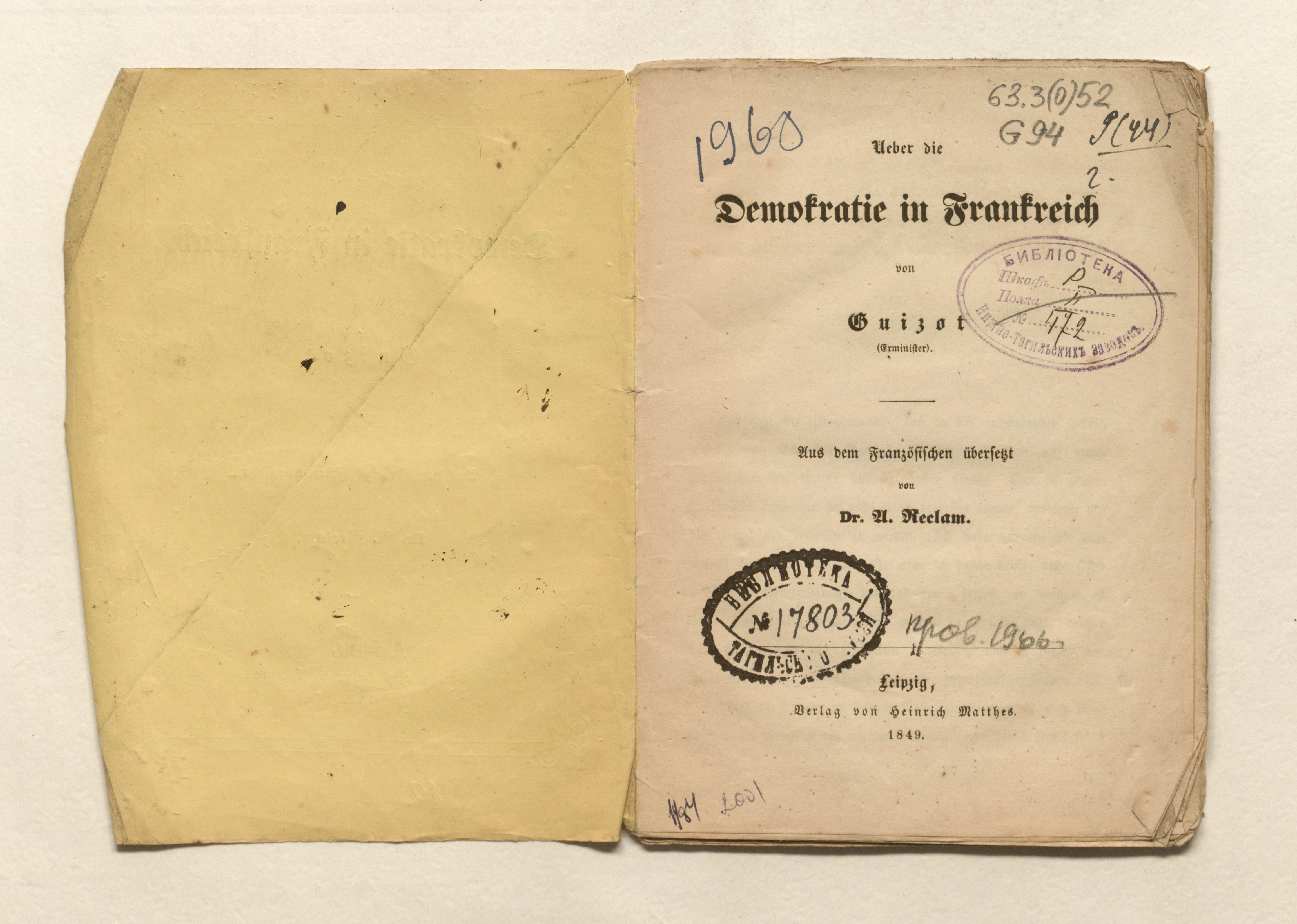 Ueber die Demokratie in Frankreich, von Guizot. Aus dem Franzoesischen uebersetzt von Dr. U. Reclam. – Leipzig : Matthes, 1849. – 61, [3] p. ; 13х17,5 cm.