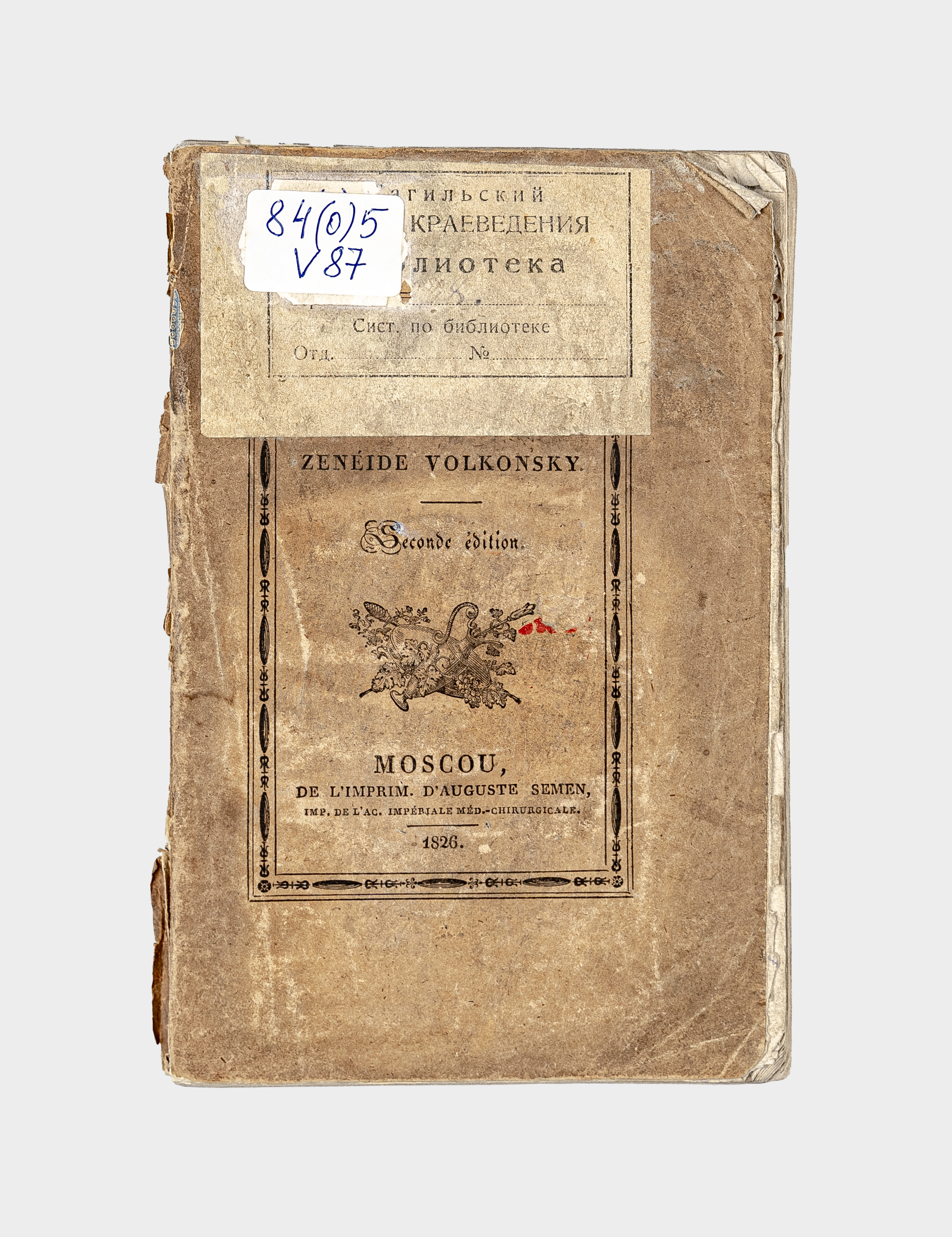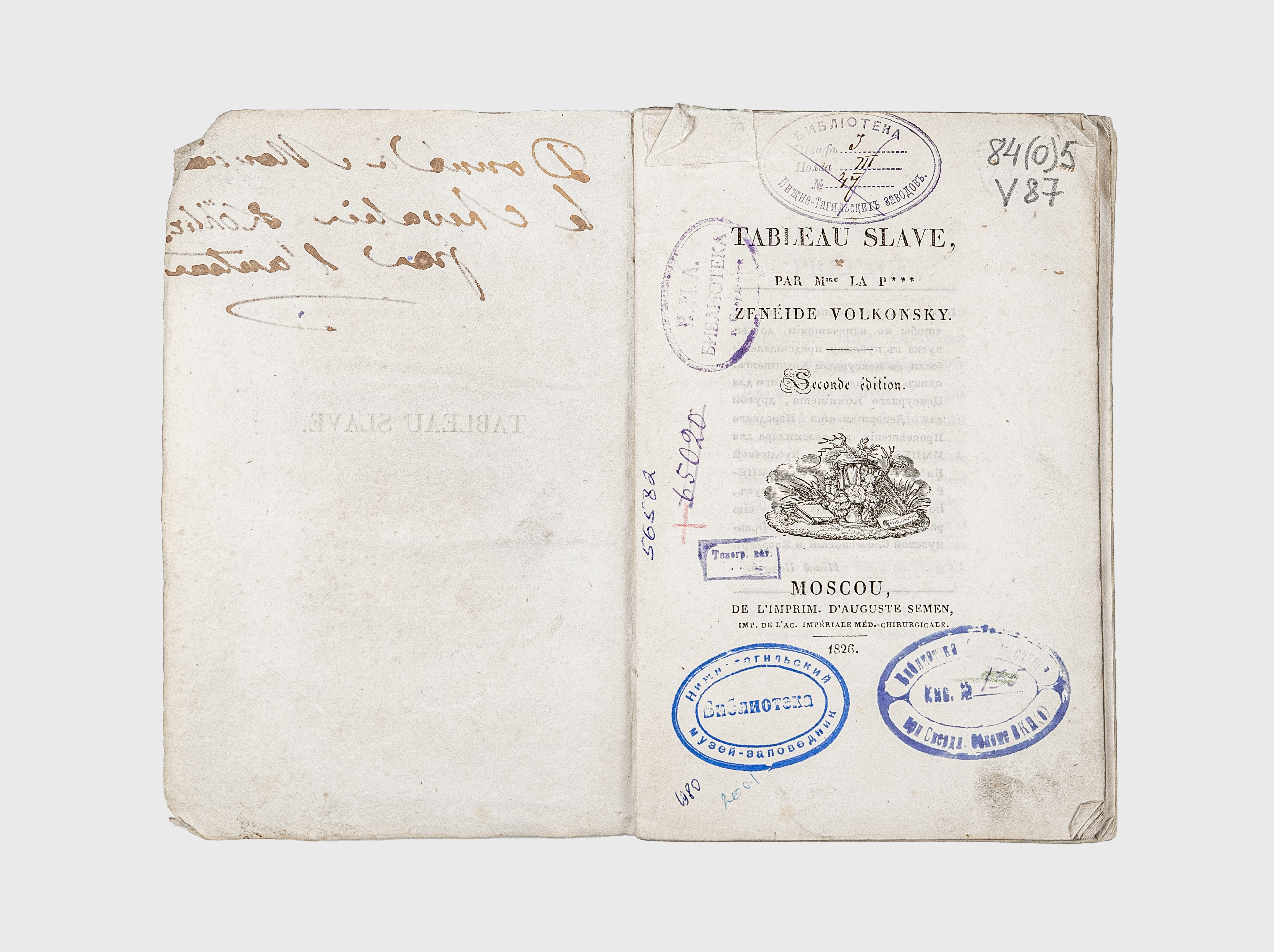 Volkonsky Zeneide Alexandrovna (1789-1862) Tableau Slave / Par Mme la P*** Zeneide Volkonsky. - 2-e ed. – Moscou : August Semen ; Impr. de l'Acad. Imp. med.-chirurg., 1826 – XII, 220 p. ; 18,5х11,5 cm.