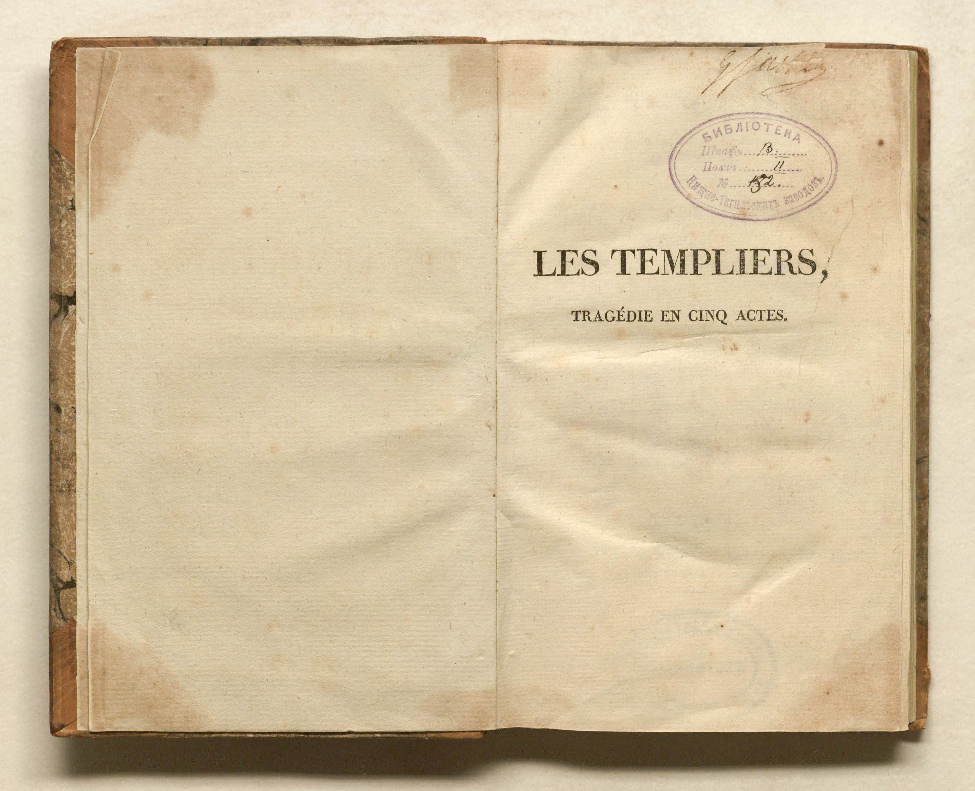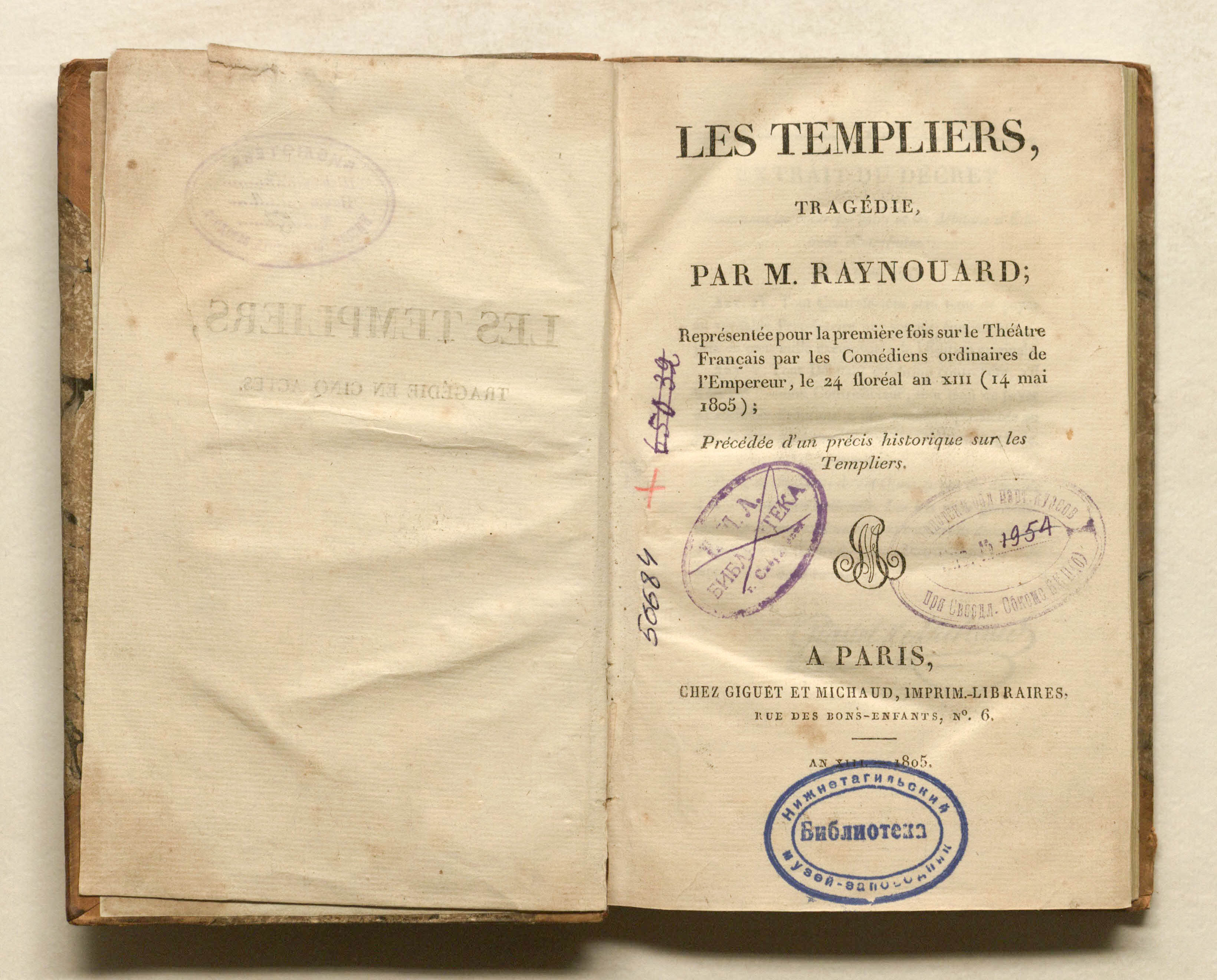 Тамплиеры, трагедия г-на Ренуара; впервые поставлена в Театр Франсе штатными актёрами императора 24 флореаля XIII года (14 мая 1805 года); предваряется историческим обзором о тамплиерах