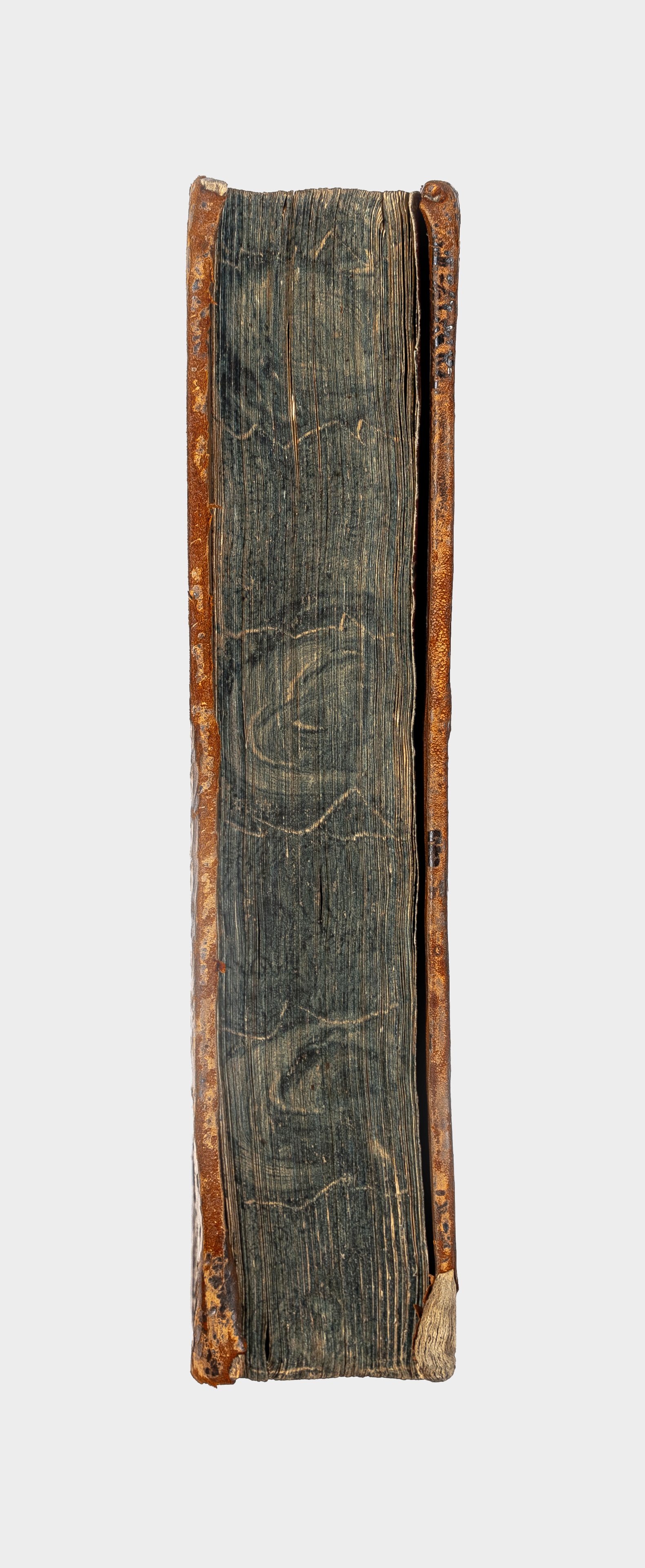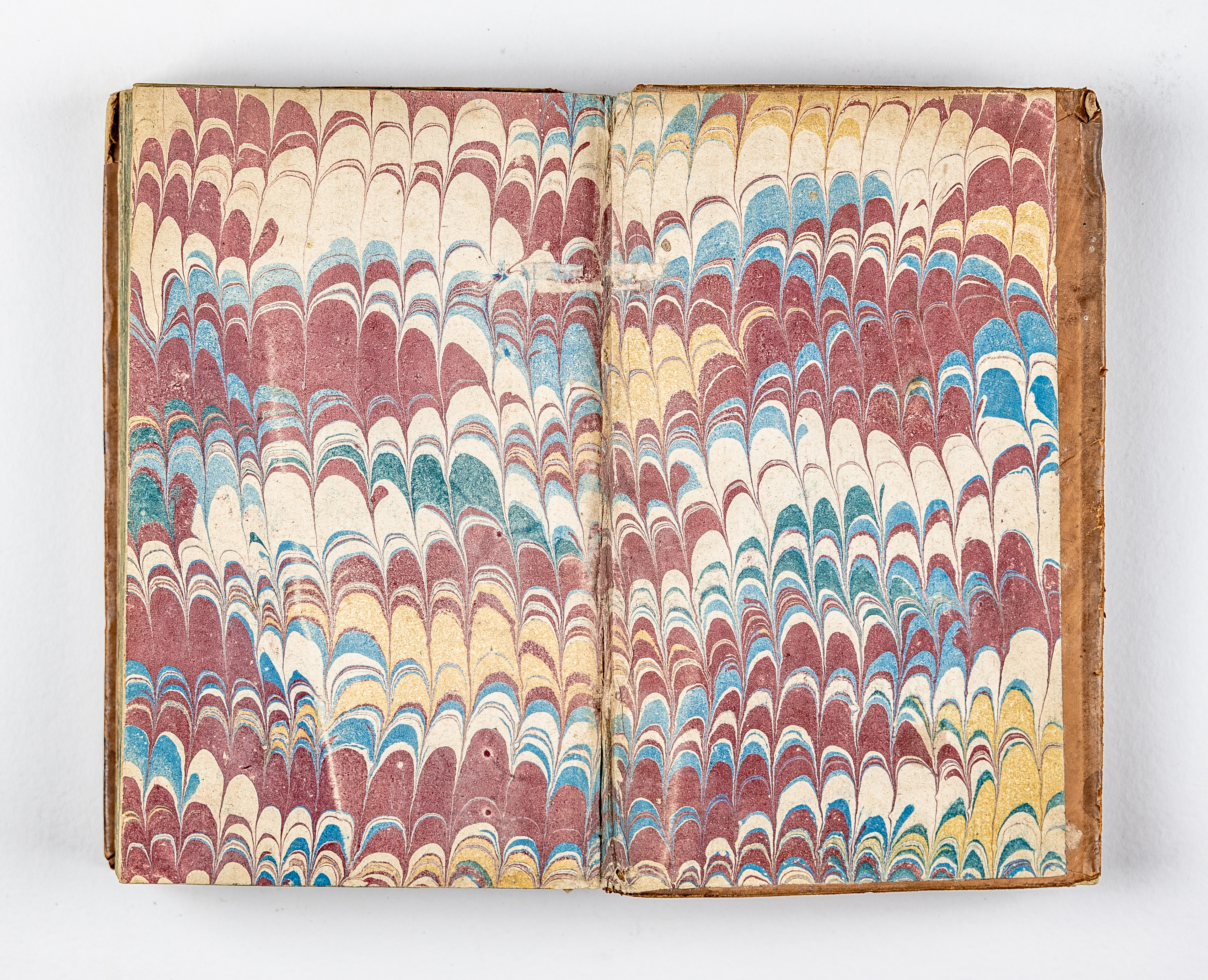 Книга в цельнокожанном владельческом переплете. Обрез тонированный. Бумага верже. Форзацы украшены бумагой с рисунком «павлинье перо».