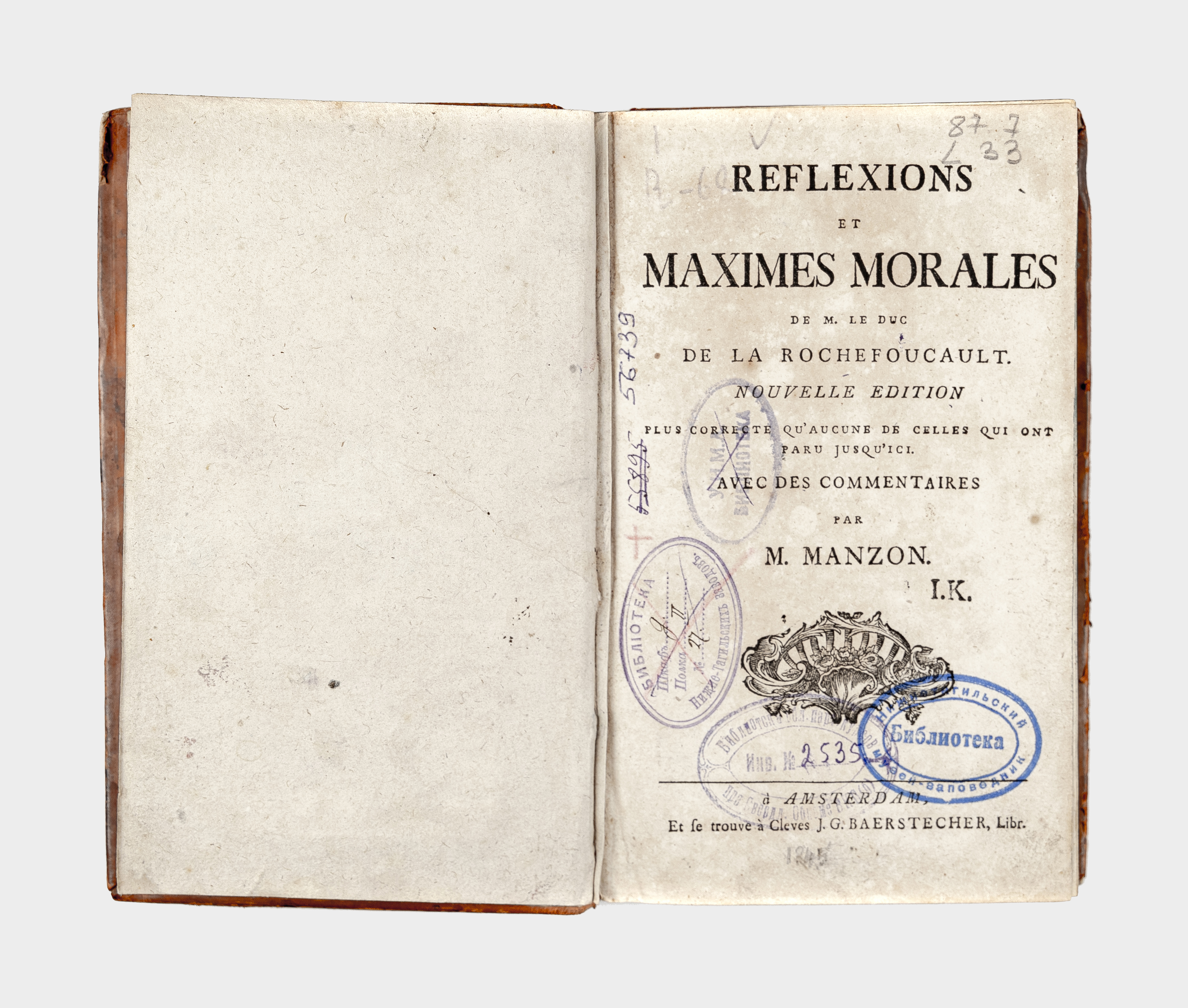 La Rochefoucauld, Francois de (1613-1680). Reflexions et maximes morales de M. le duc de La Rochefoucault sic / Francois de La Rochefoucauld. – Nouvelle edition... Avec des commentaires par M. Manzon. – Amsterdam : J. G. Baerstecher, [1772]. – 454 p. ; 19,5х12 cm.