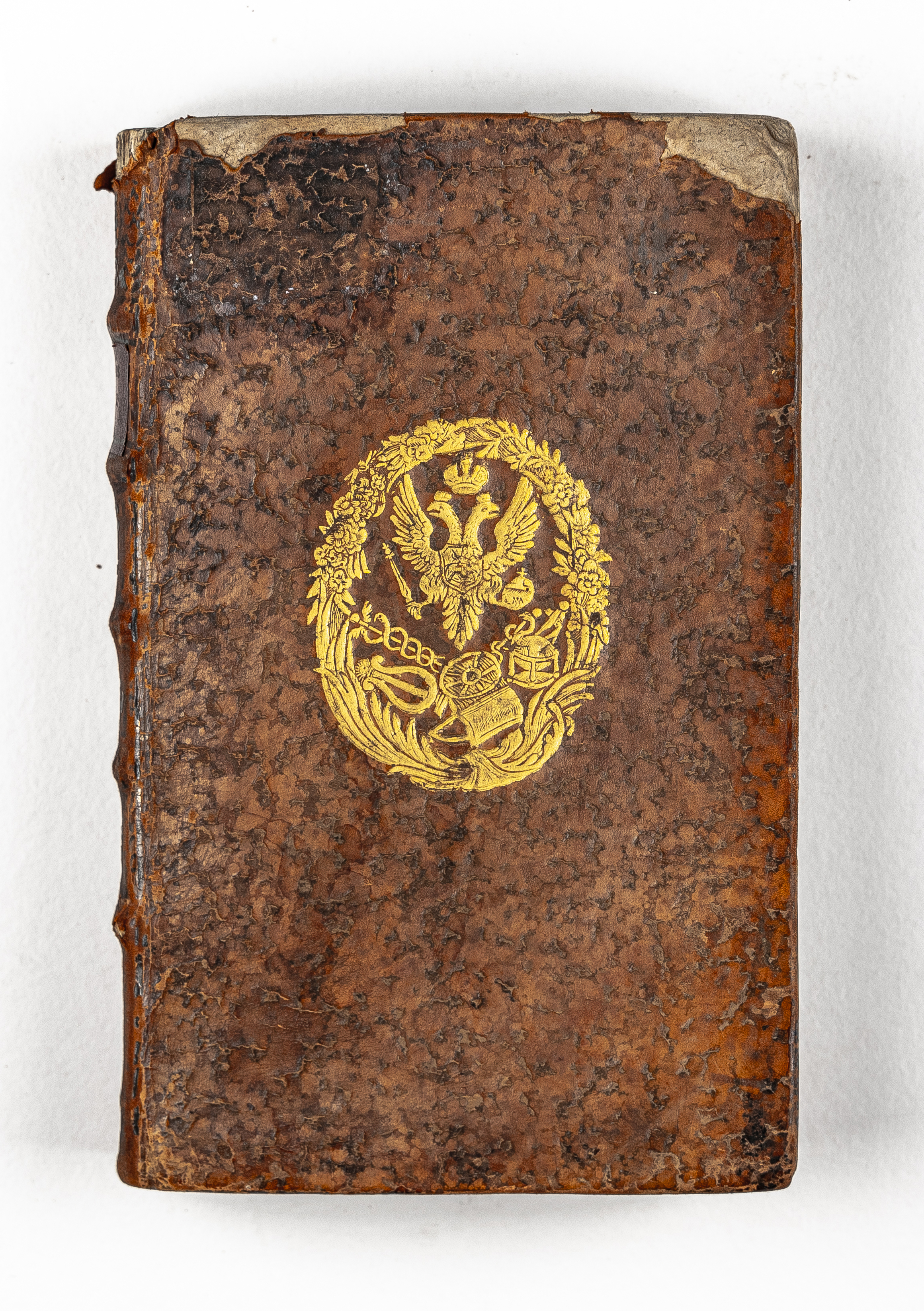 Золототисненый гербовый суперэкслибрис Московского университета 2-й пол. XVIII в. (передняя крышка перепл.);