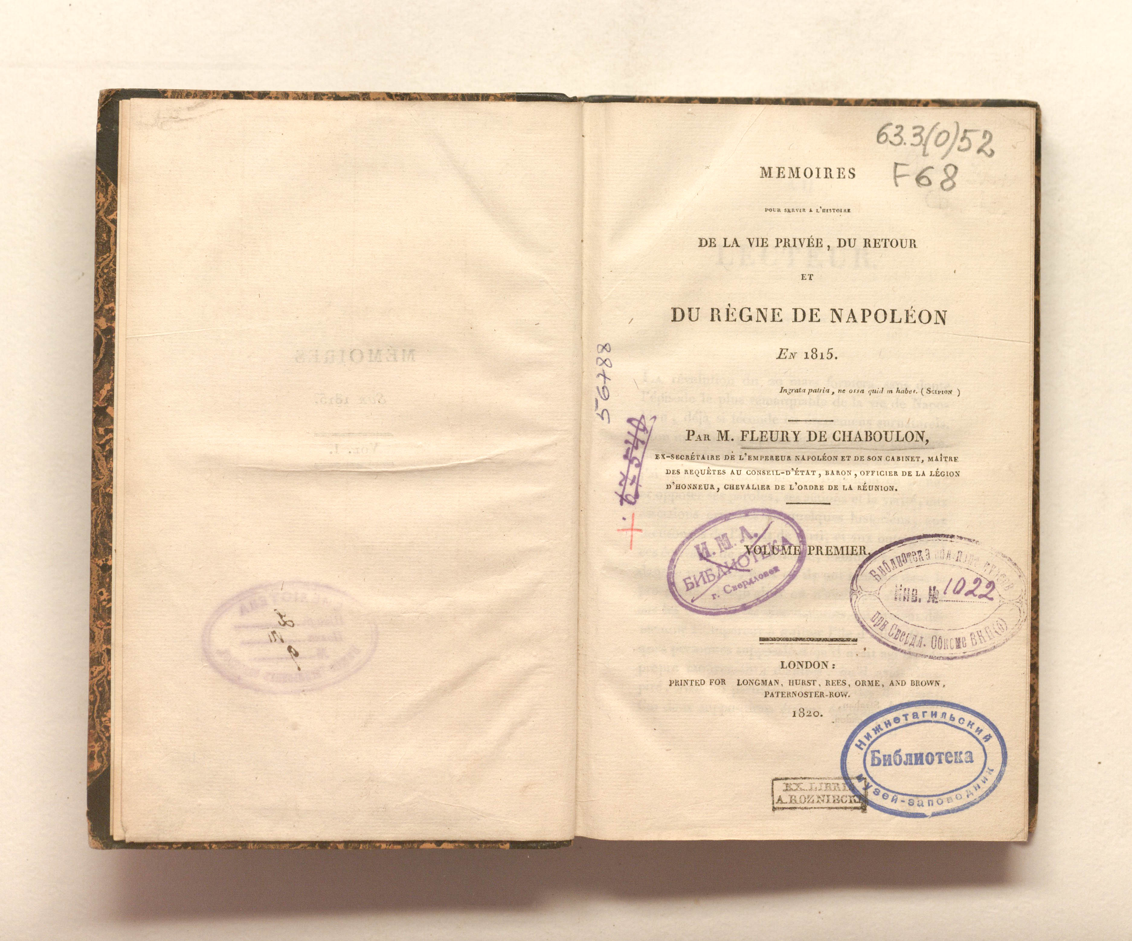 Fleury de Chaboulon, Pierre-Alexandre-Edouard (1779-1835). Memoires pour servir a l’histoire de la vie privee, du retour et du regne de Napoleon en 1815... Tome premier. - London : Longman, Hurst, Rees, Orme, and Brown, 1820. - XI, 420 p ; 12,5х20cm.