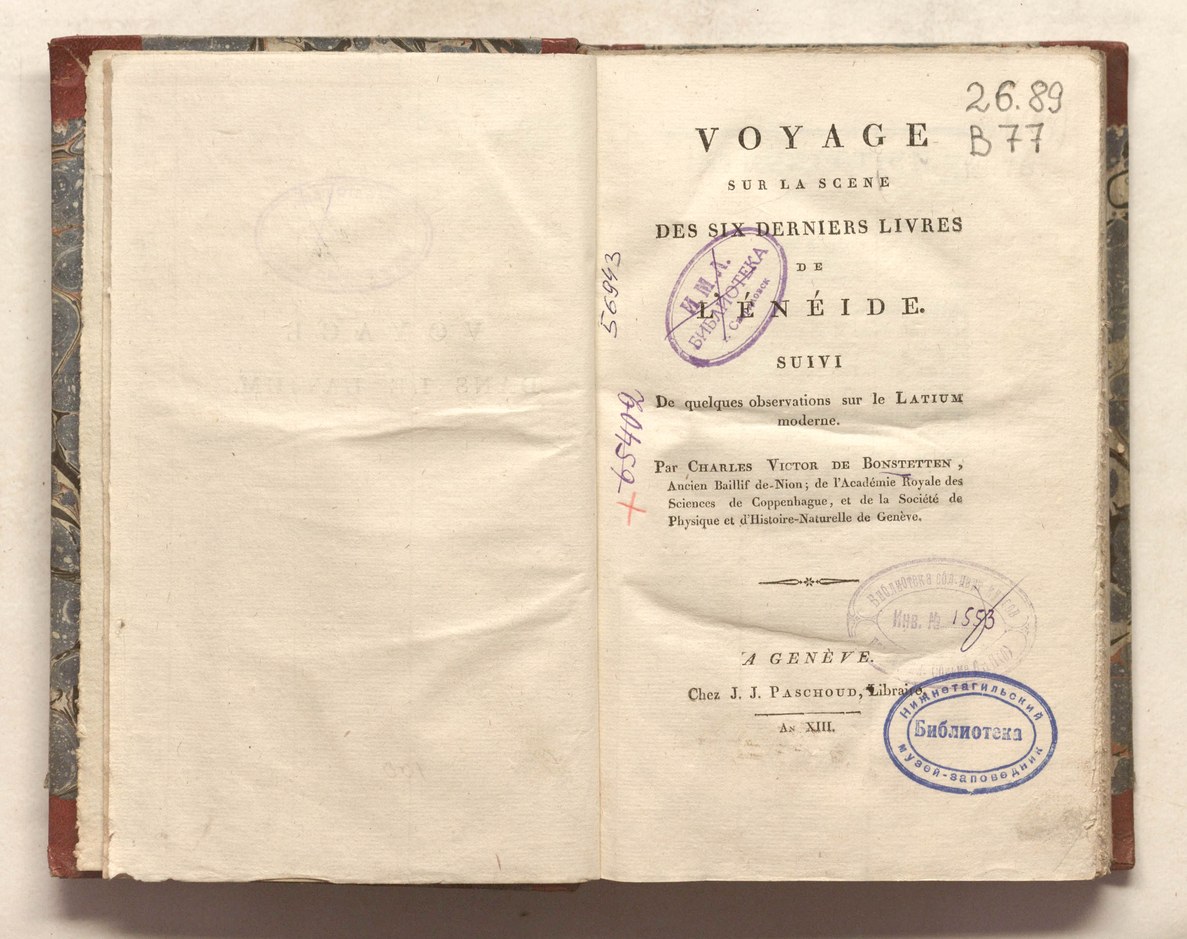 Путешествие по местам действия шести последних книг «Энеиды» ; с последующими наблюдениями о современном Лациуме. [Сочинение] Шарля Виктора де Бонштеттена. – Женева : Пашу, Год XIII (1805). – 380 стр.: карта. ; 14x22 см.