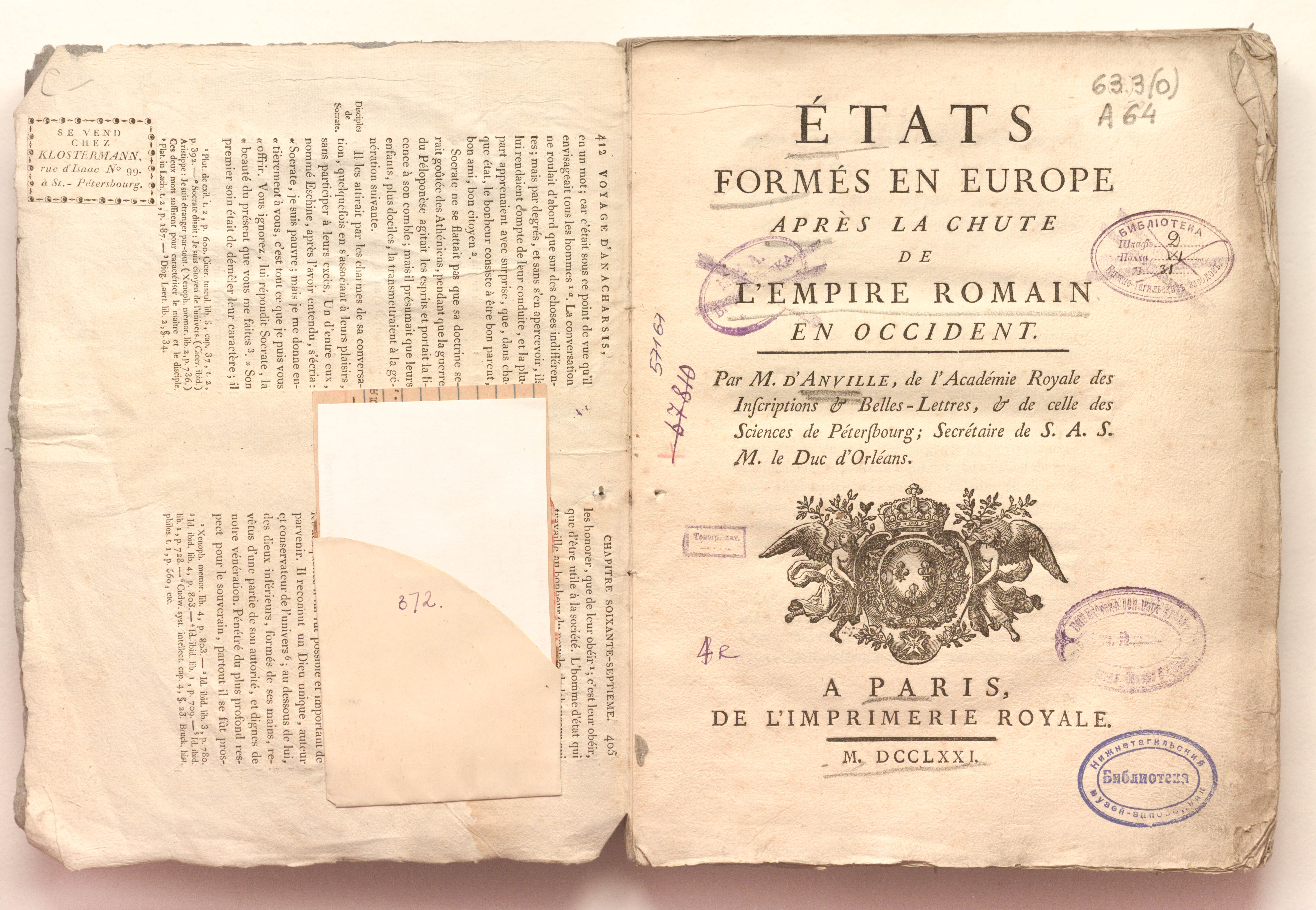 Anville, Jean Baptiste Bourguignon d' (1697—1782). Etats formes en Europe apres la chute de l'Empire Romain en Occident , par M. d'Anville, de l’Academie Royale des Inscription et Belles-Lettres, et de celle des Sciences de Petersbourg; Secretaire de S.A.S. M. le Duc d’Orleans. - Paris : Impr. royale, 1771. – VIII, 269 p. ; 26,5x20,5 cm.
