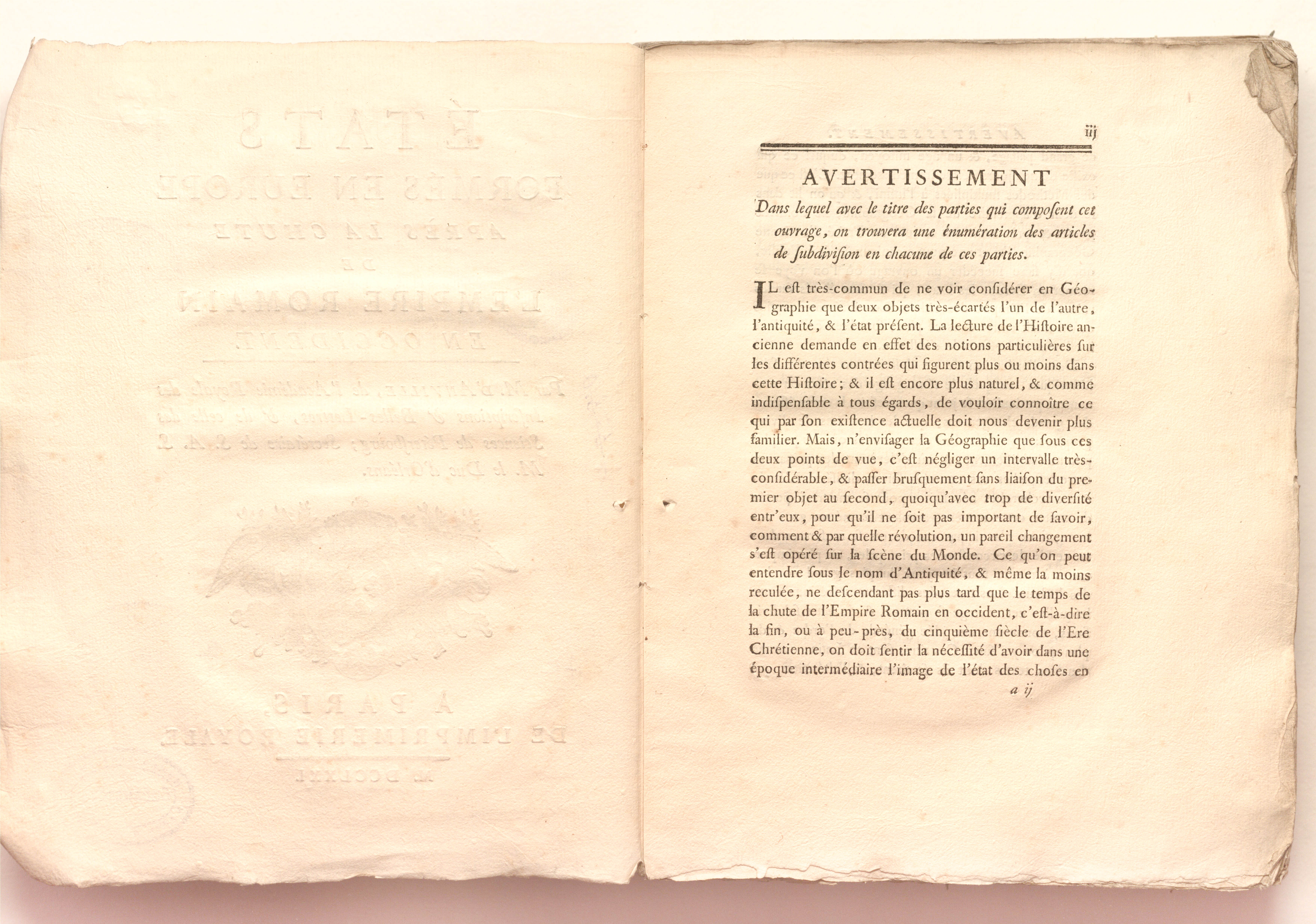 Etats formes en Europe apres la chute de l'Empire Romain en Occident , par M. d'Anville, de l’Academie Royale des Inscription et Belles-Lettres, et de celle des Sciences de Petersbourg; Secretaire de S.A.S. M. le Duc d’Orleans